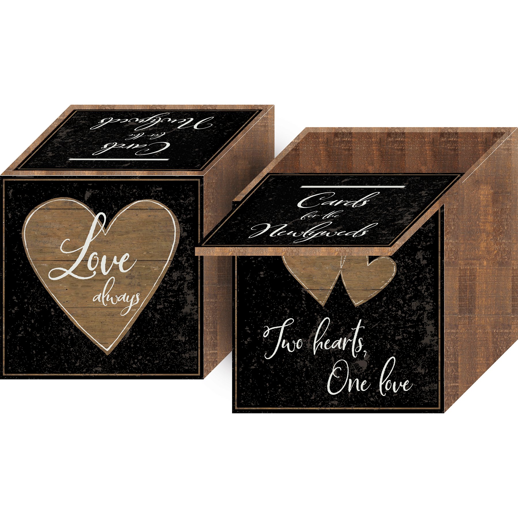 A double-sided wooden card box featuring rustic heart designs with "Two Hearts, One Love," "Love Always," and "Cards for the Newlyweds" sentiments. Box includes removable lid that features a slot so wedding guests can drop cards into the box. Lid slides out to remove cards from box.
