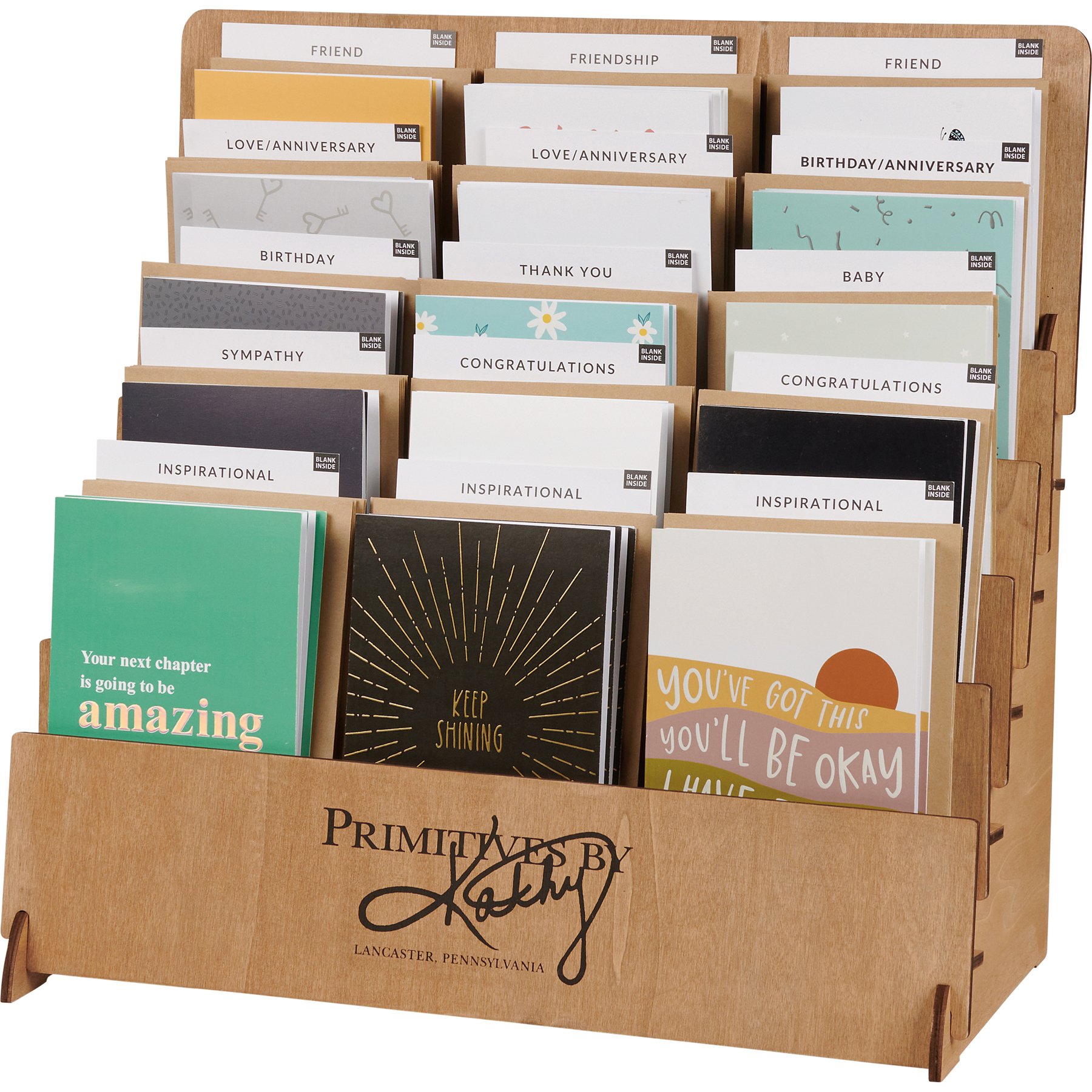 A natural wood card display perfect for our collection of Everyday or Trash Talk Greeting Cards. Easily showcase greeting cards in one of our card displays that highlights up to 15 different designs and approximately 90 cards in total. For convenience, greeting card options include a reorder card for display. Our Greeting Cards card display comes packaged flat in polybag with instructions included; assembly required. We are certain that our cards will catch your customers' eyes, and they will be just as excited to discover them as they will be giving them to someone special. Receive a free Card Display with the purchase of a greeting card Quick Pick Kit!