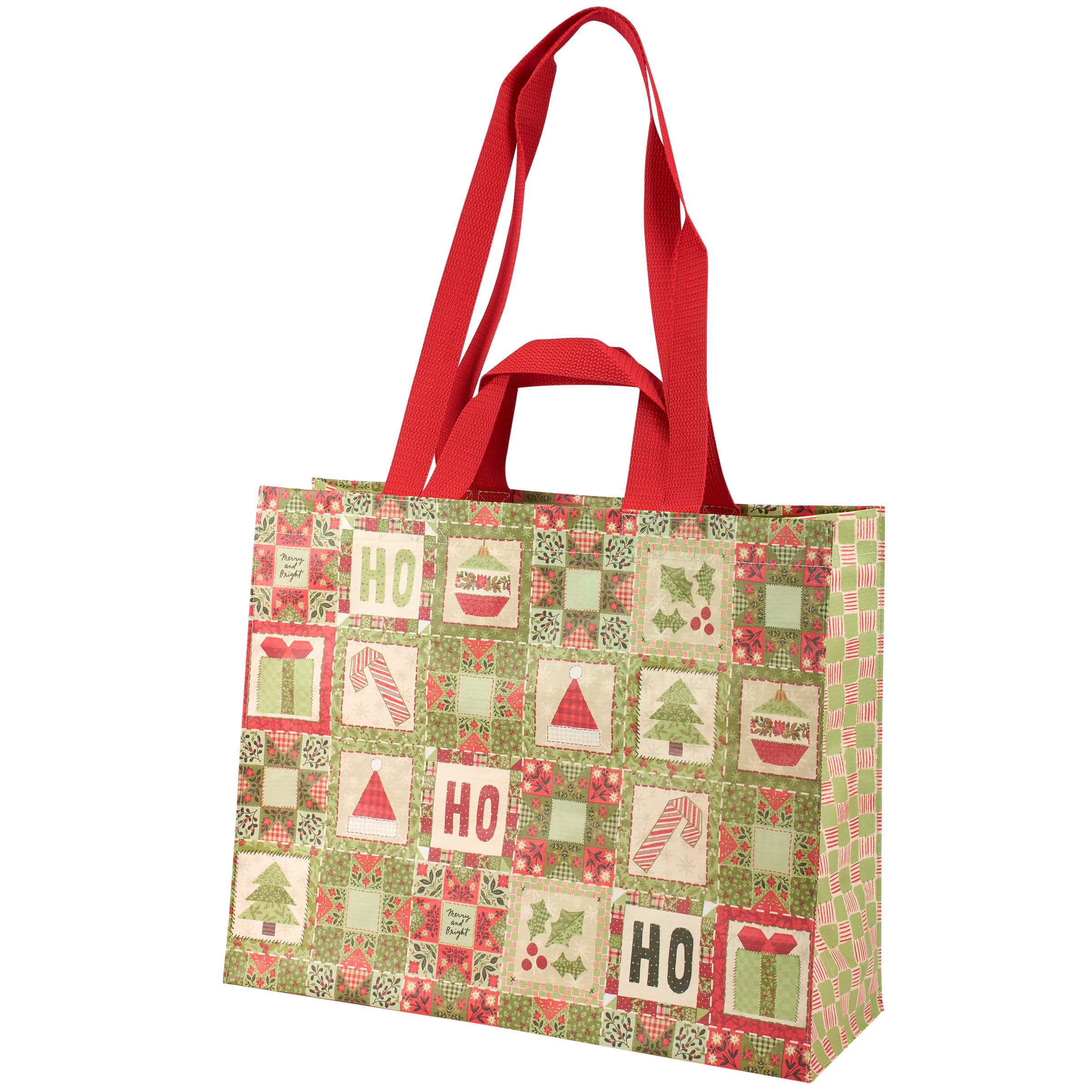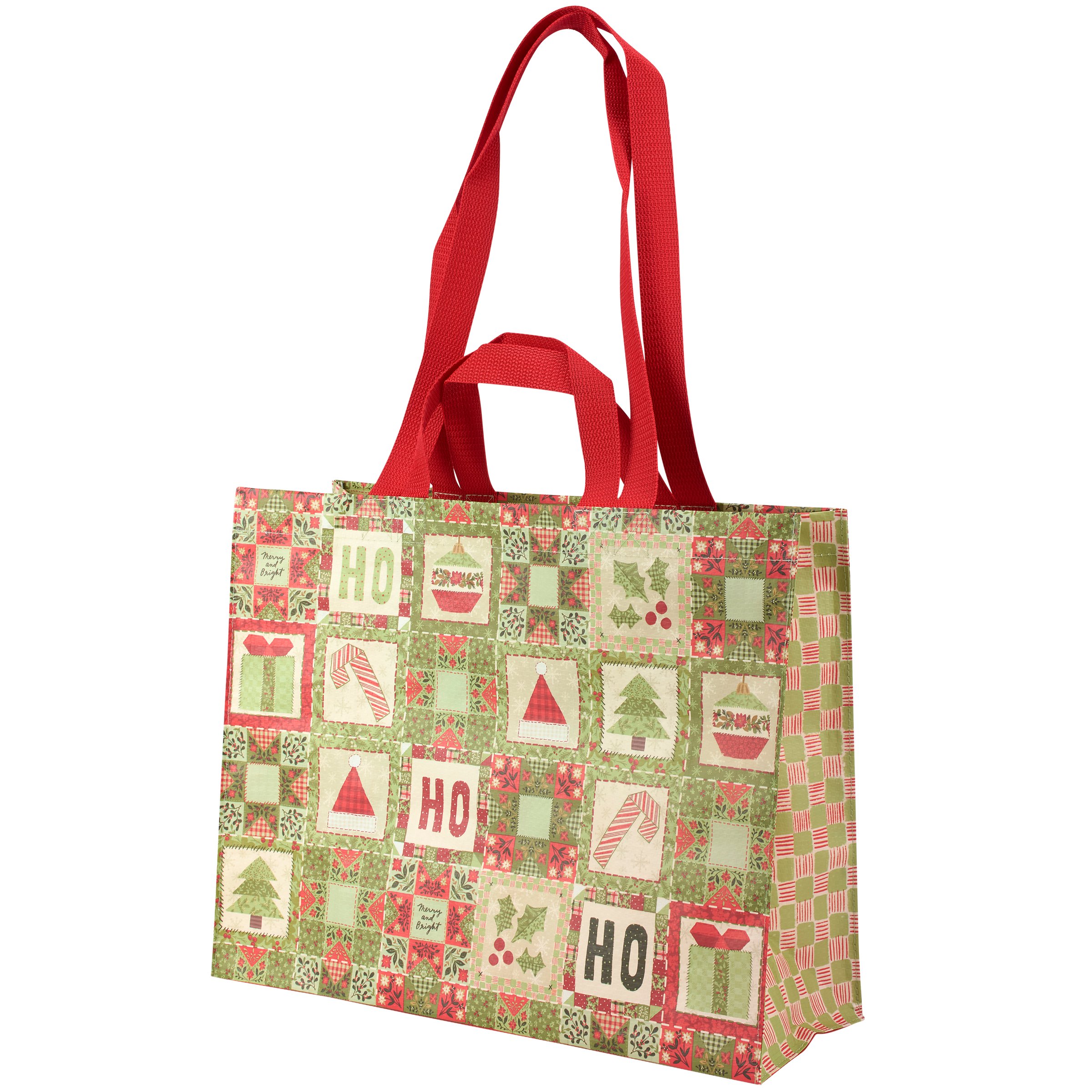 A carryall tote from our Craft Christmas Collection featuring a double-sided design displaying a craft inspired pattern of Christmas quilt patches. Christmas quilt design is replicated from original art hand painted in a unique watercolor style. Seasonal tote displays a coordinating check pattern with a holiday color palette on the gussets and includes both hand and shoulder straps in red nylon. Our Christmas Quilt tote bag is made from eco-friendly post-consumer material and folds flat for easy storage. A craft themed Christmas tote perfect for a seasonal accessory and great for reusable gift wrapping.