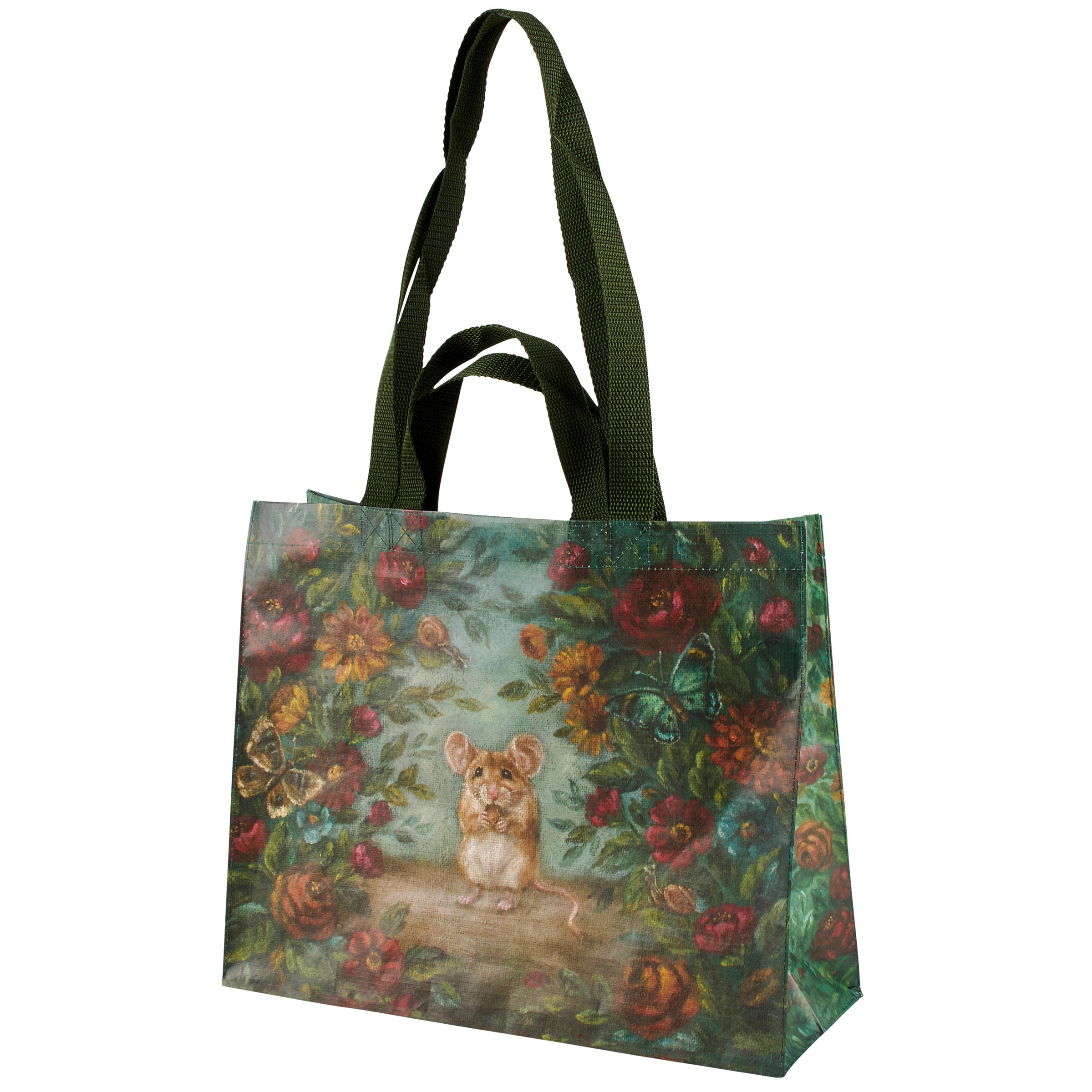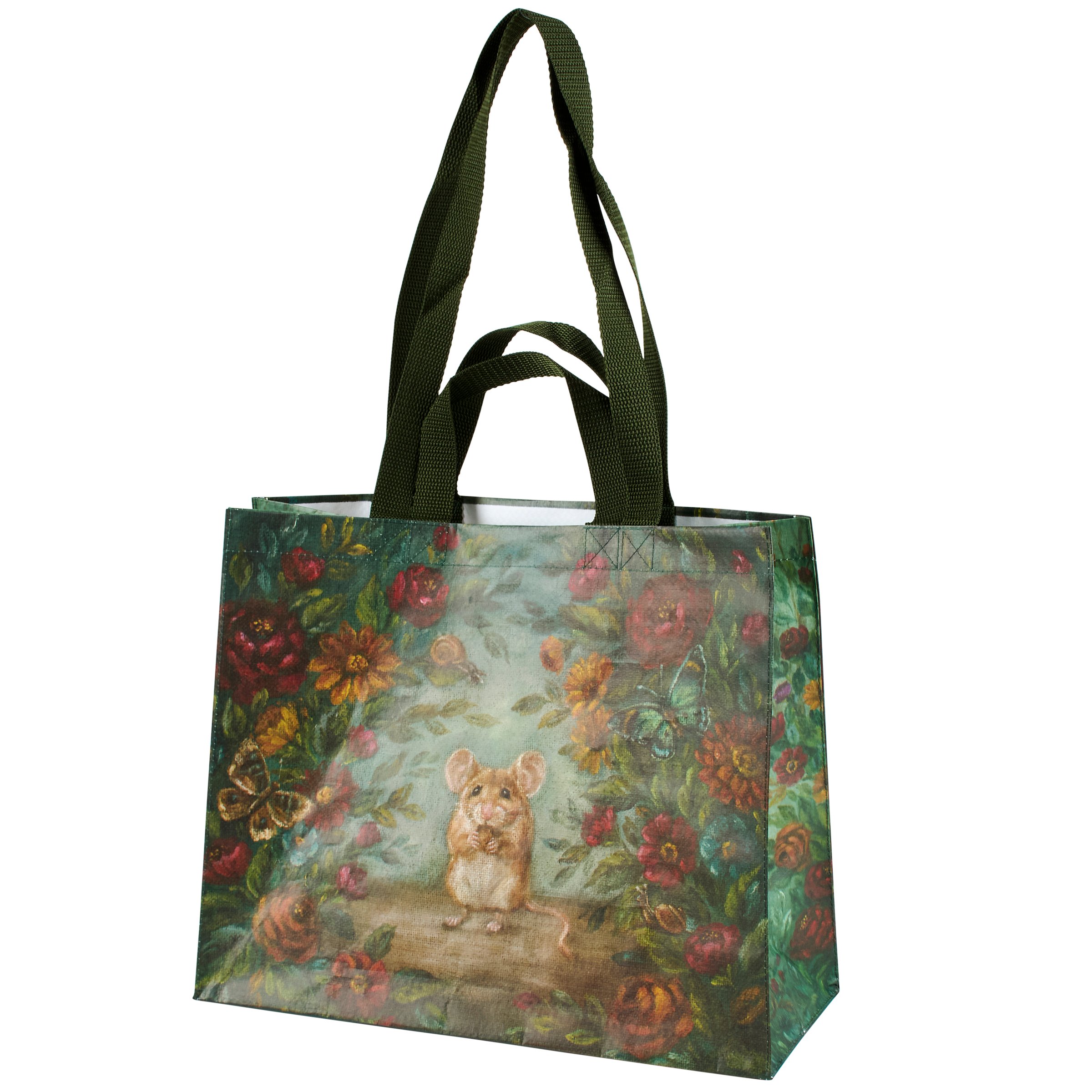 A carryall tote from our Jewel Tone Fall Collection featuring a double-sided design displaying a charming scene of a field mouse surrounded by fall florals in a jewel tone color palette. Fall mouse design is replicated from original artwork painted onto burlap canvas, giving the art a unique depth and texture. Seasonal tote displays a coordinating pattern of fall florals on the gussets and includes both hand and shoulder straps in dark green nylon. Our Field Mouse tote bag is made from eco-friendly post-consumer material and folds flat for easy storage. A jewel tone fall tote perfect for a seasonal accessory and great for reusable gift wrapping.