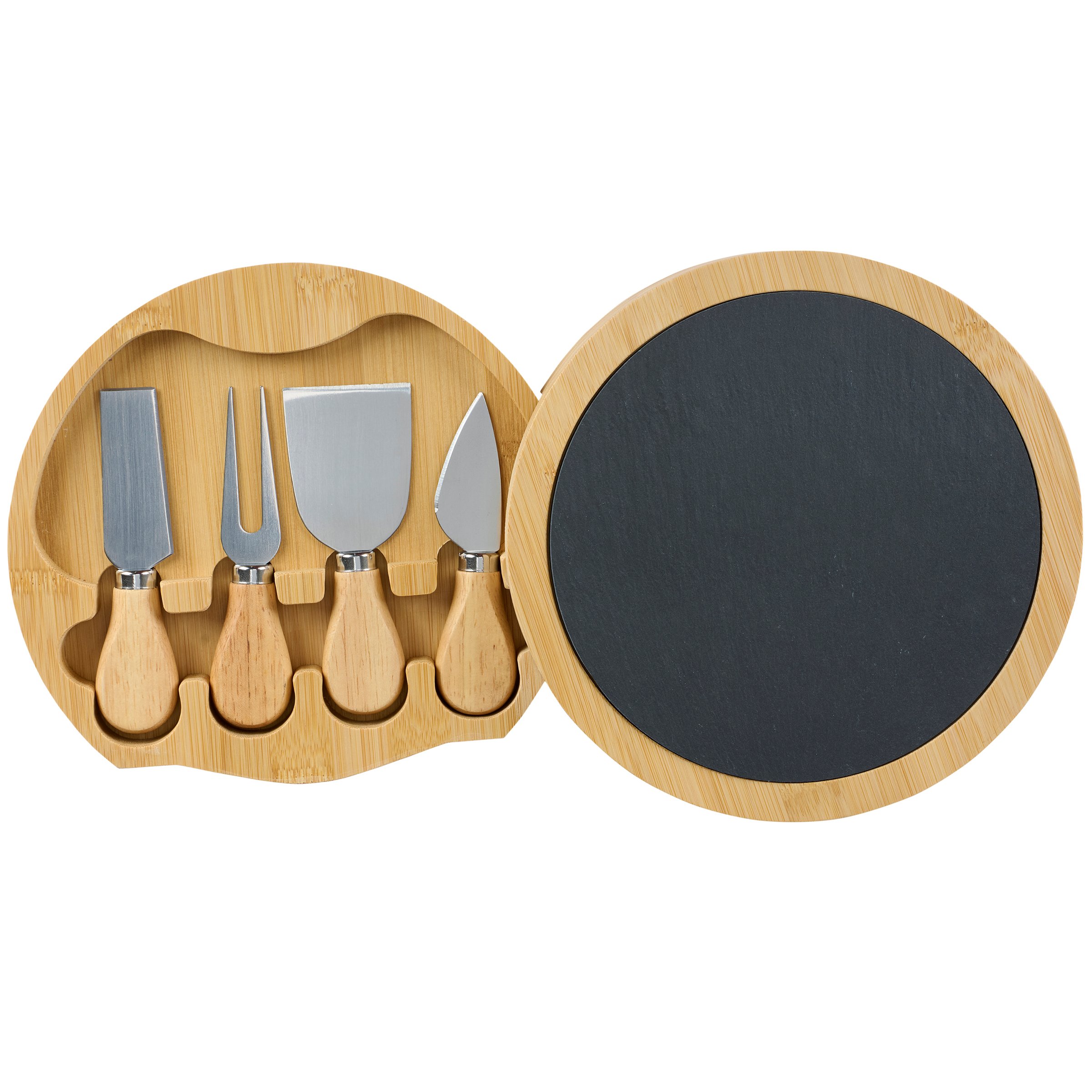 A cheese knife set featuring a slate cutting board that nests inside of a bamboo tray that swivels open to reveal space inside for holding the included 4 utensils. Cheese knife set includes a flat cheese knife, narrow plane knife, parmesan knife, and cheese fork that neatly rests inside the bamboo tray via a swivel opening for an efficiently compact design. Bamboo tray and slate cutting board is hand wash only and includes care instructions on the back. Our Swivel Top cheese knife set is perfect for everyday kitchen use and coordinates with a variety of home decor styles.