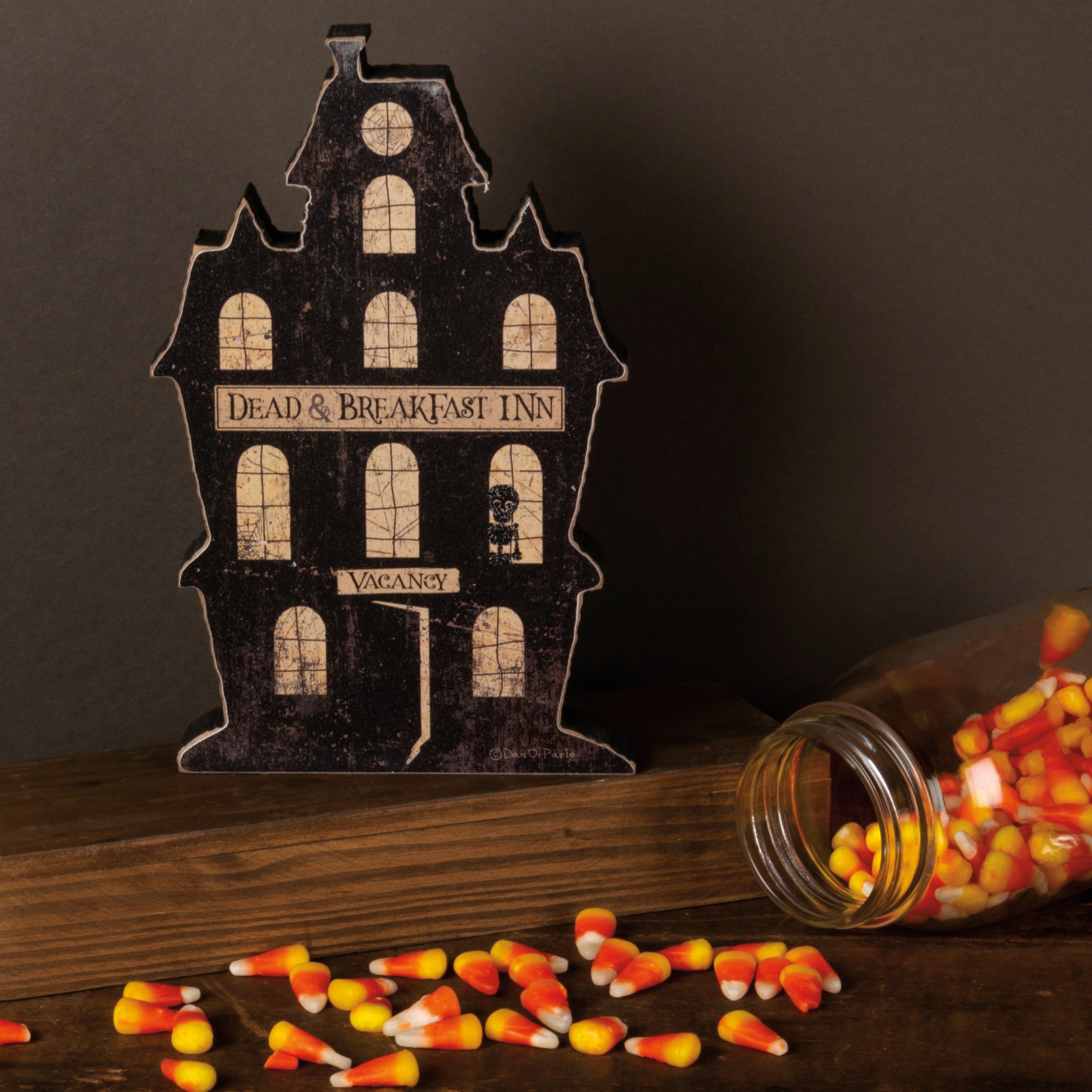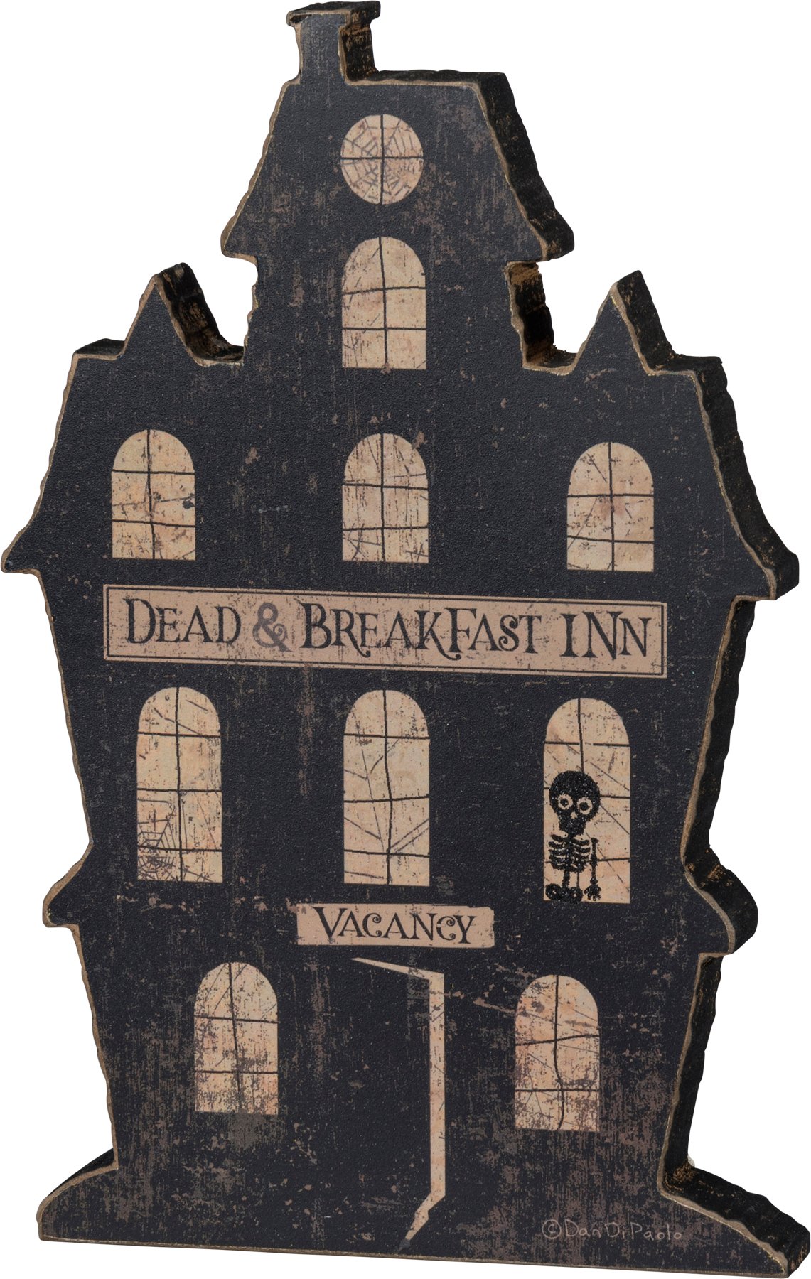Get in the holiday spirit with this wooden chunky sitter, featuring a distressed "Dead & Breakfast Inn - Vacancy" sentiment and house and skeleton designs in a neutral palette. Complements well with coordinating styles for a cohesive collection.