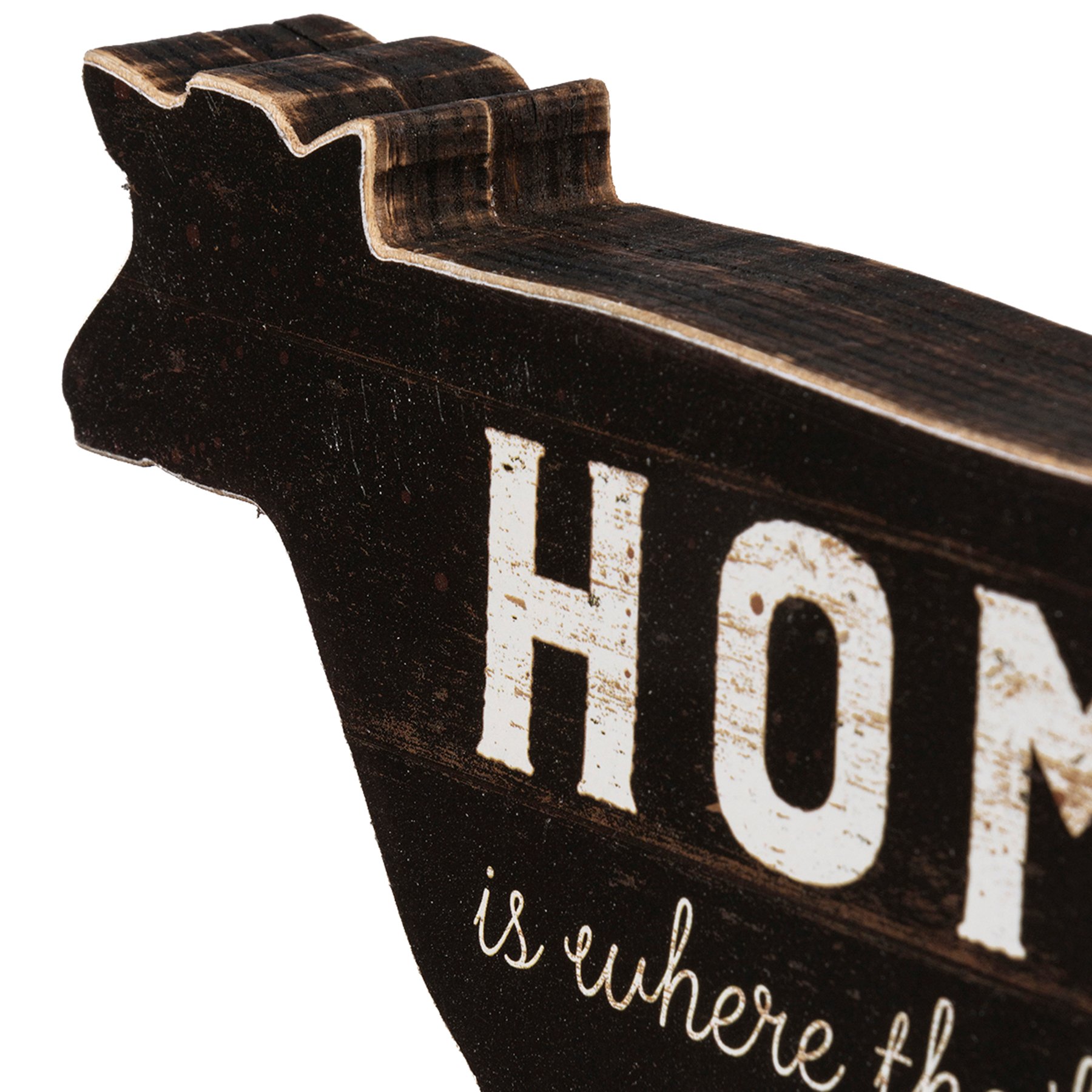 A wooden, cow-shaped chunky sitter featuring a "Home Is Where The Herd Is" sentiment and a rustic design.