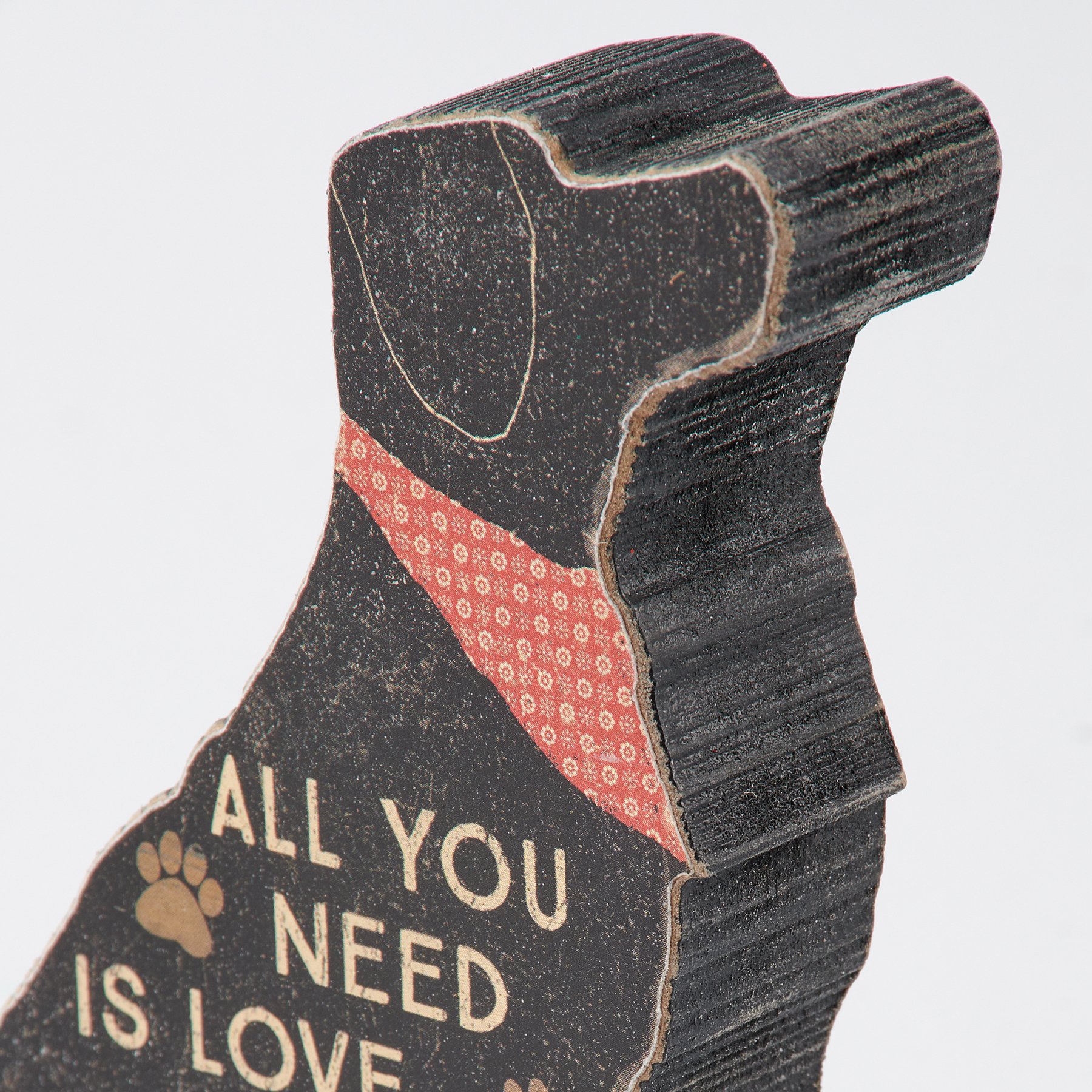 A wooden sitter from our Pet Collection cut in the shape of a sitting dog wearing a red bandana with "All You Need Is Love... And A Dog" sentiment. Sitter features distressed details with coordinating black color on sides and back. Our Love And A Dog chunky sitter is designed to free-stand alone on flat surface. A rustic everyday home accent with a variety of display options.