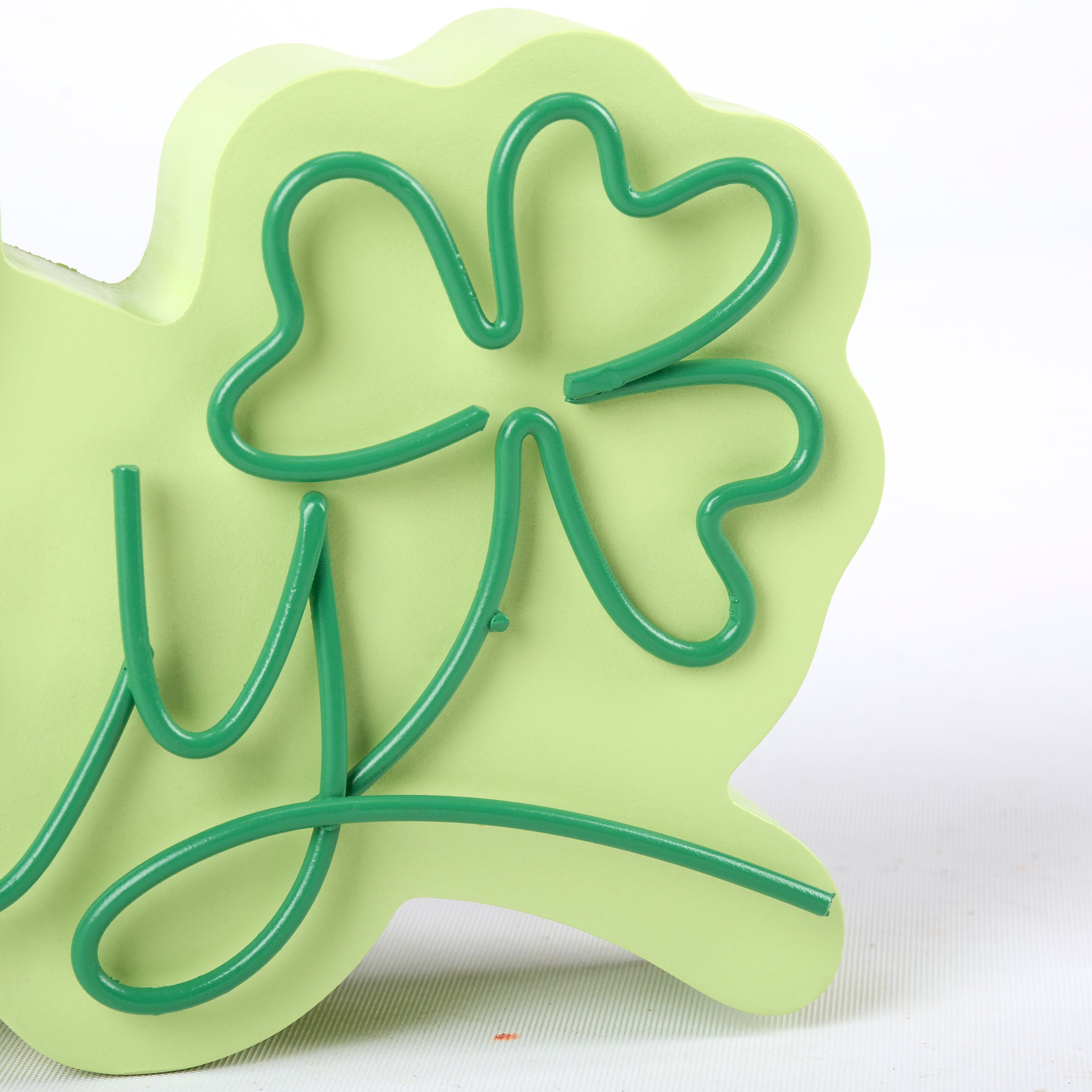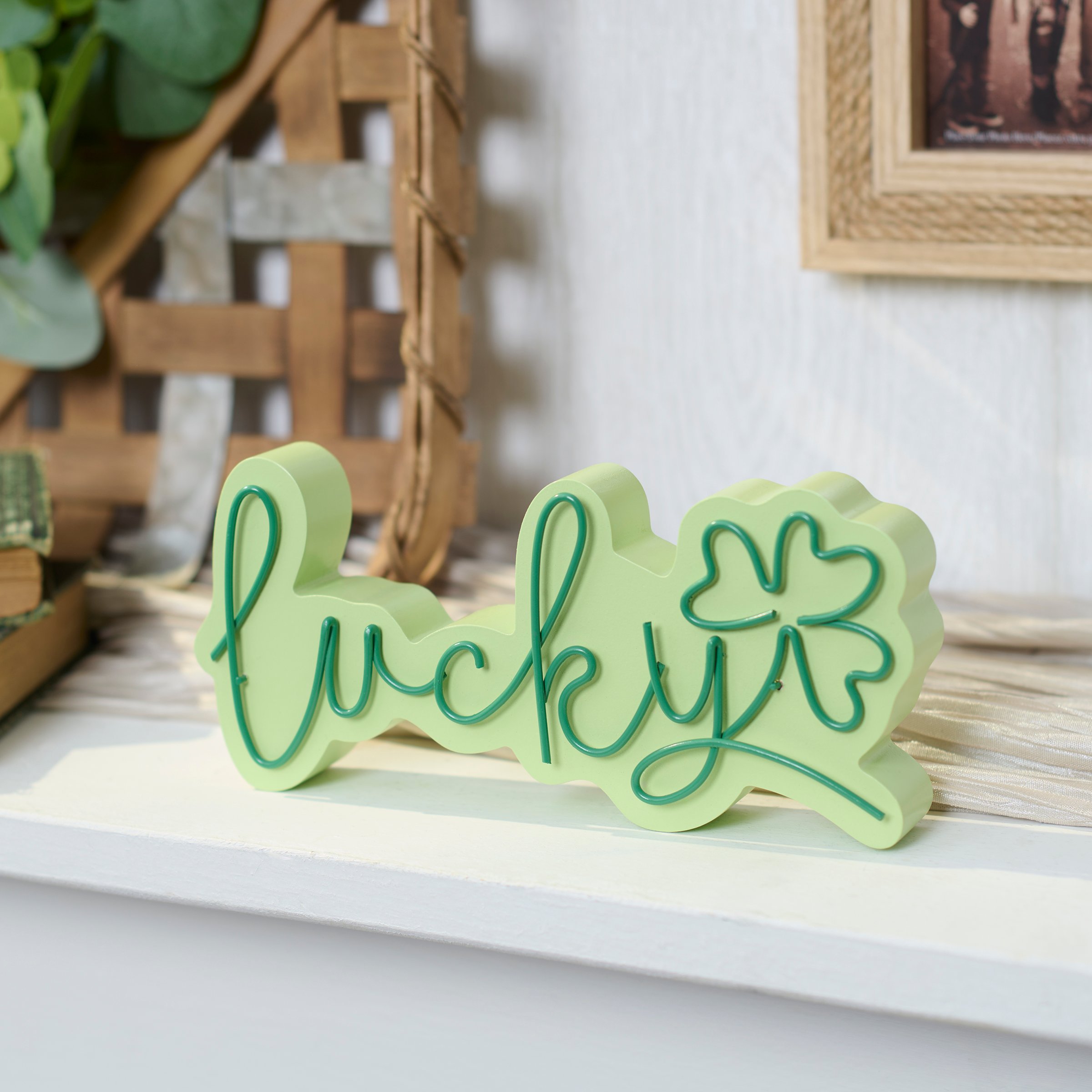 A wooden sitter from our St. Patrick's Day Collection cut in the shape of the displayed wire art sentiment that reads "Lucky" with a shamrock design at the end. This St. Patrick's Day sitter features green wire attached to a thick wood block with coordinating light green color for added dimension. Our Lucky sitter is designed to free-stand on flat surface for display. A fun St. Patrick's Day home accent that easily adds seasonal style to any home or work space.