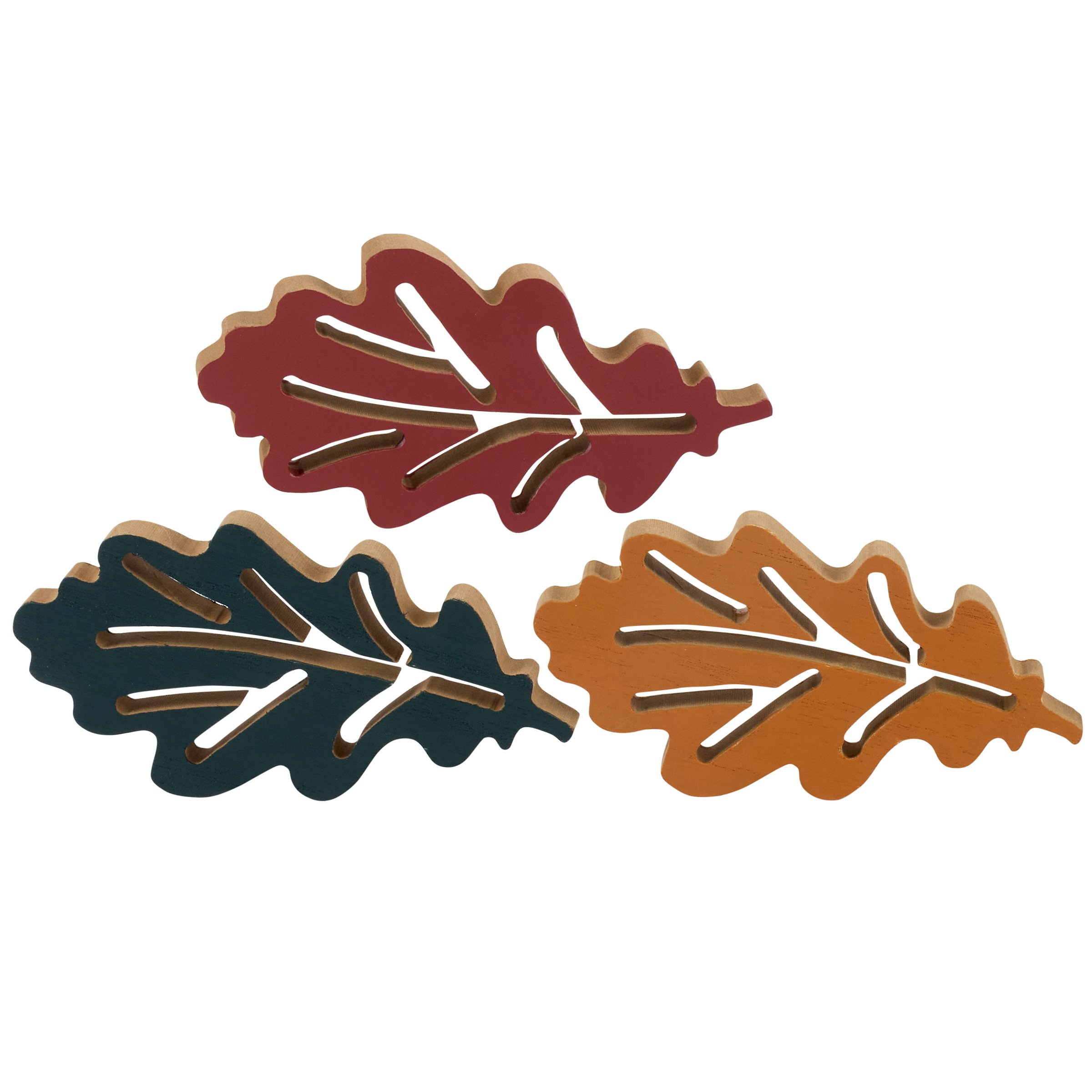 A set of three wooden sitters from our Fall & Harvest Collection cut in the shape of oak leaves with individual autumn colors for each. Oak leaf sitters feature cutout designs with coordinating natural wood on sides and backs. Our Oak Leaves chunky sitter set is designed to free-stand on flat surface for display. A set of rustic fall home accents that can be easily displayed in any home or work space.