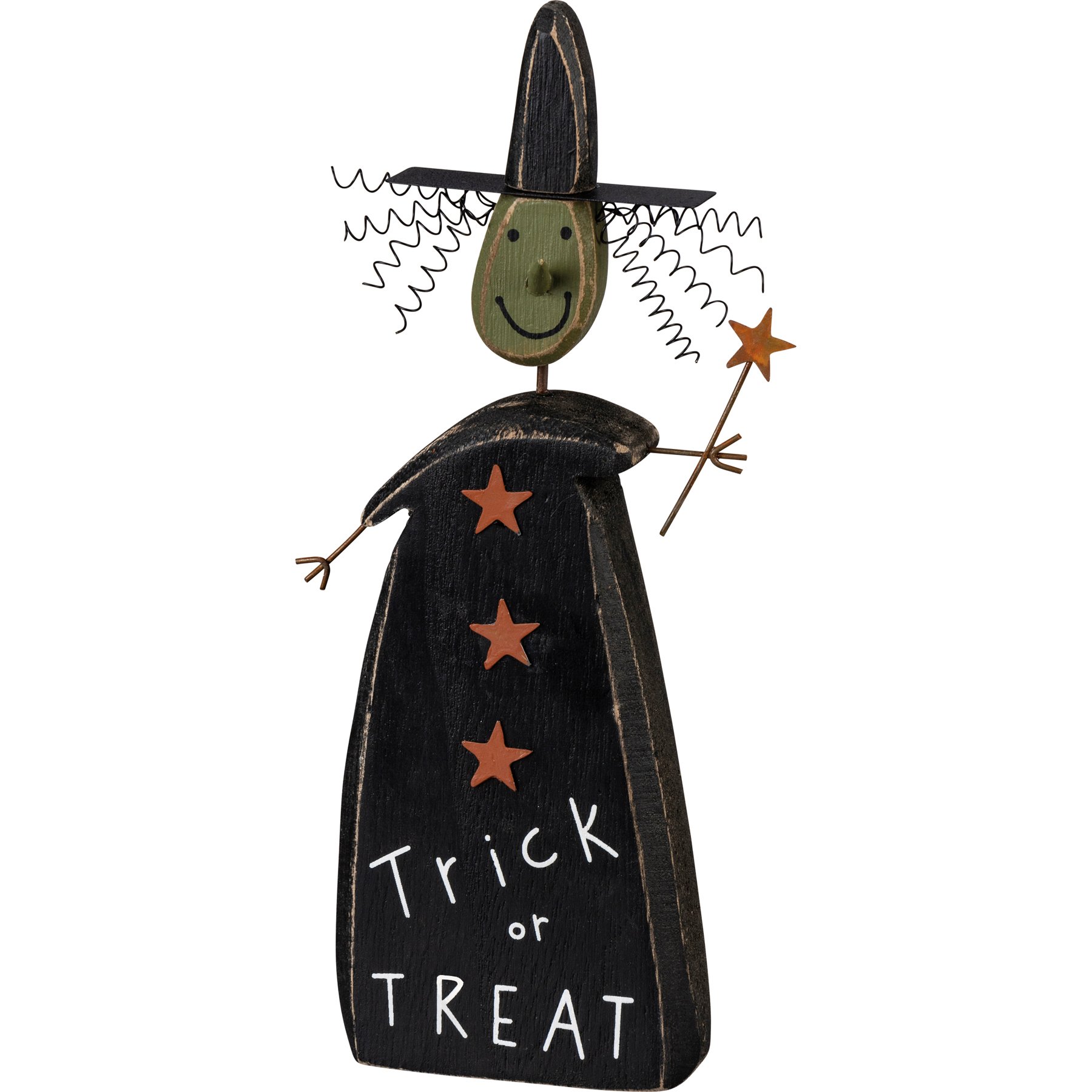This primitive wooden witch chunky sitter lends a hand lettered "Trick Or Treat" sentiment and includes painted and metal accents including wand and coiled hair. Features muted green, black and orange palette and complements well with other pieces in collection. Makes a spooky yet sweet addition to existing Halloween display.