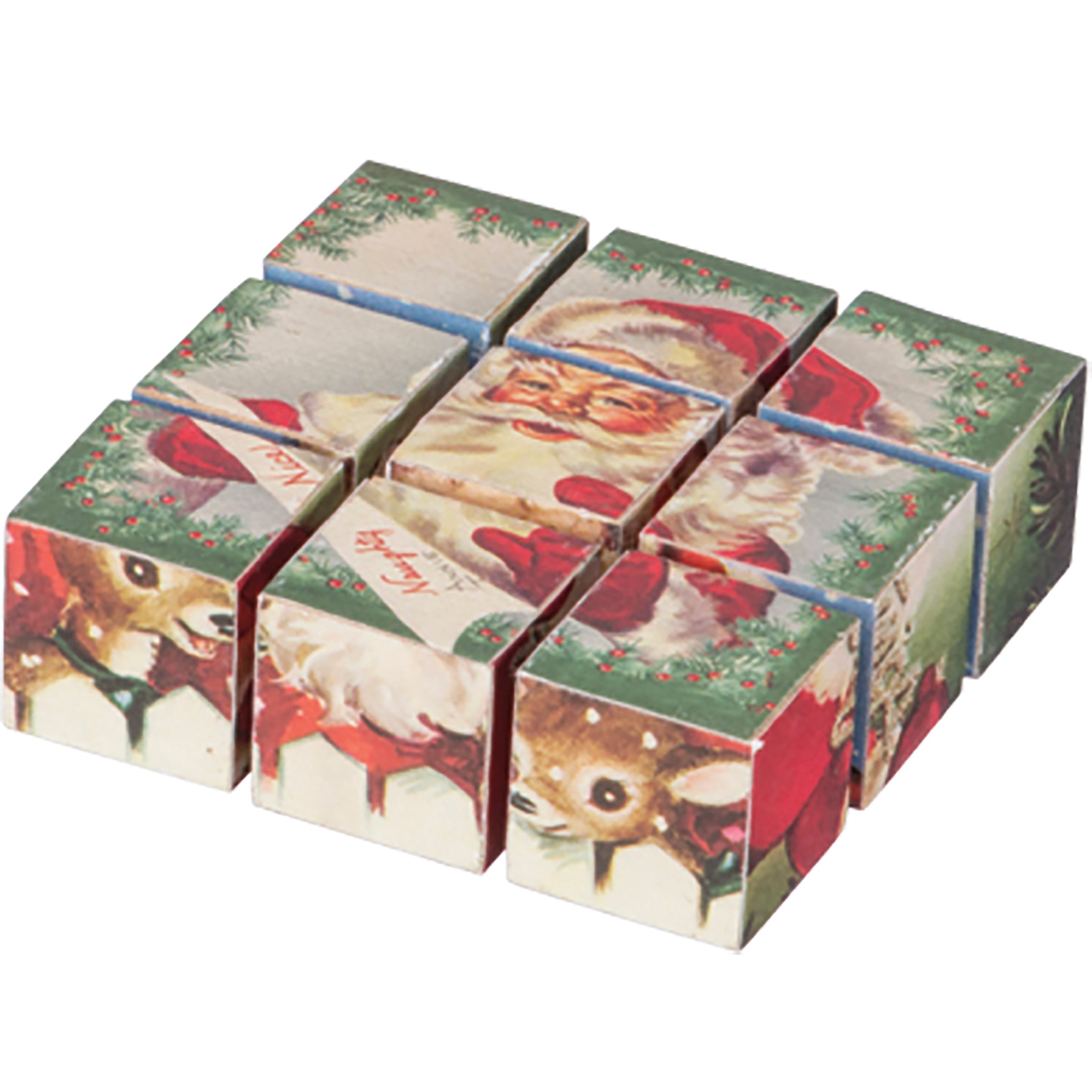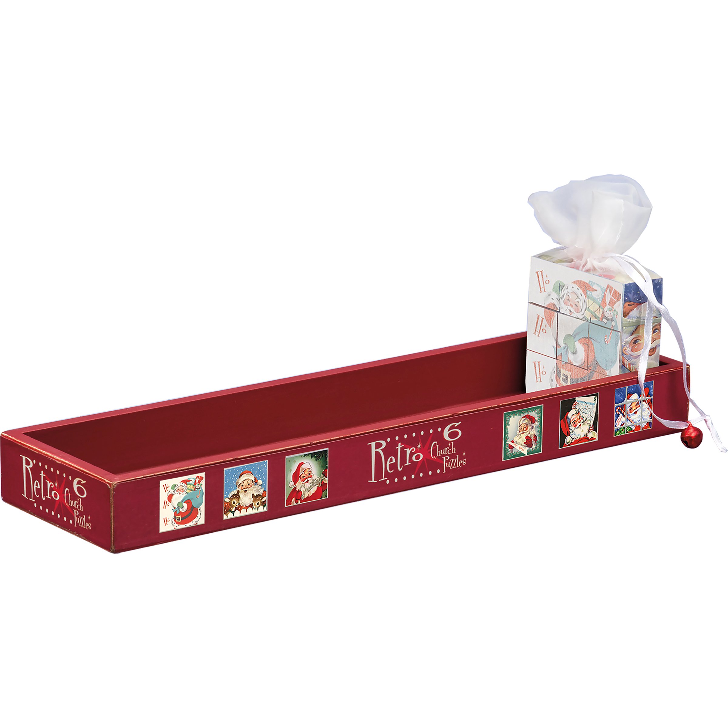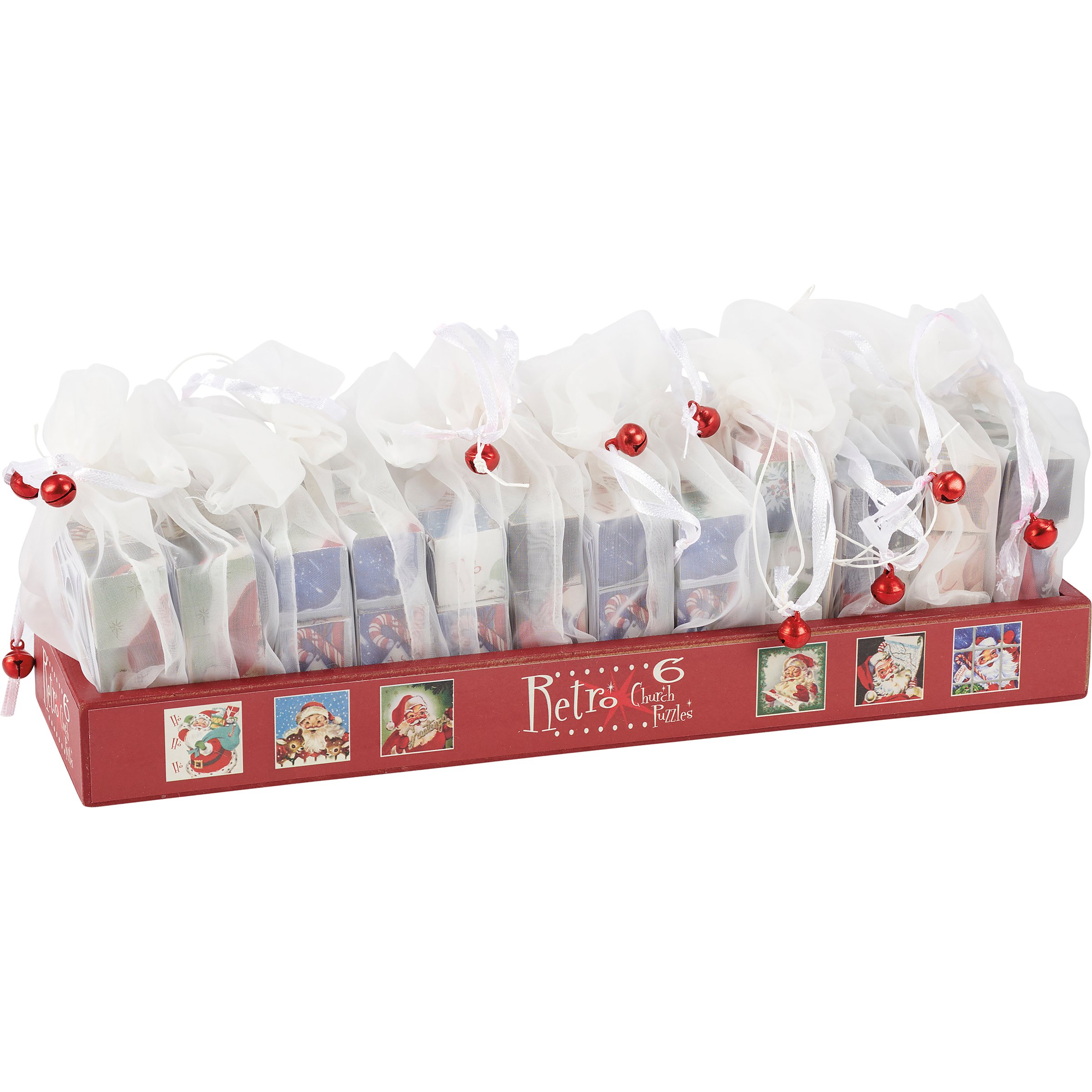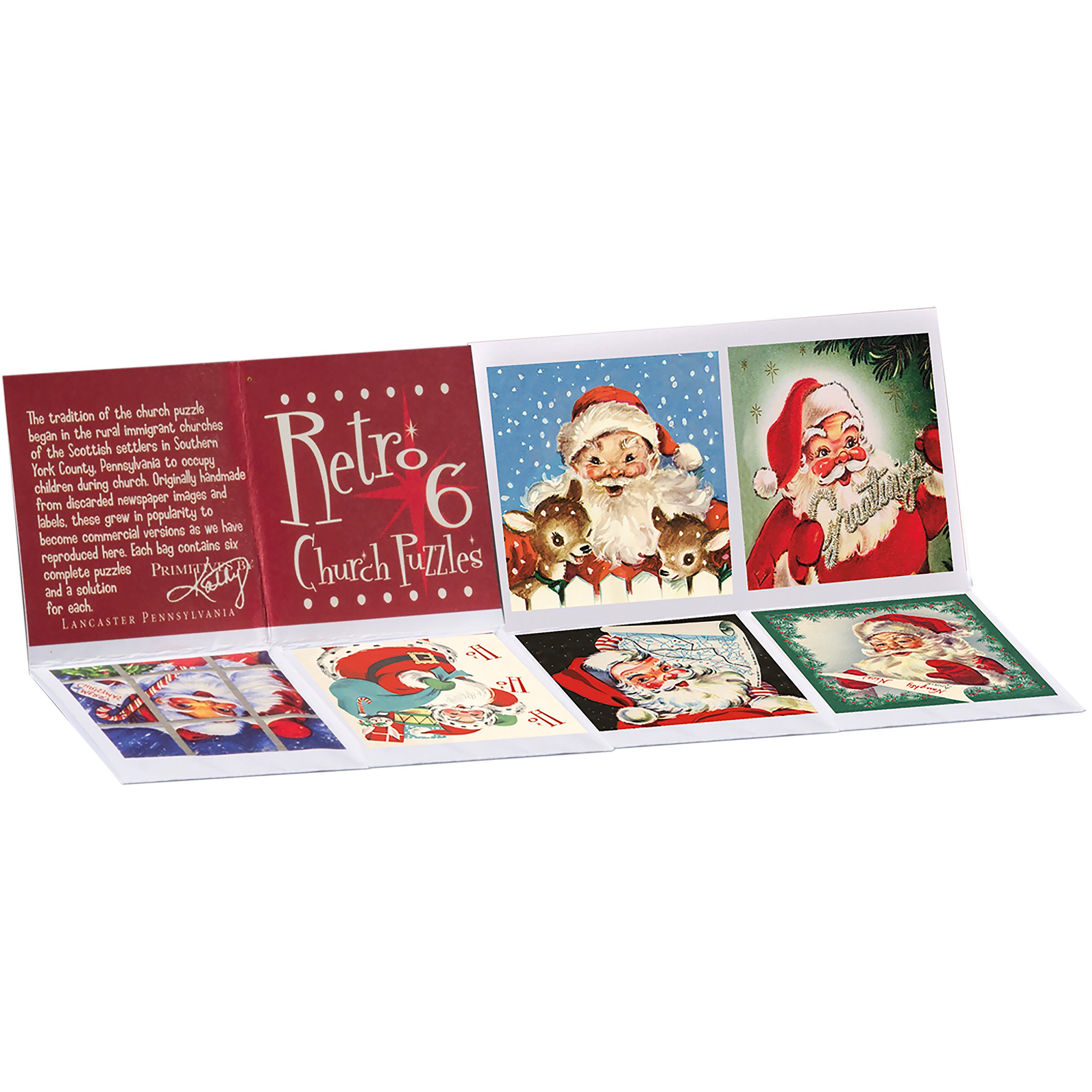 A vintage-inspired Retro Church Puzzle six-in-one set. Each drawstring bag includes 9 blocks that create 6 different puzzles with Santa illustrations. Comes with illustrated counter display.