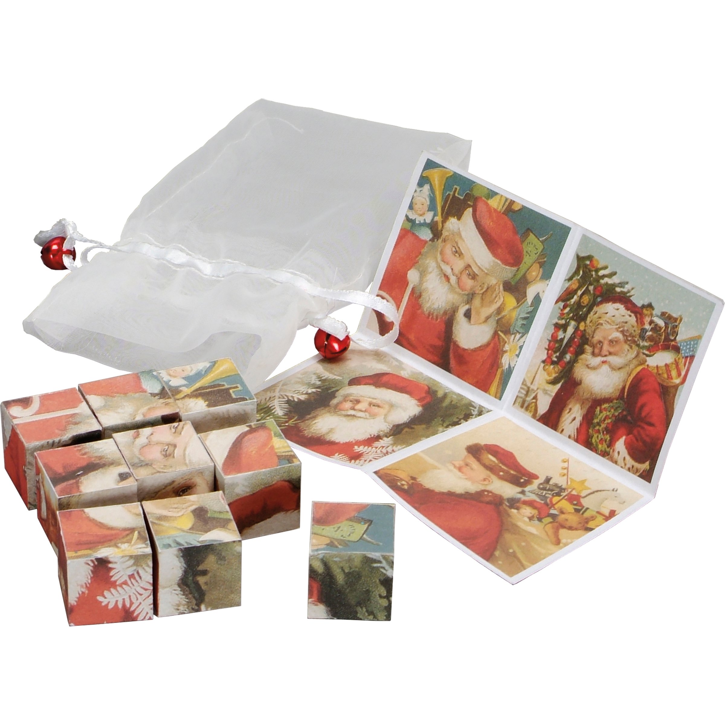 A mini vintage-inspired Retro Church Puzzle six-in-one set. Each drawstring bag includes 9 blocks that create 6 different puzzles with Santa illustrations. Comes with illustrated counter display.