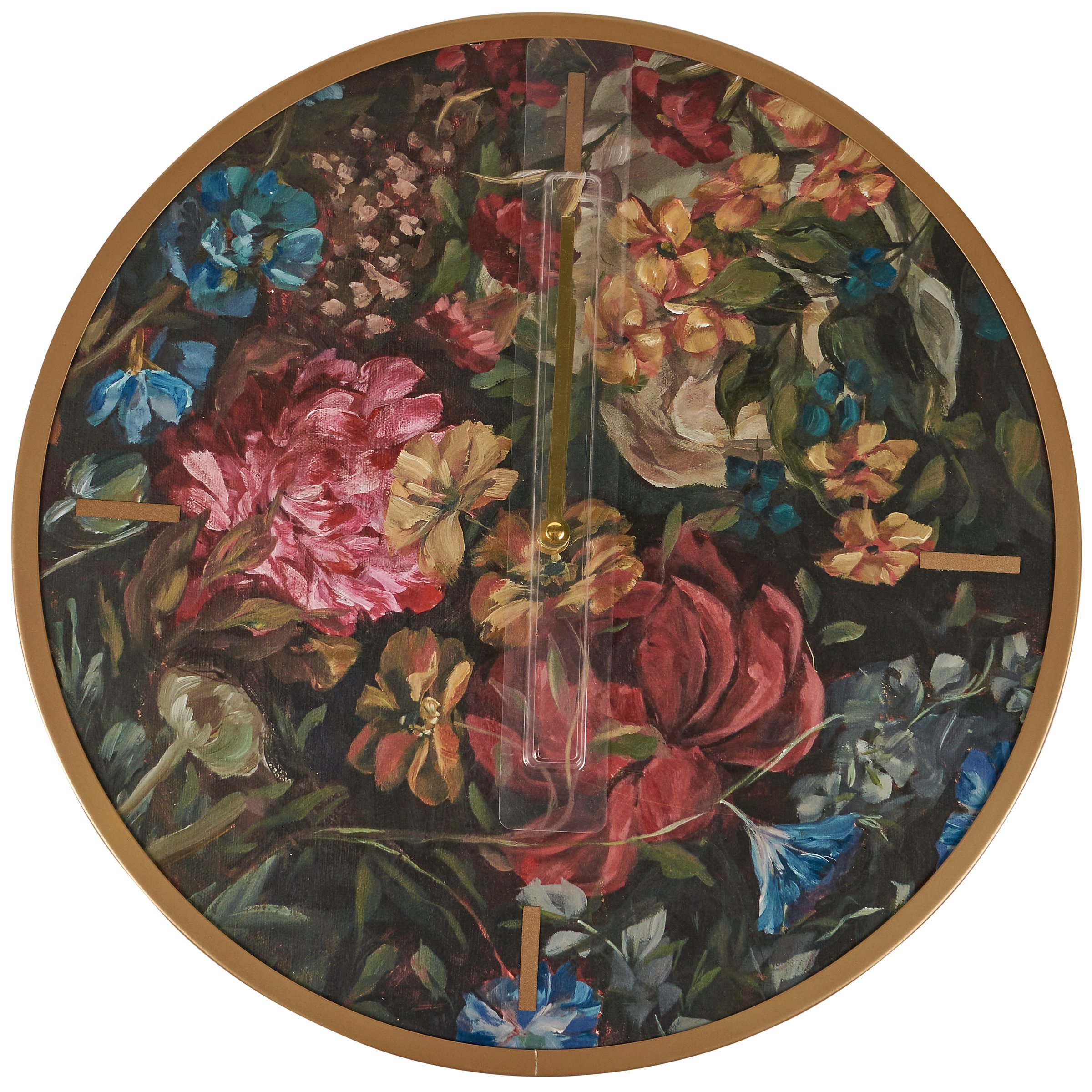 A round wooden clock from our Moody Collection displaying stylish hand painted florals in a deep color palette on the face of the clock. Design is replicated from original artwork hand painted in a unique watercolor style. Frame, number elements, and clock hands feature complementing gold metal. Our Moody Floral clock is easy to hang via sawtooth hanger on back. Requires 1 AA battery (not included). A stylish everyday home accent perfect for any room.