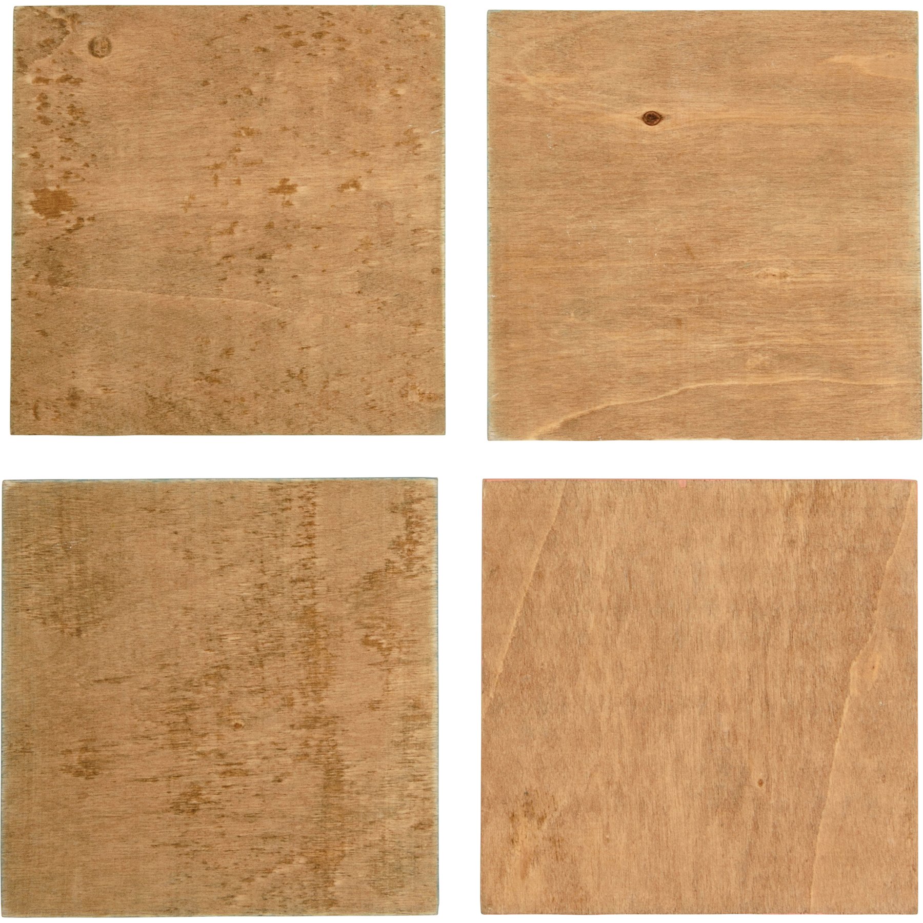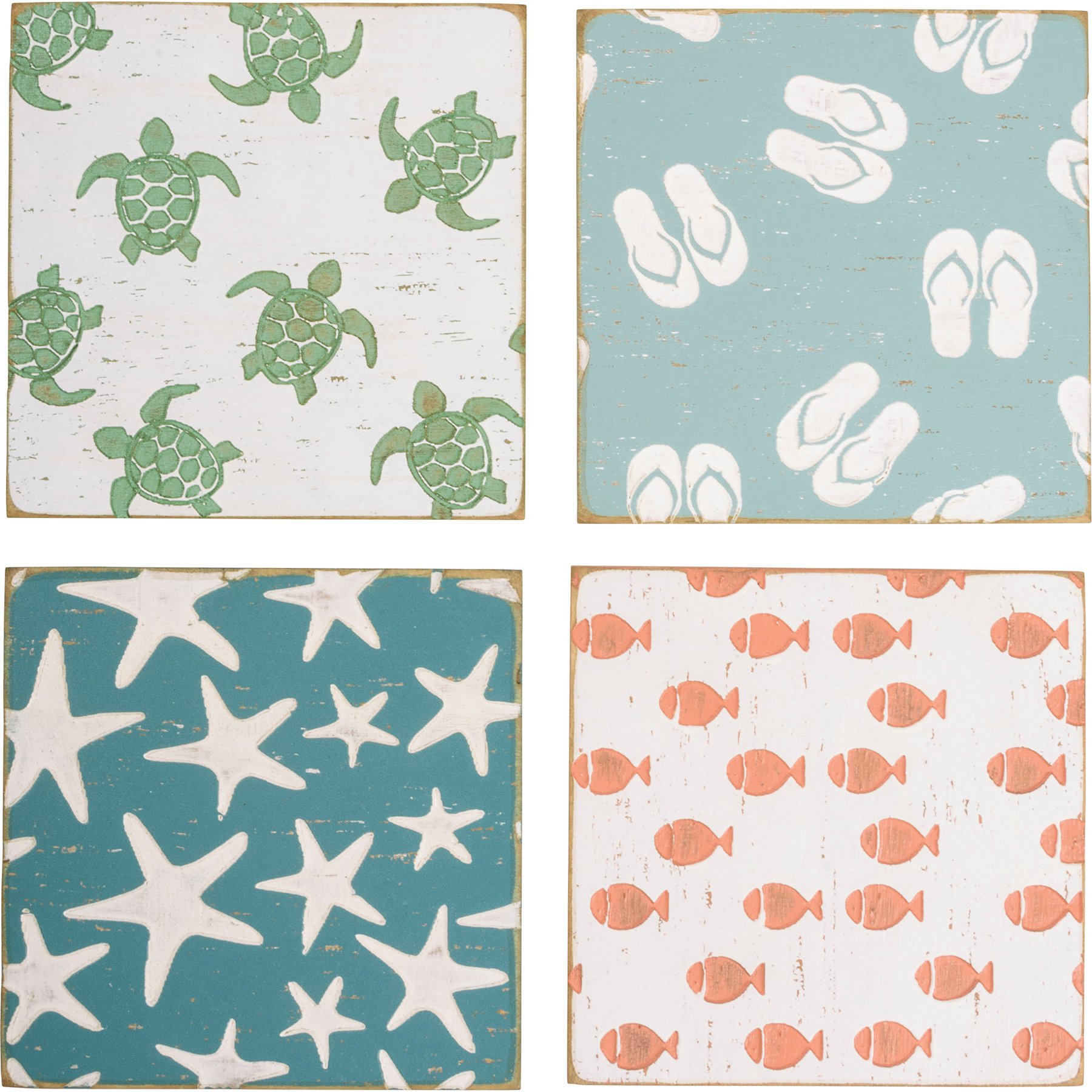 A set of four wooden coasters featuring debossed, distressed beach designs and a surf-inspired palette. Comes with wooden holder.