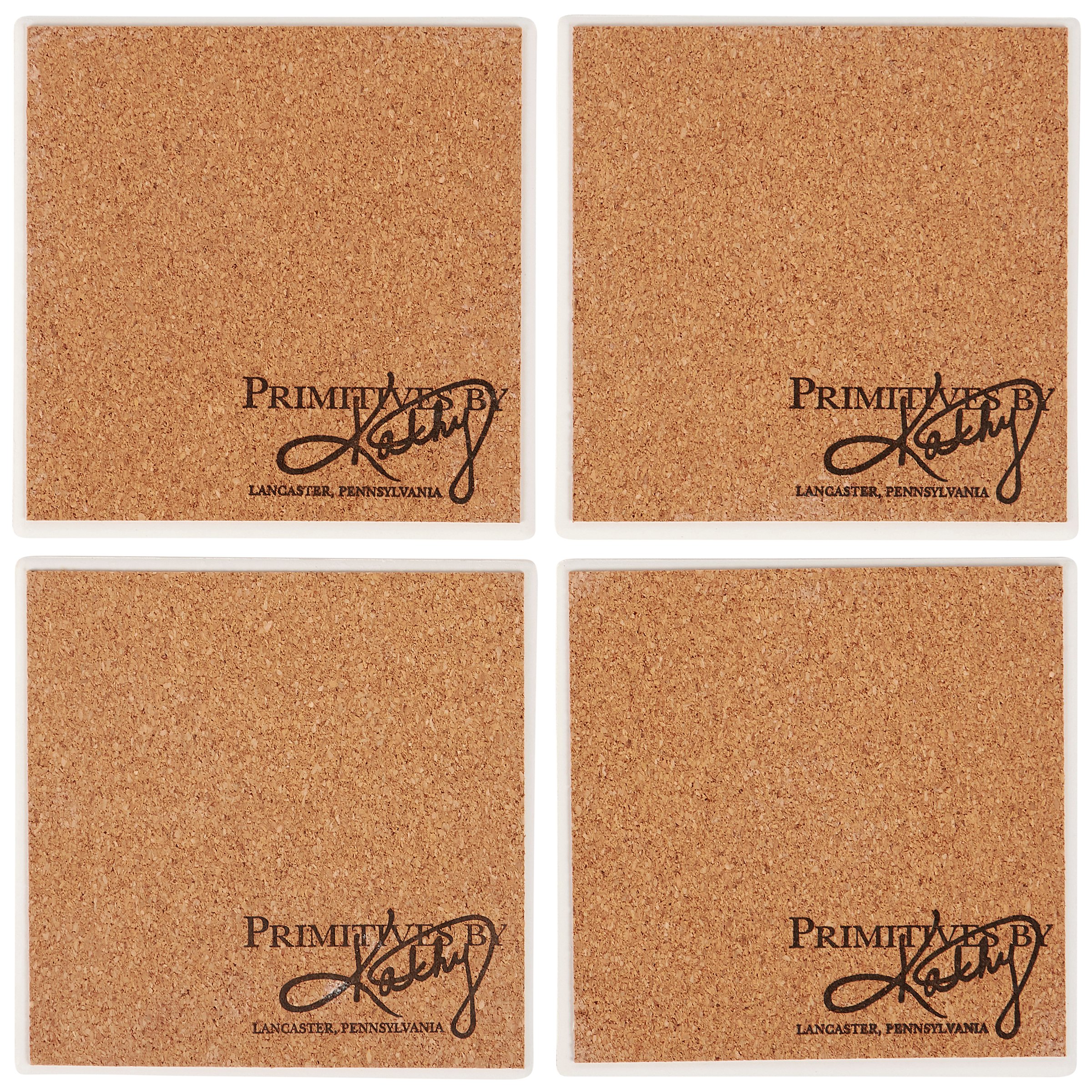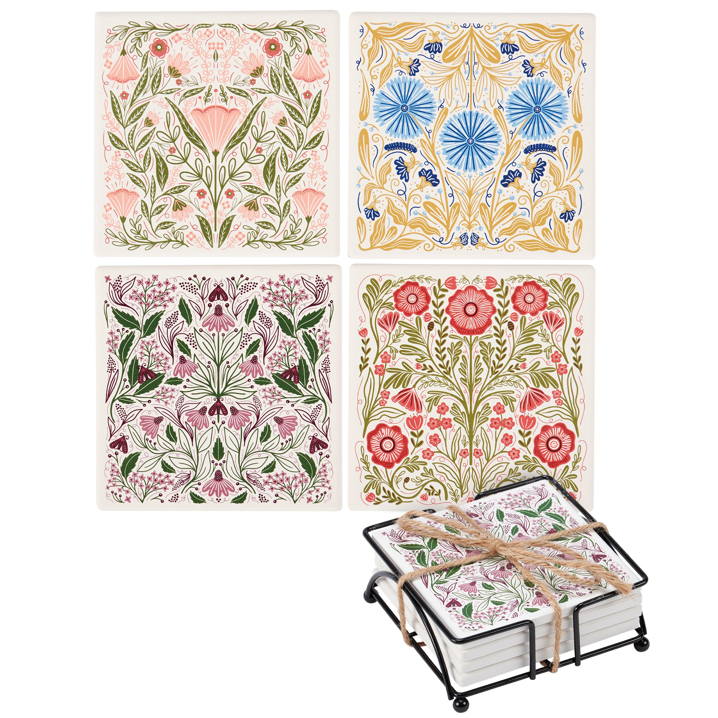 A coordinating set of four stoneware coasters with cork bases from our Folk Art Collection displaying hand illustrated designs of florals inspired by folk art. Each botanical coaster features individual designs displaying blue florals with caterpillars, pink blossoms, poppies, and purple florals. Our Botanical Folk Art coaster set includes a wire holder to store coasters and comes packaged with jute rope tied around set. A set of charming everyday home accents perfect for adding functional style any room.