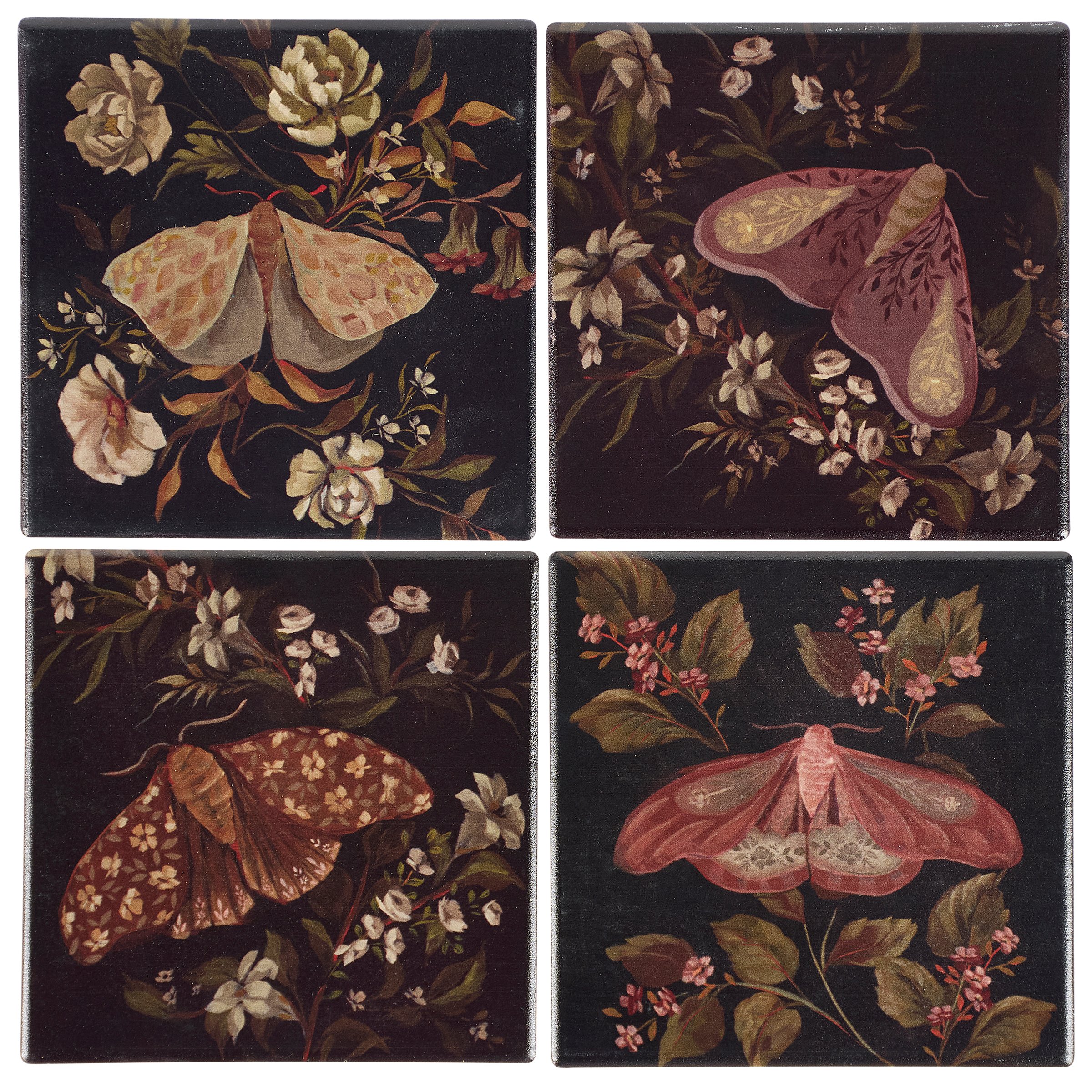 A coordinating set of four stoneware coasters with cork bases from our Moody Collection displaying charming garden inspired designs of various florals and butterflies in a moody color palette. Each botanical coaster features individual garden designs replicated from original art hand painted in a unique watercolor style. Our Hidden Garden coaster set includes a wire holder to store coasters and comes packaged with jute rope tied around set. A set of moody everyday home accents perfect for adding functional style any room.