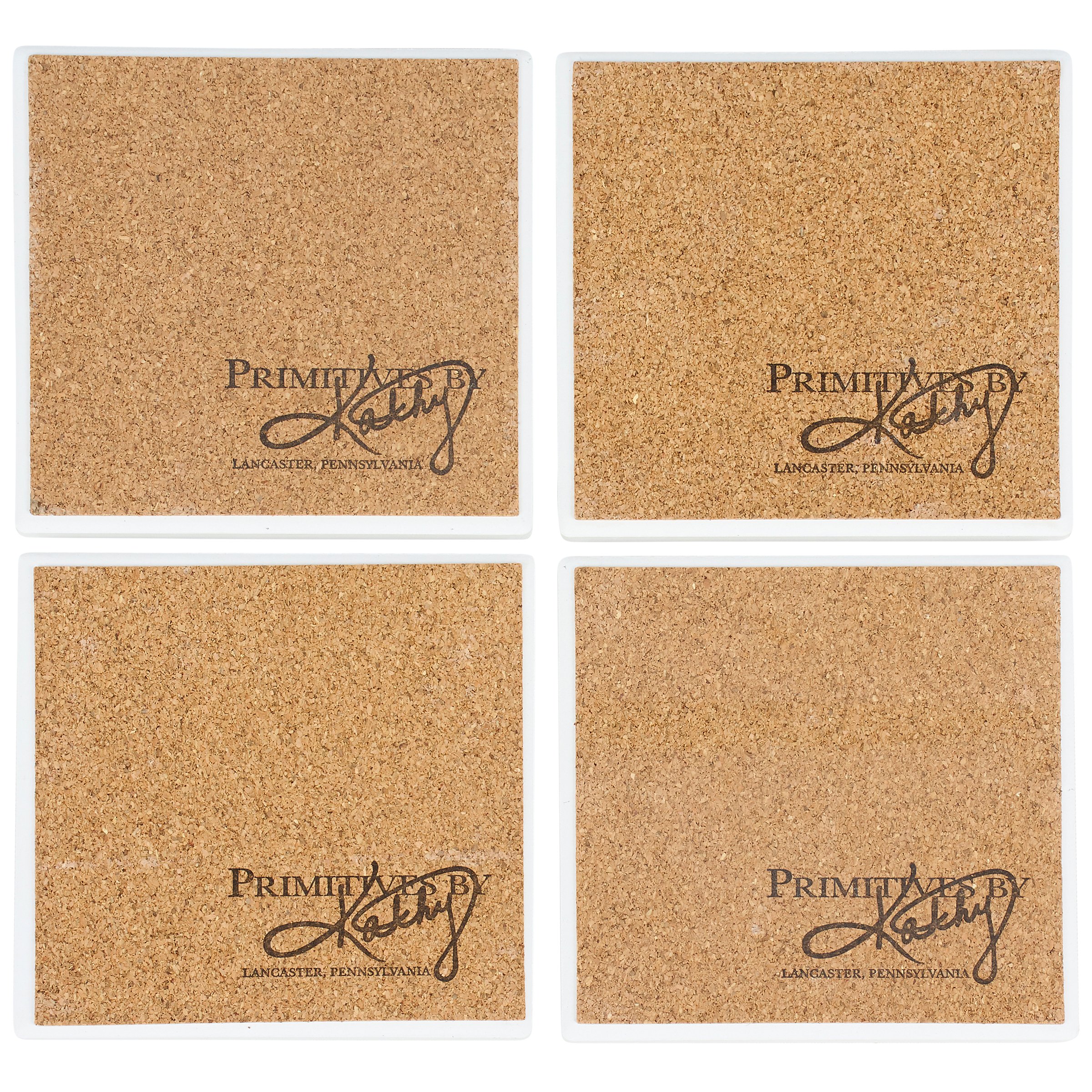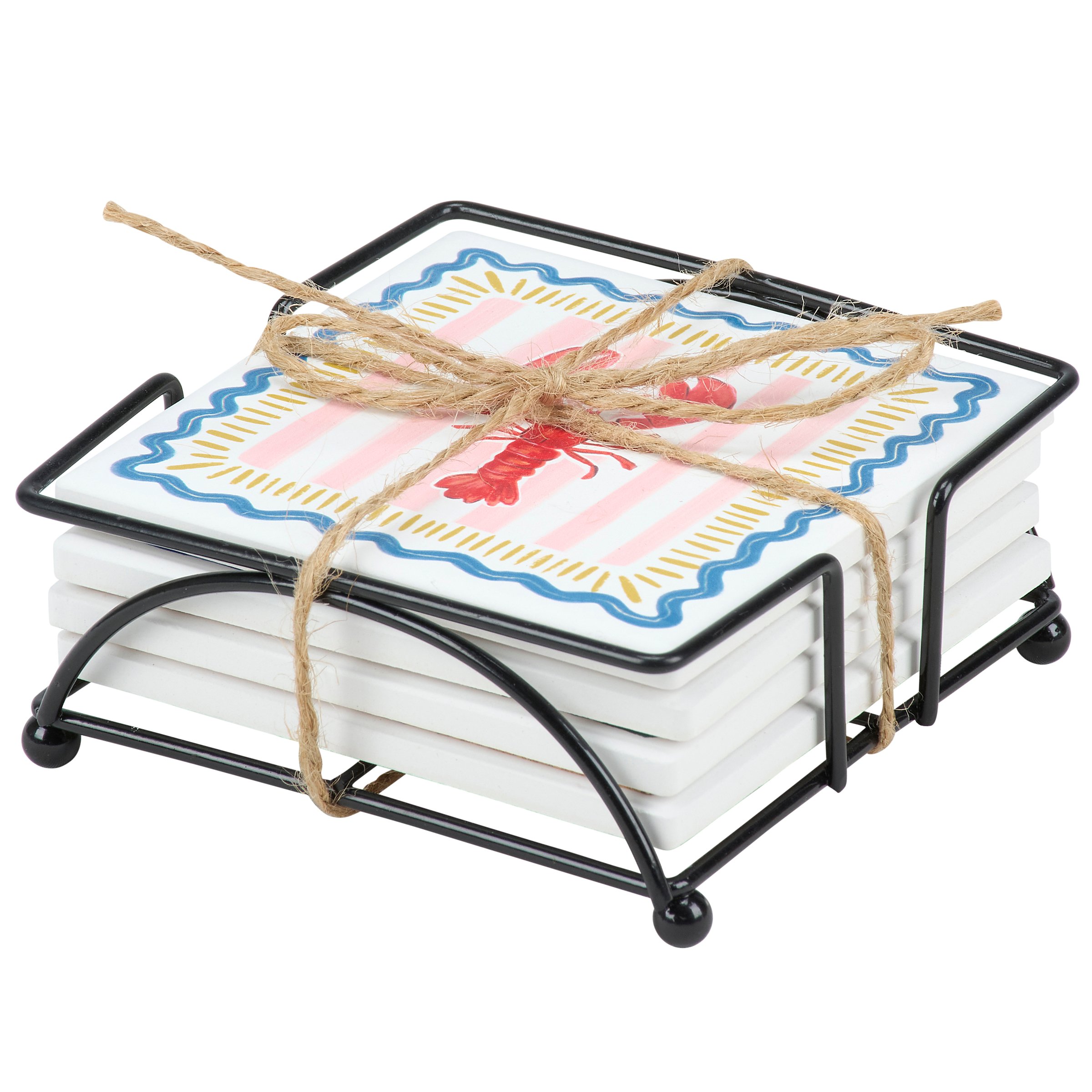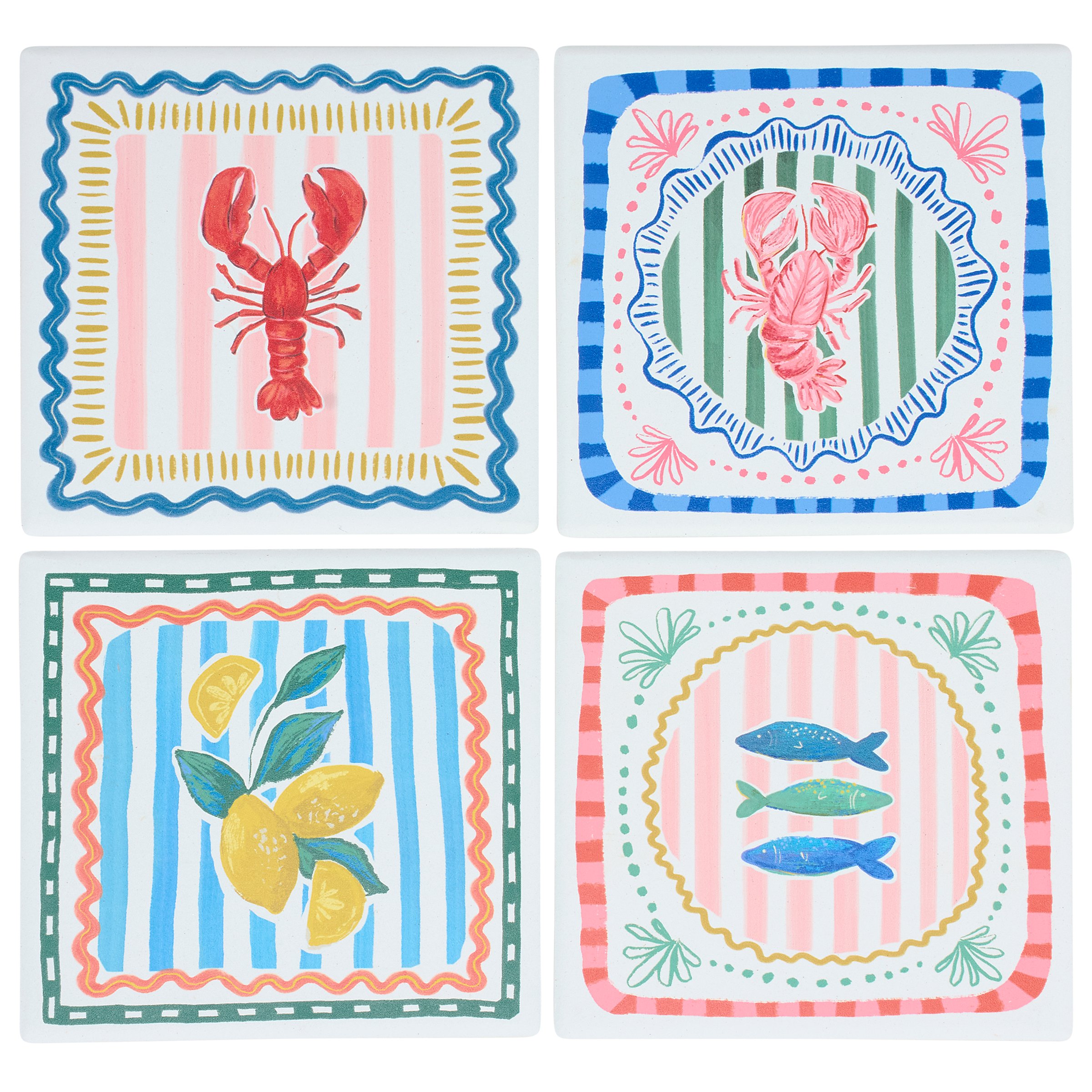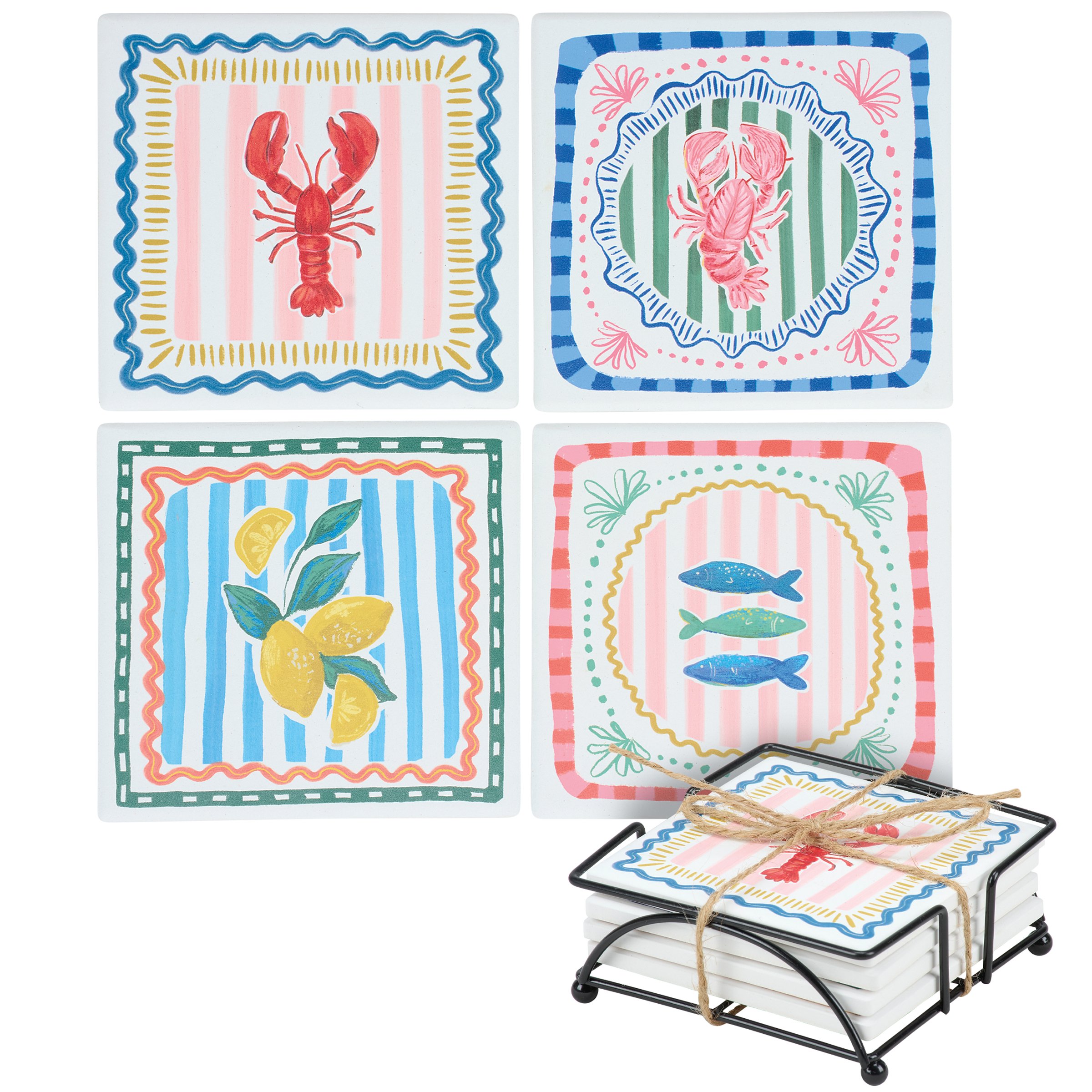 A coordinating set of four stone coasters with cork bases from our Beach Collection displaying colorful seafood themed designs inspired by Italian coastal style. Each tile coaster features individual coastal designs replicated from original hand painted watercolor art including lobsters, lemons, and fish with complementing borders and patterns. Our Italian Coastal coaster set includes a wire holder to store coasters and comes packaged with jute rope tied around set making it great for gifting and easy store display. A set of coastal themed home accents perfect for adding functional style any room.