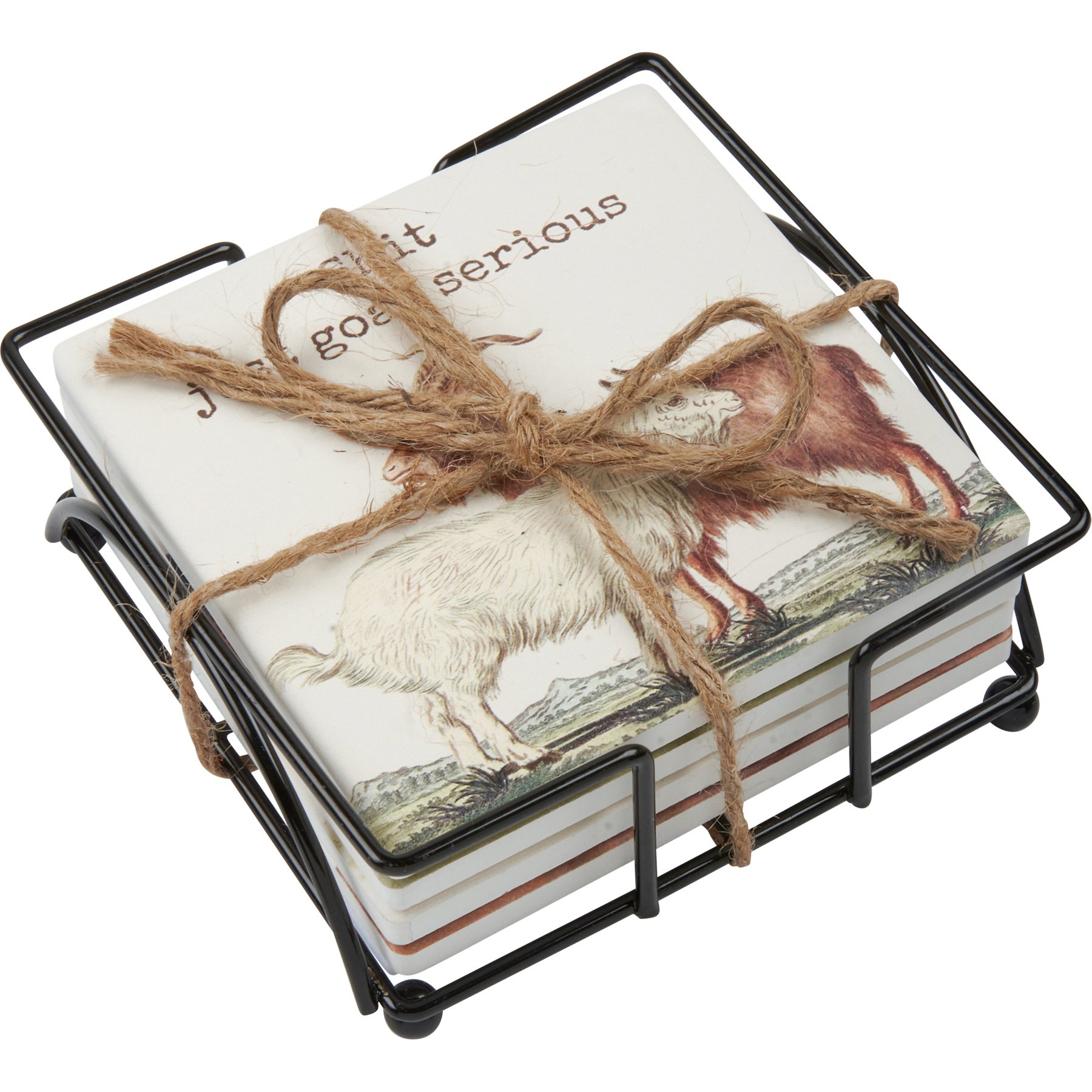 A set of four stoneware coasters with cork bases from our Farmhouse Collection displaying vintage animal designs with coordinating punny sentiments. Each coaster features individual designs including goats, roosters, duck, and donkey and sentiments that read "Shit Just Goat Serious - What A Fuster Cluck - What The Duck? - Check Out This Ass." Our What The Duck coaster set includes a wire holder to store coasters and comes packaged with jute rope tied around set. A fun and functional home accent perfect for any room.