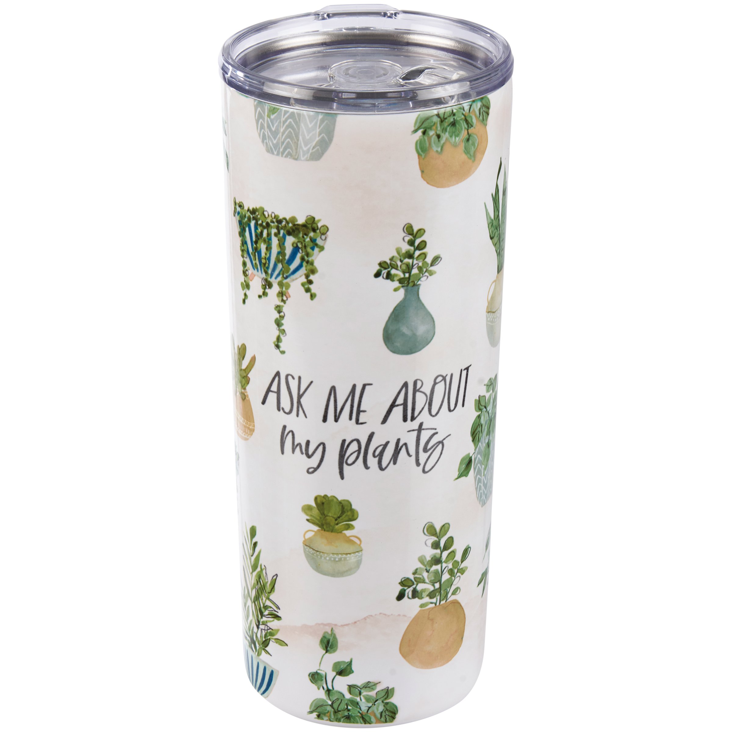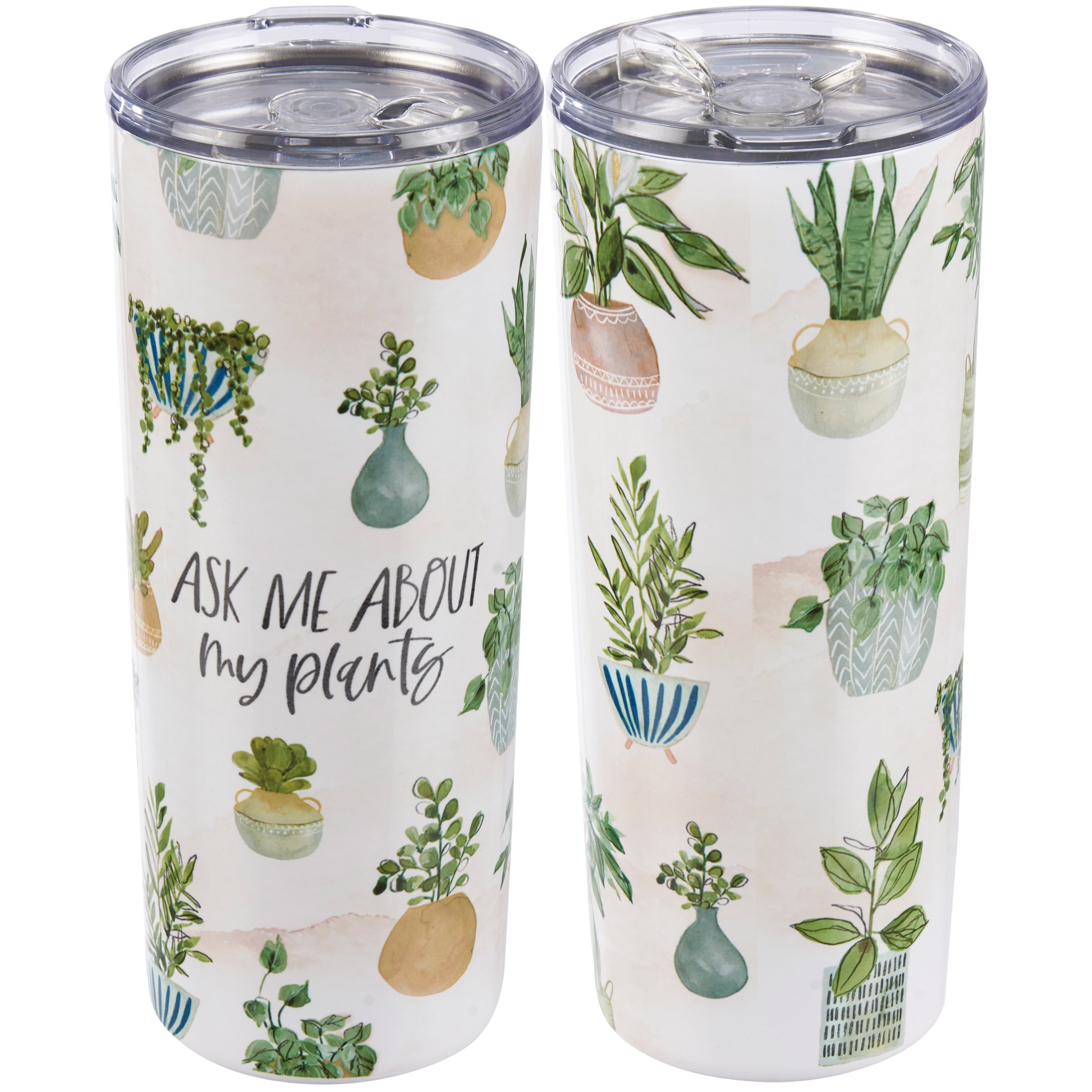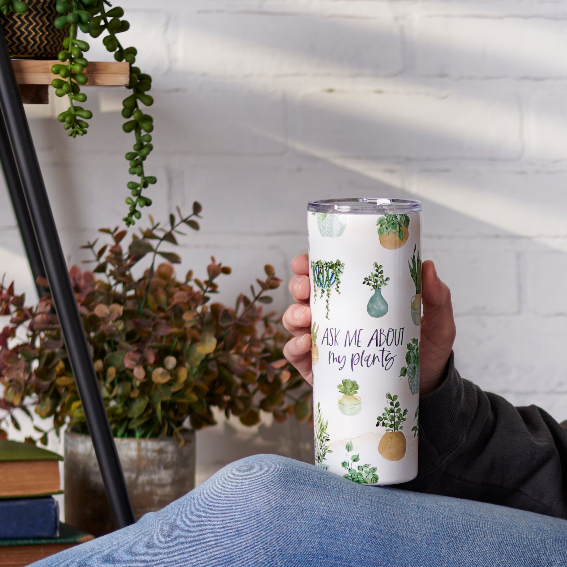 A 20 oz stainless steel coffee tumbler from our Botanical Collection displaying a full wrap-around design of house plants in a watercolor style. Design features an "Ask Me About My Plants" sentiment. Our Ask Me About My Plants coffee tumbler is insulated to keep beverages hot for 4 hours or cold for 6 hours and includes a plastic lid with rubber seal. Hand-wash only; do not microwave. BPA free. A fun everyday accessory perfect for on-the-go or at home.