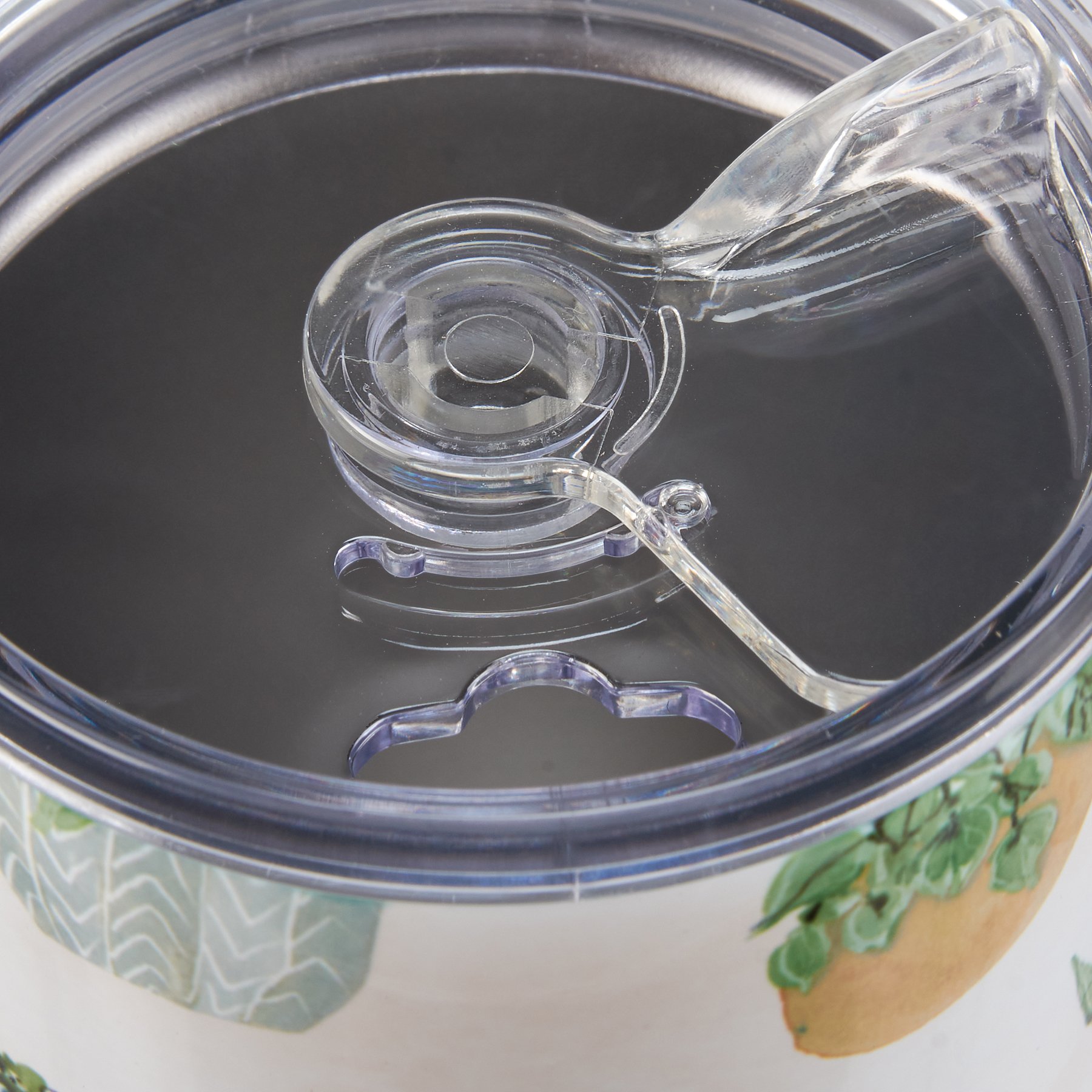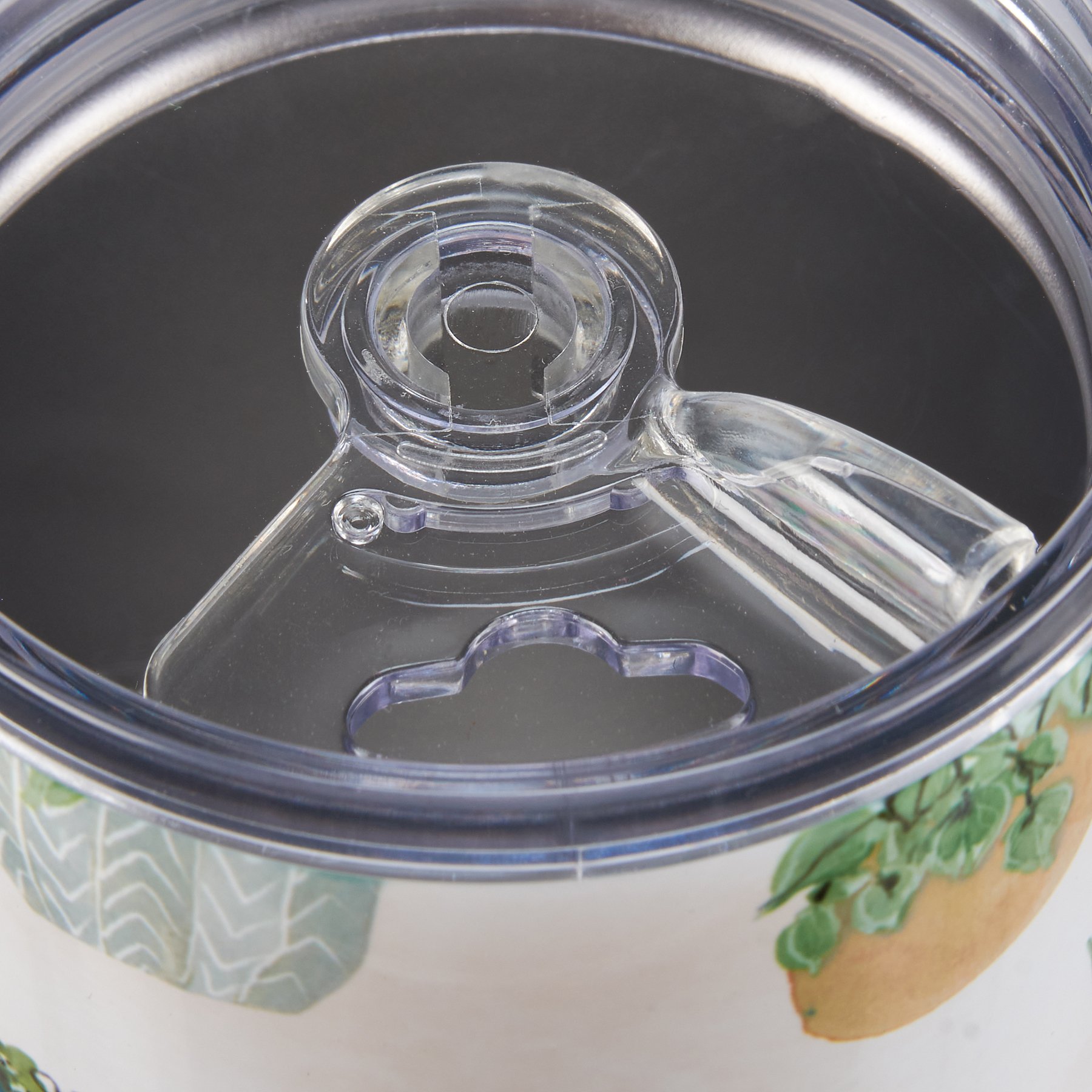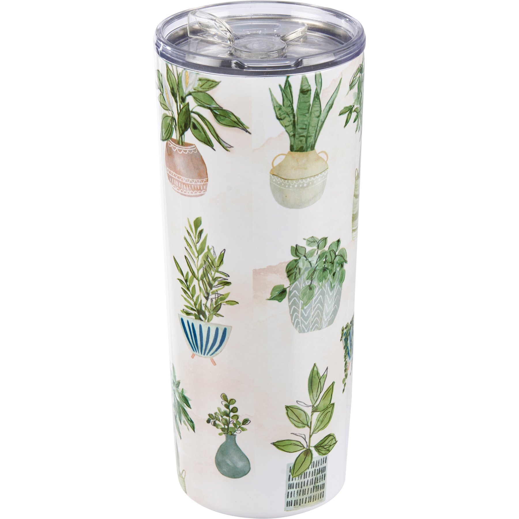 A 20 oz stainless steel coffee tumbler from our Botanical Collection displaying a full wrap-around design of house plants in a watercolor style. Design features an "Ask Me About My Plants" sentiment. Our Ask Me About My Plants coffee tumbler is insulated to keep beverages hot for 4 hours or cold for 6 hours and includes a plastic lid with rubber seal. Hand-wash only; do not microwave. BPA free. A fun everyday accessory perfect for on-the-go or at home.