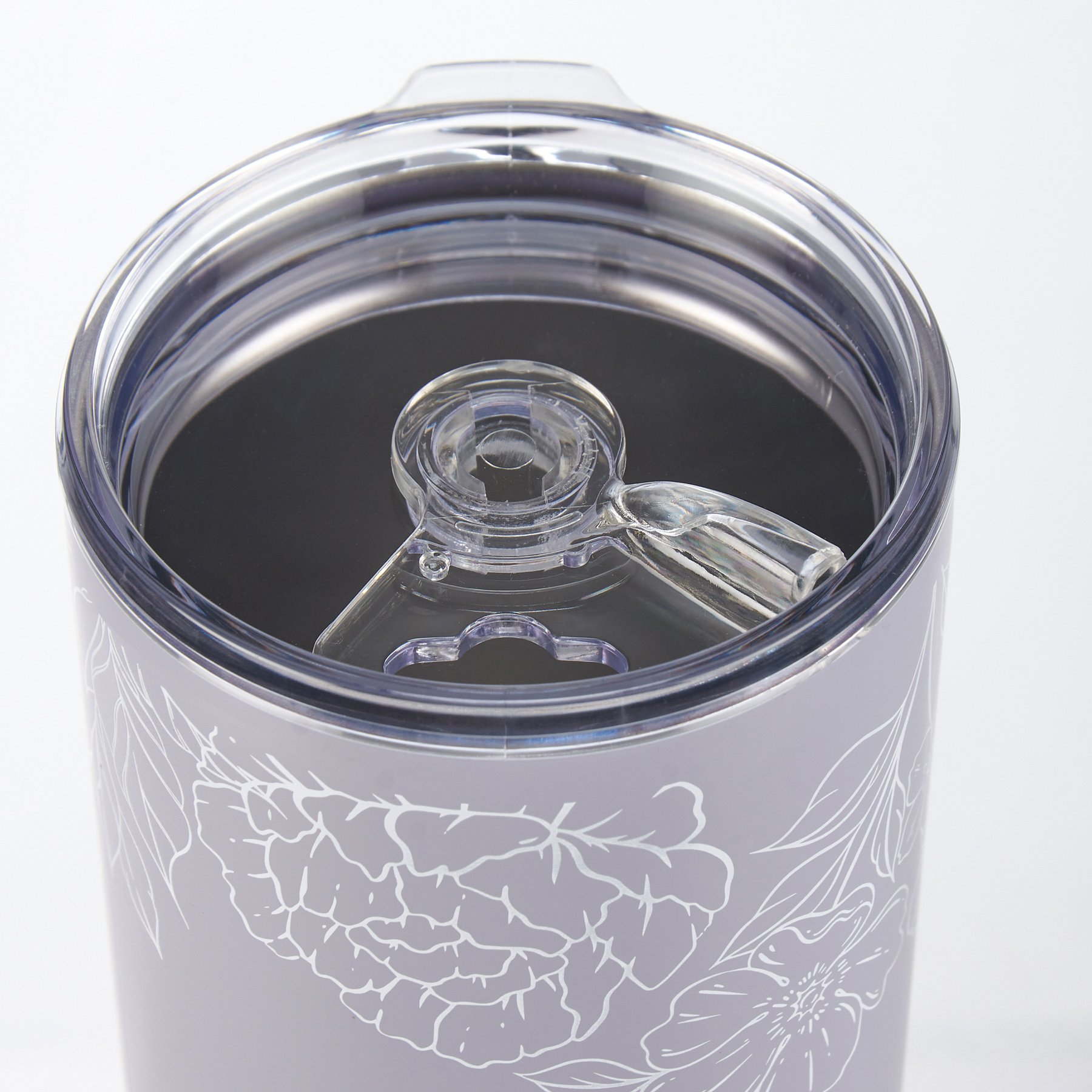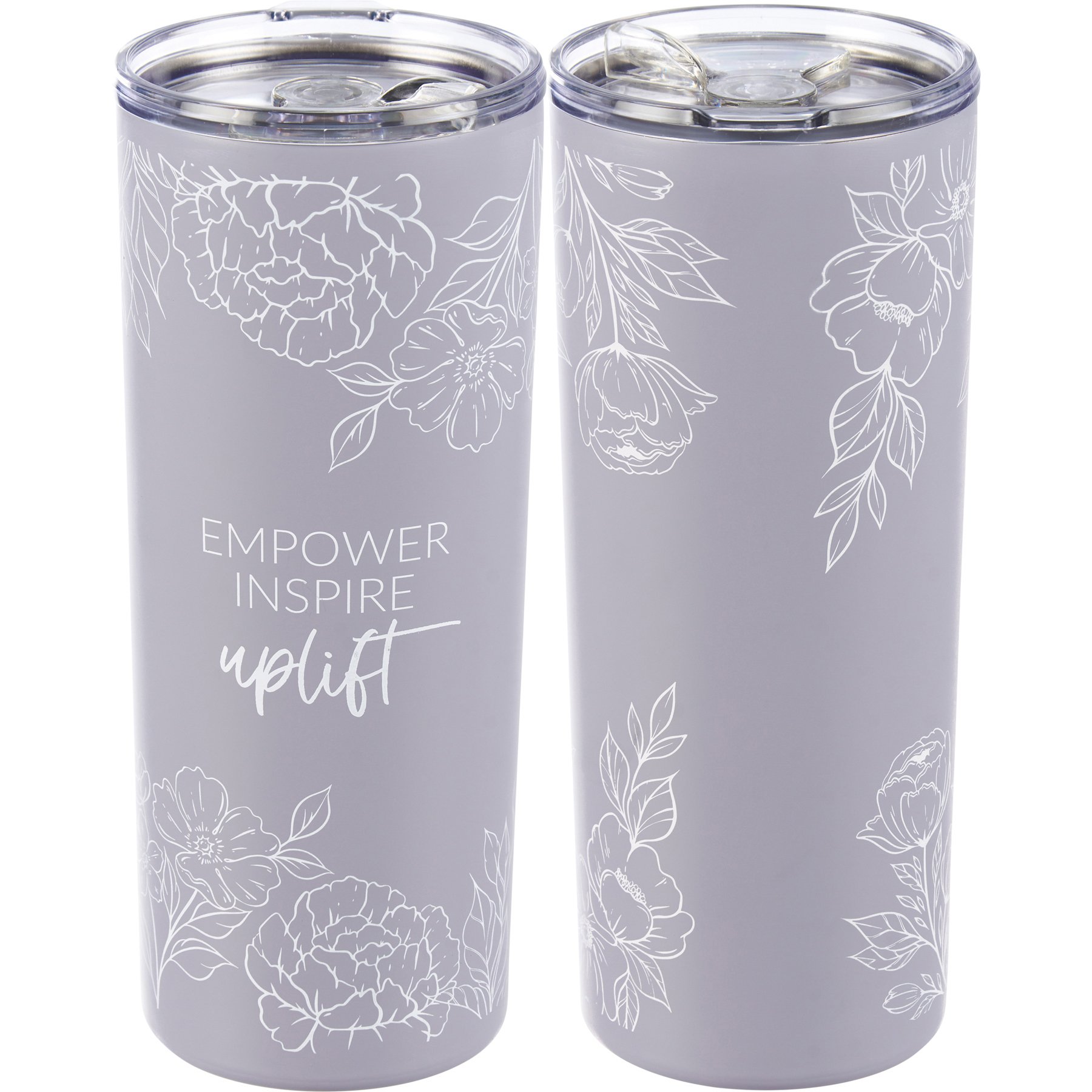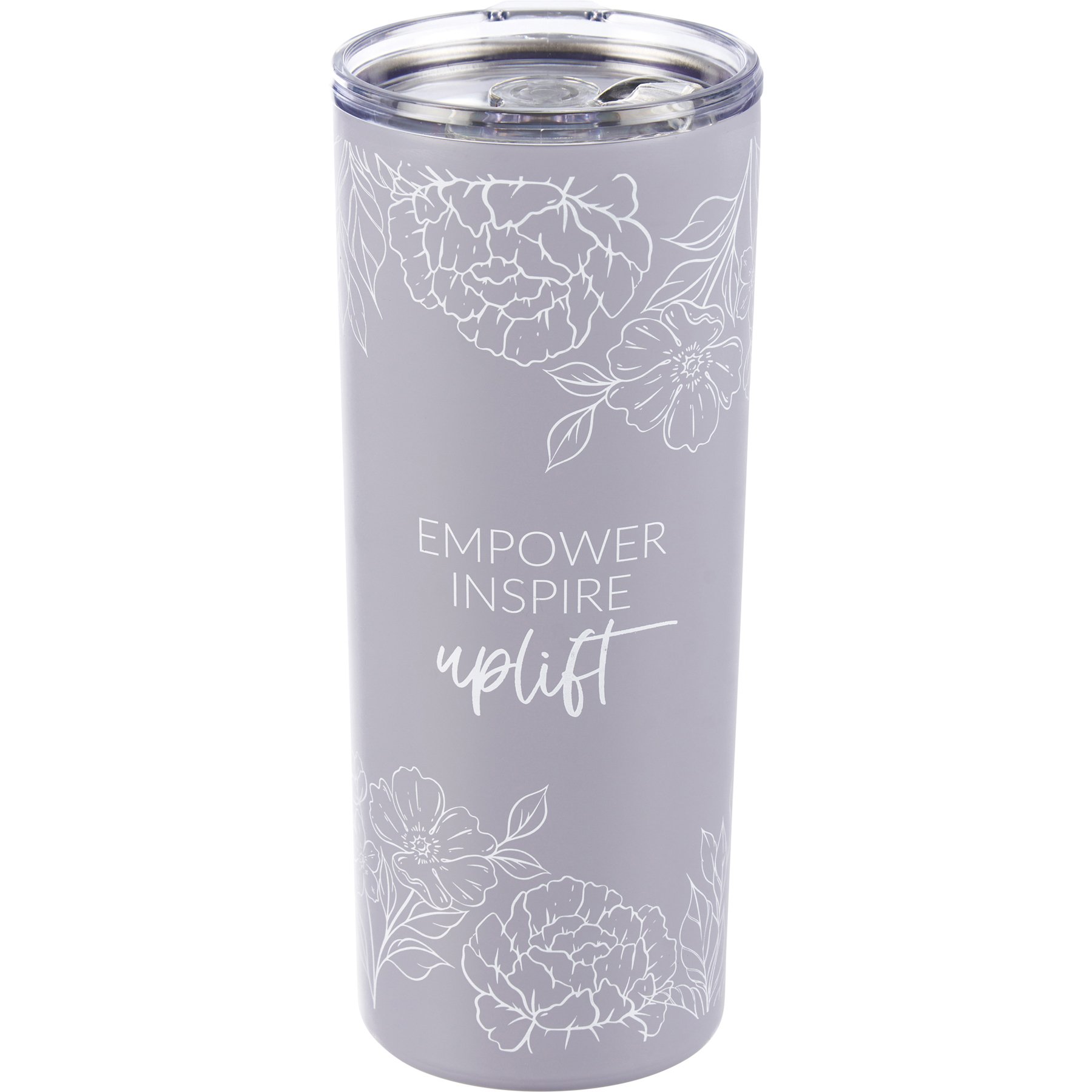 A 20 oz stainless steel coffee tumbler from our Empowerment Collection displaying a full wrap-around design of elegant flowers with inspirational "Empower Inspire Uplift" sentiment. Our Empower Inspire Uplift coffee tumbler is insulated to keep beverages hot for 4 hours or cold for 6 hours and includes a plastic lid with rubber seal. Hand-wash only; do not microwave. BPA free. A portion of the proceeds from the sale of this Benefit Item will be donated to ASSETS, a non-profit organization focused on transforming communities by increasing business ownership among women and people of color.