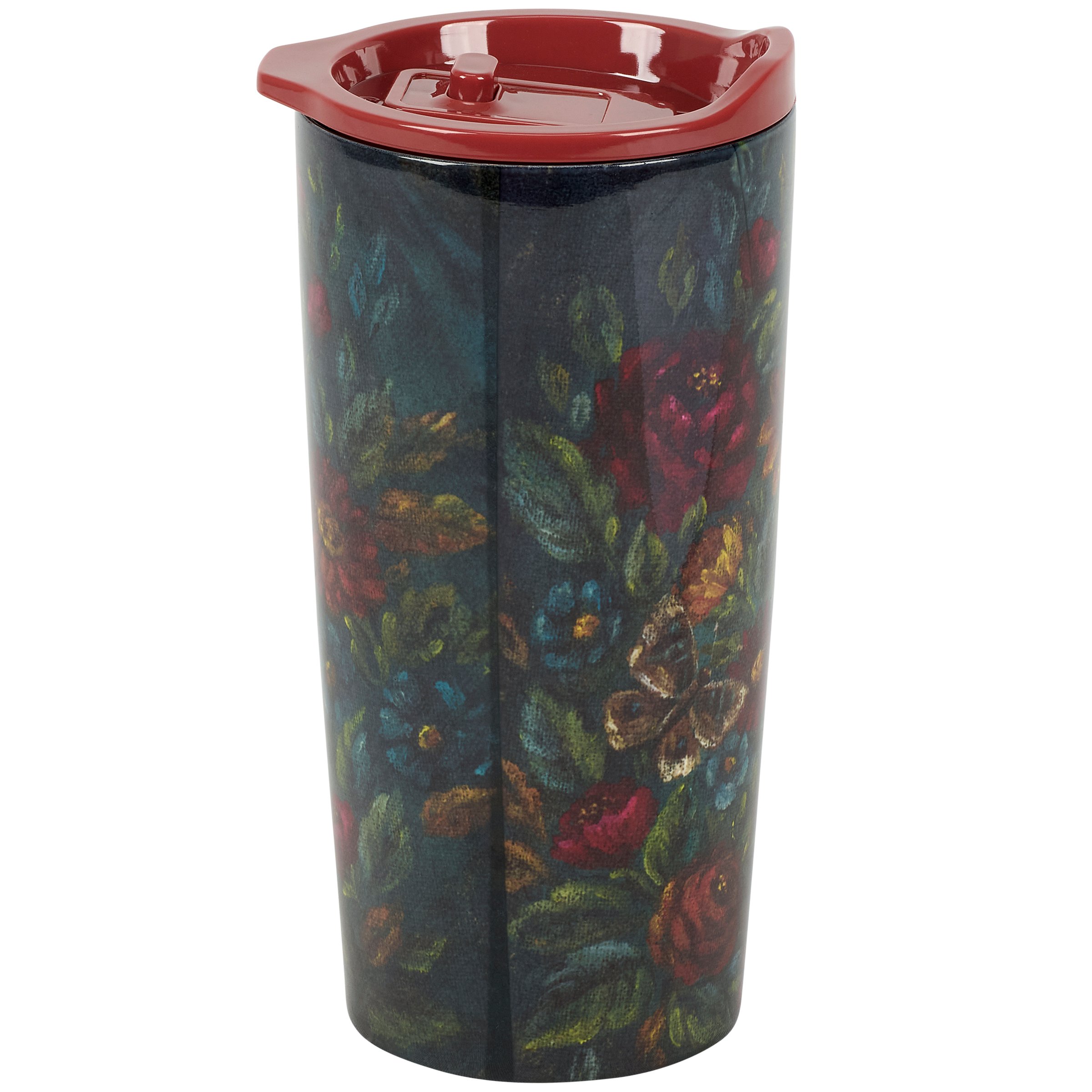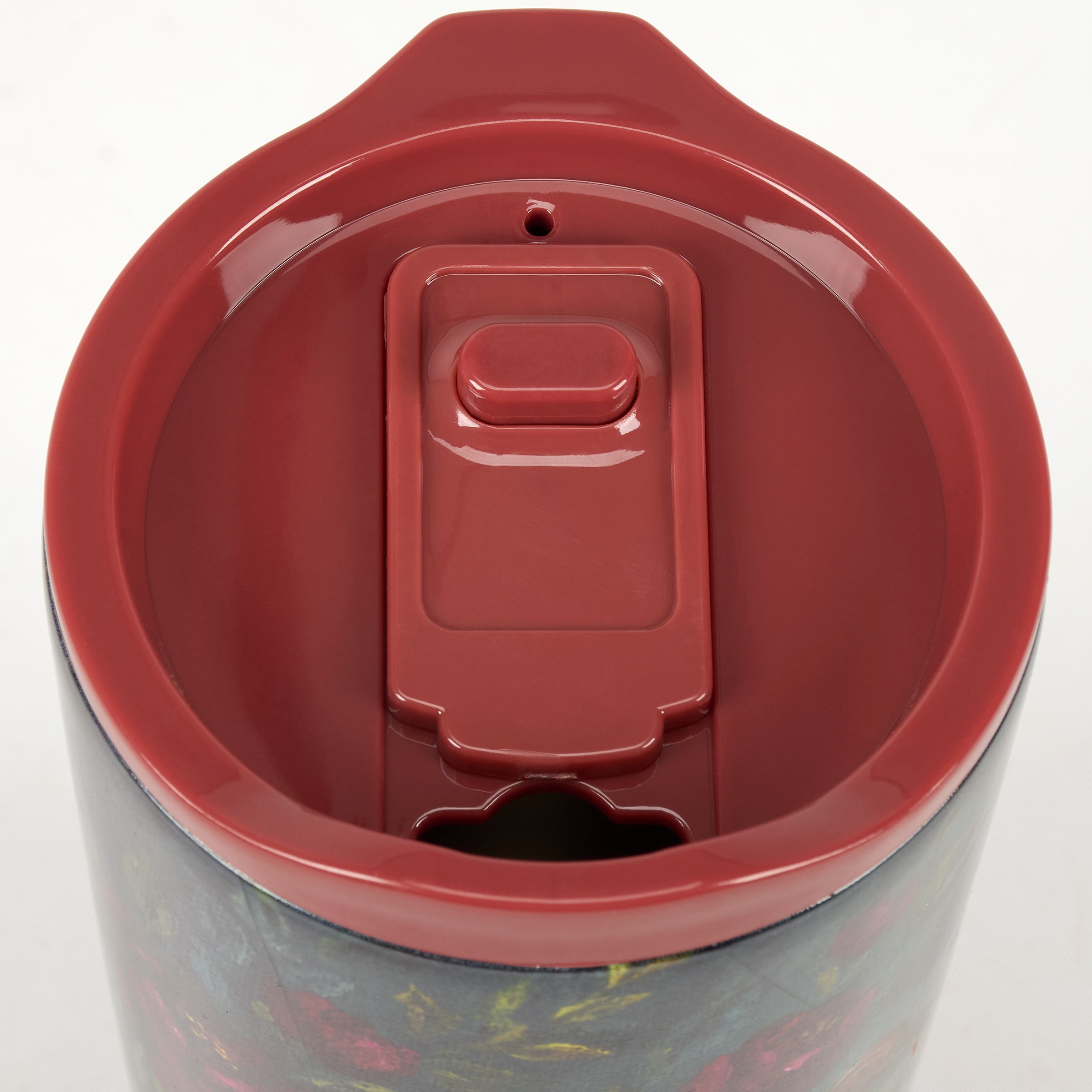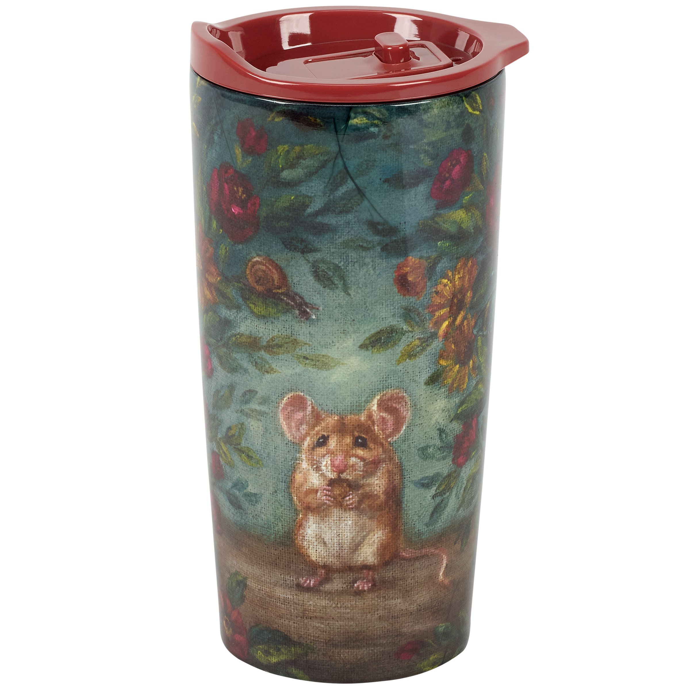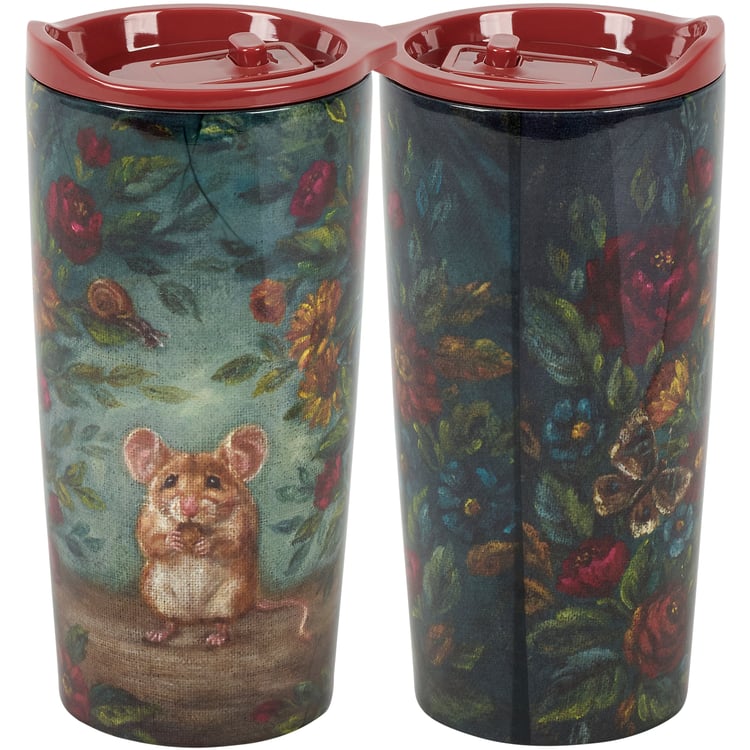 A 20 oz stainless steel coffee tumbler from our Jewel Tone Fall Collection featuring a full wrap-around design displaying a charming scene of a field mouse surrounded by fall florals in a jewel tone color palette. Fall mouse design is replicated from original artwork painted onto burlap canvas, giving the art a unique depth and texture. Our Field Mouse coffee tumbler is insulated to keep beverages hot for 4 hours or cold for 6 hours and includes a coordinating red plastic lid with a push button spout. Stainless steel tumbler is hand wash only; not microwave safe. A stylish fall-themed gift perfect for on-the-go or at home.
