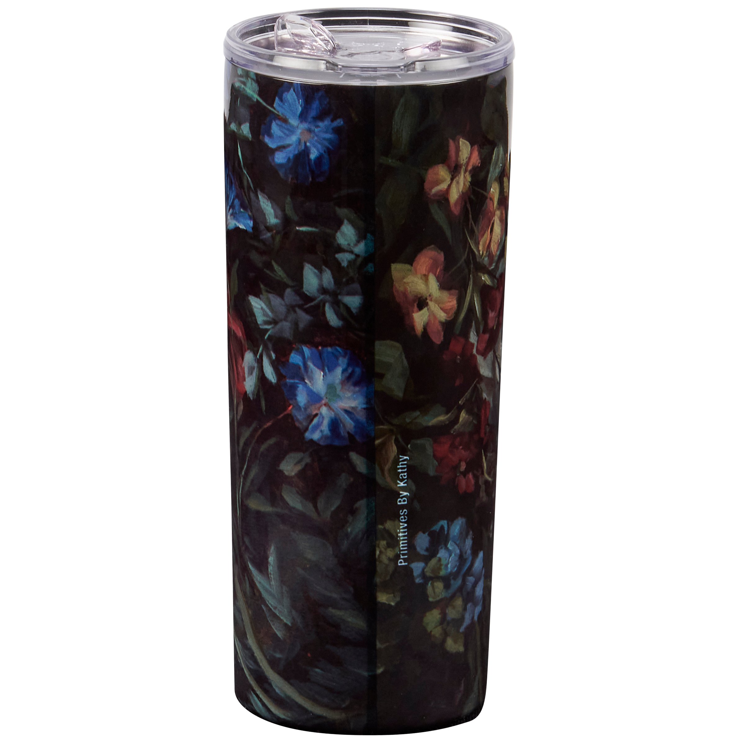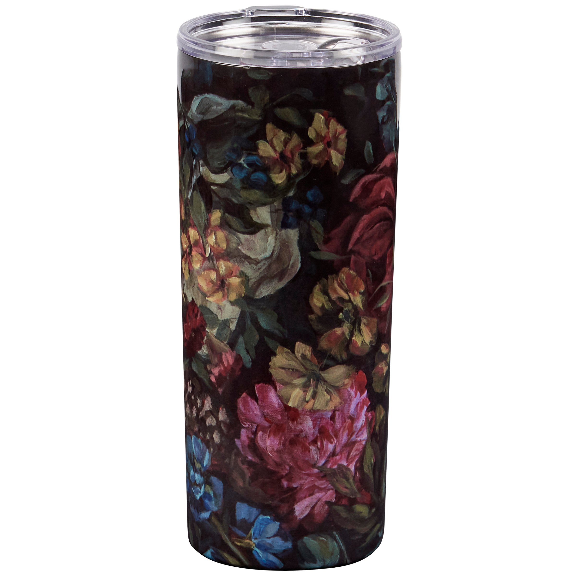 A 20 oz stainless steel coffee tumbler from our Moody Collection displaying a full wrap-around design of stylish hand painted florals in a deep color palette. Design is replicated from original artwork hand painted in a unique watercolor style. Our Moody Floral coffee tumbler is insulated to keep beverages hot for 4 hours or cold for 6 hours and includes a plastic lid with rubber seal. Hand wash only; do not microwave. BPA free. A stylish accessory perfect for on-the-go or at home use.