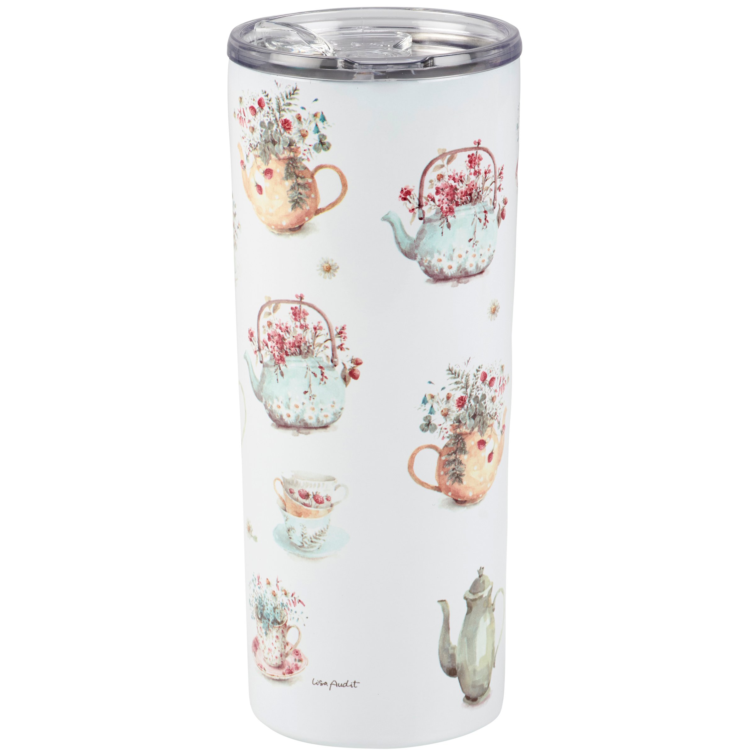 A 20 oz stainless steel coffee tumbler from our Tea & Coffee Collection displaying an all-over design of teapots, tea kettles, and teacups filled with flowers in a delicate hand painted style. Design also features an uplifting "My Cup Of Happy" sentiment. Our My Cup Of Happy coffee tumbler is insulated to keep beverages hot for 4 hours or cold for 6 hours and includes a plastic lid with rubber seal. Hand-wash only; do not microwave. BPA free. A charming everyday accessory perfect for on-the-go or at home.
