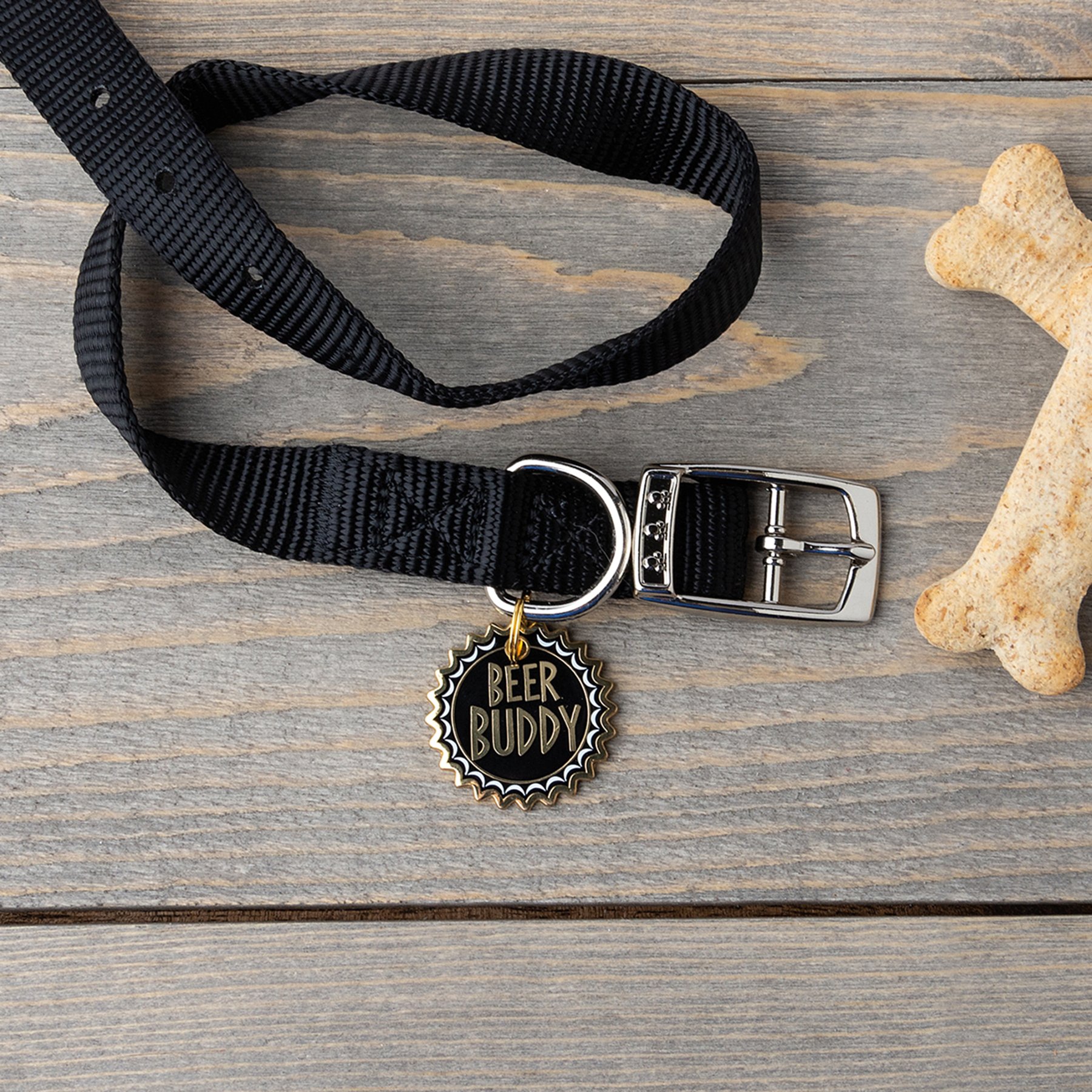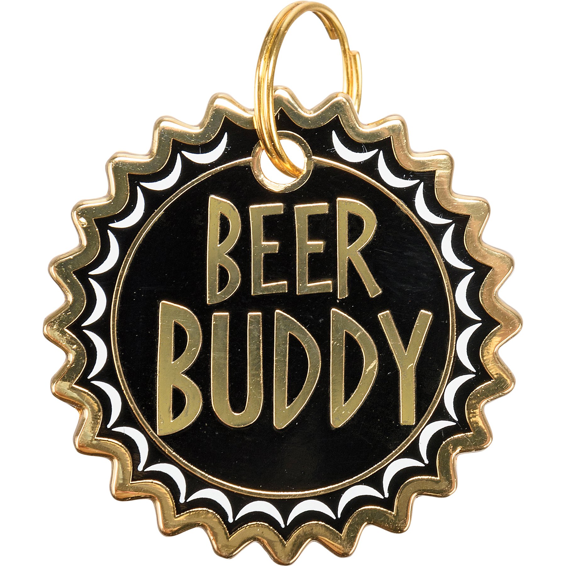 A high-quality, hard enamel collar charm featuring a hand lettered "Beer Buddy" sentiment, gold metal split ring to attach to a collar, and beer bottle cap design for added interest. Our Beer Buddy collar charm comes attached to an illustrated dog backer card in a plastic bag for easy hanging.
