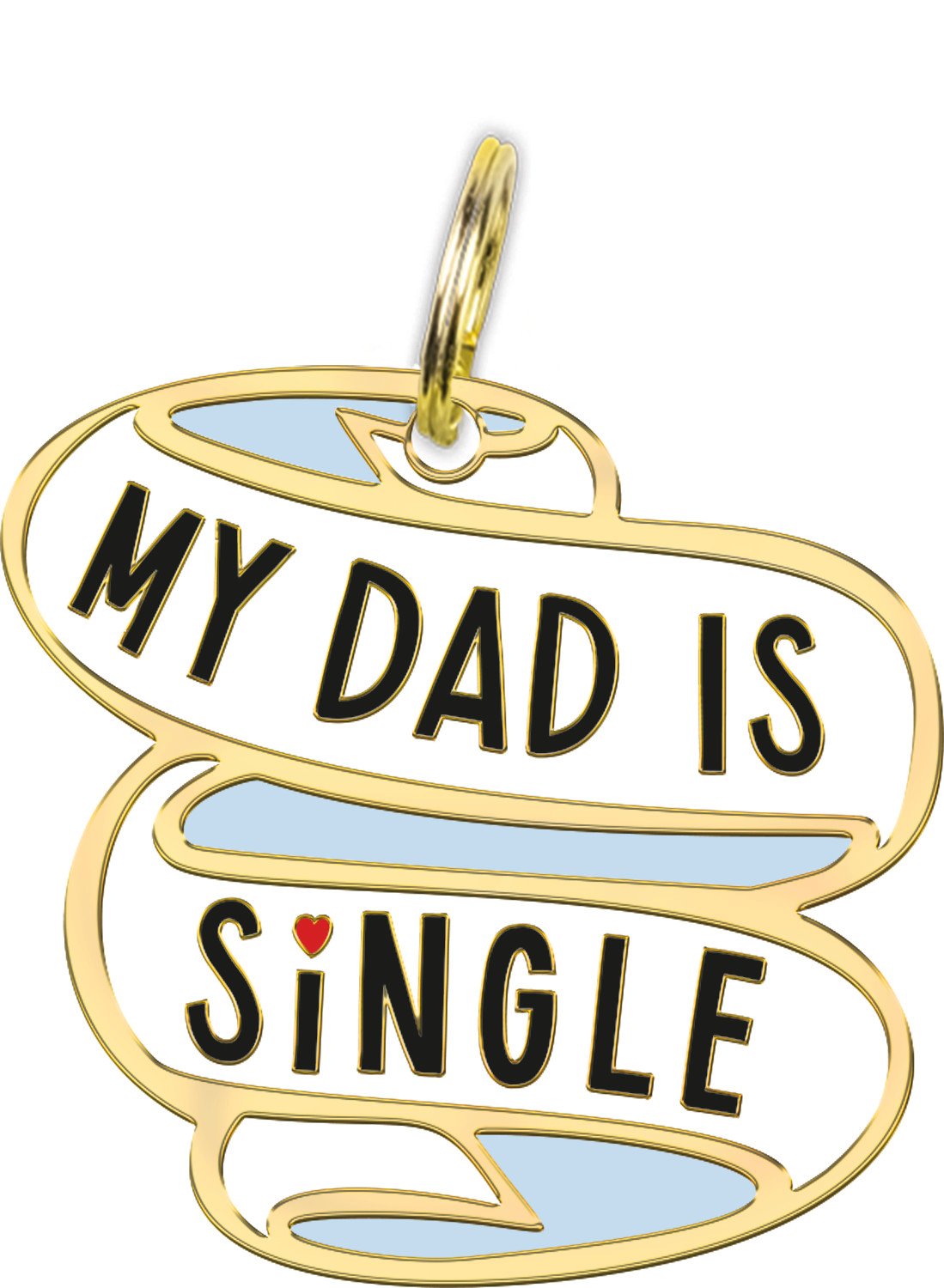 A high quality, hard enamel pet charm lending a "My Dad Is Single" sentiment. Features gold metal split ring to attach to a collar. Comes attached to a dog backer card.