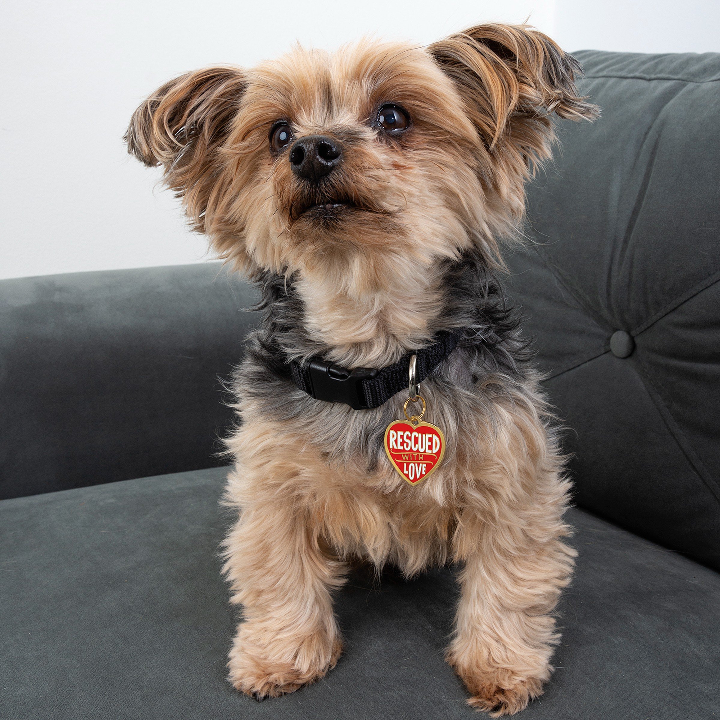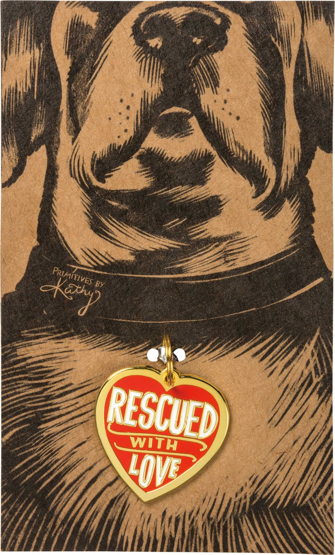 A high-quality, hard enamel collar charm featuring a "Rescued With Love" sentiment with an original, hand-illustrated design to add playful personality! Our collar charm is attached to an illustrated dog backer card in plastic bag for easy hanging. Back of our collar charm is safe to be engraved without damaging front enamel. Part of our best-selling Pet Collection.