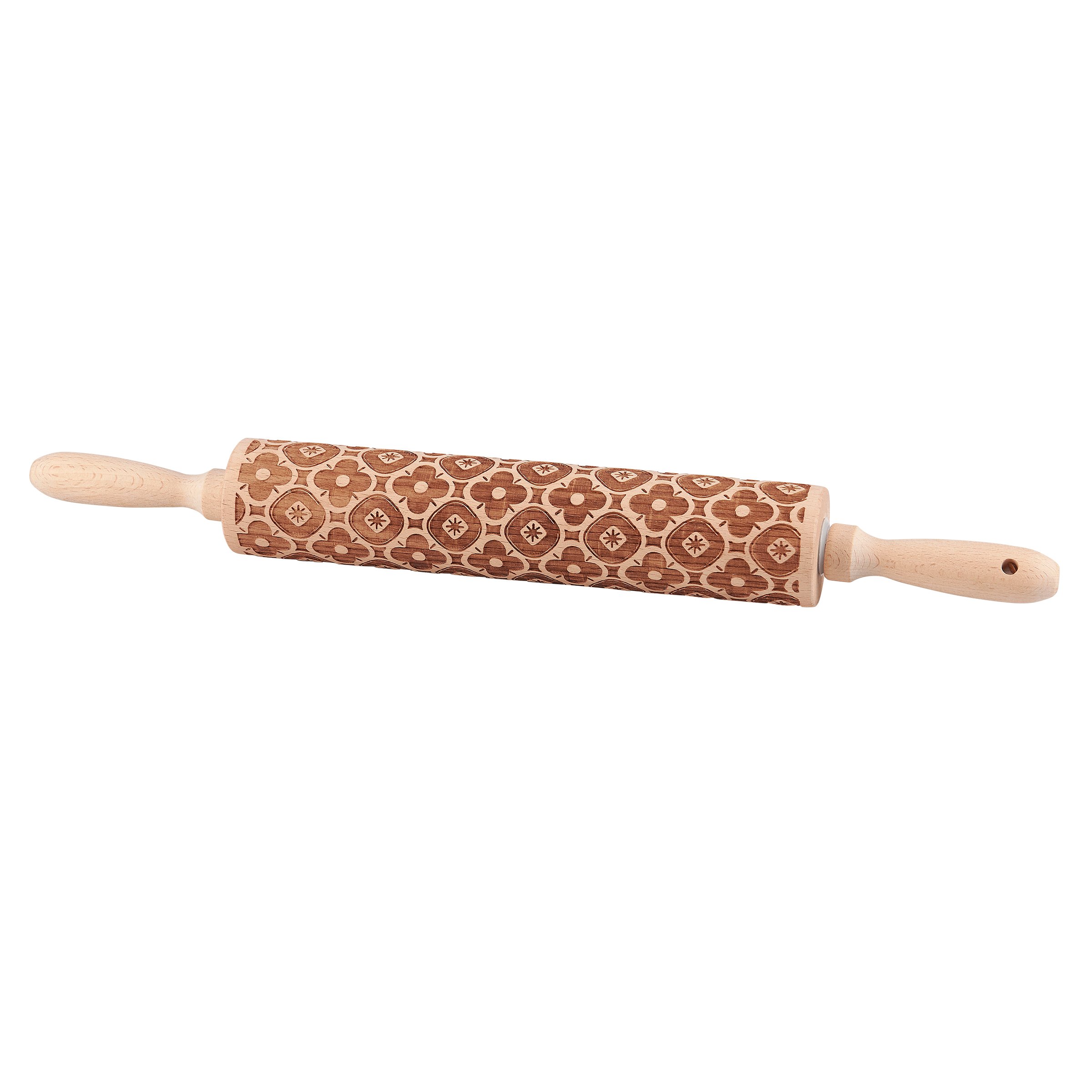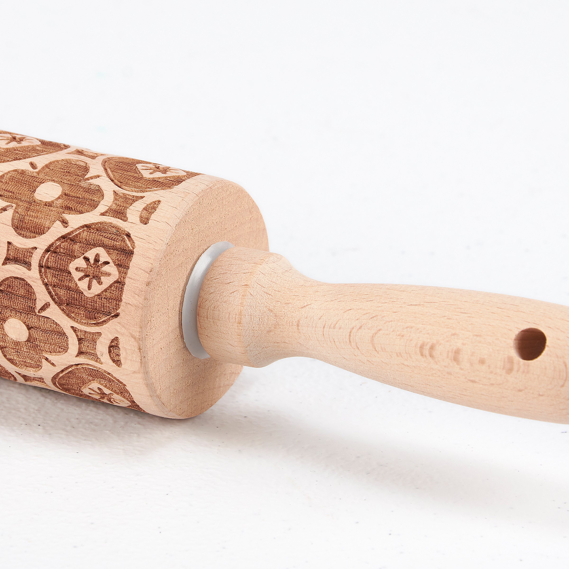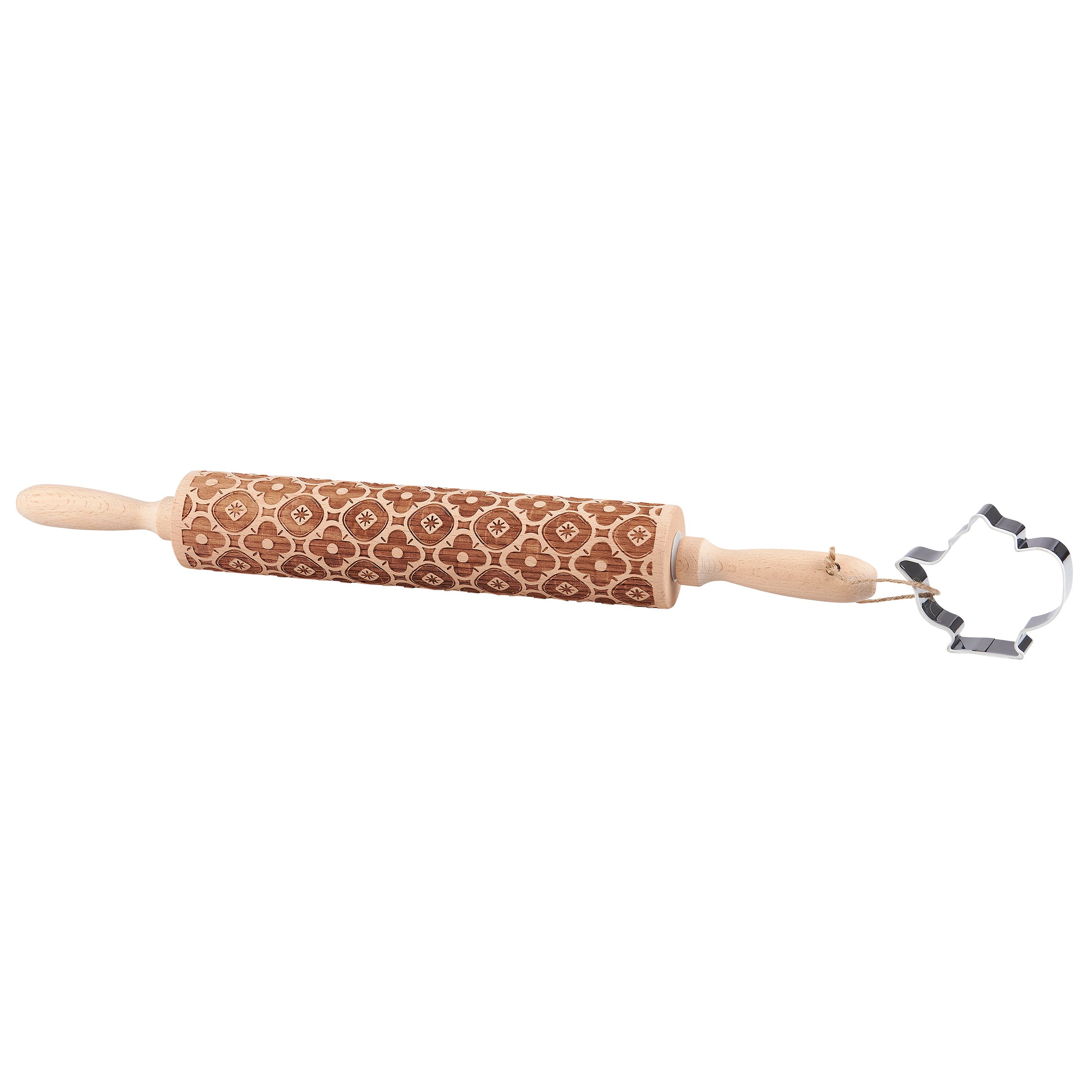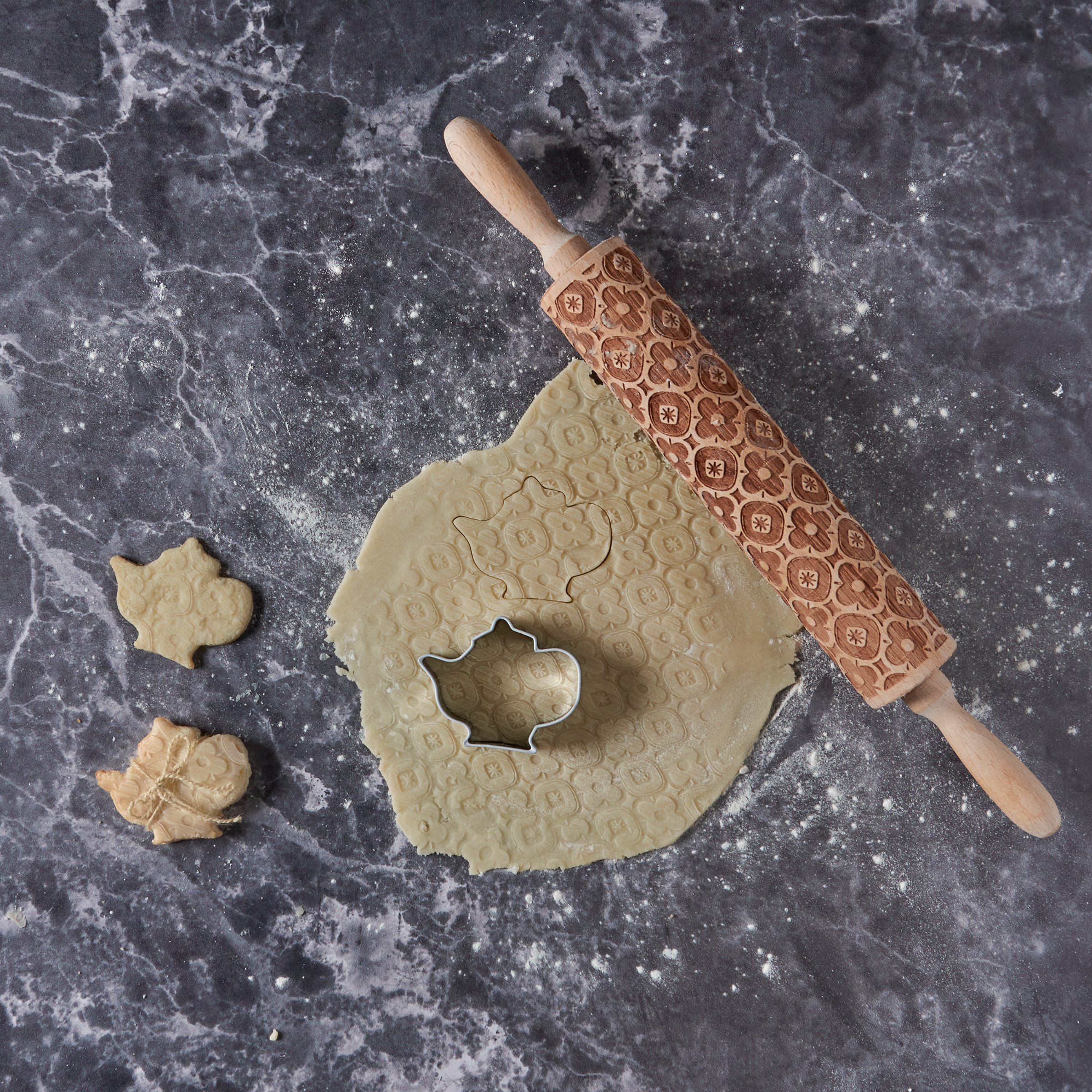 A cookie baking set from our Tea & Coffee Collection featuring a teapot shaped cookie cutter and large wooden rolling pin with debossed designs along the roller that create an elegant embossed pattern on pre-rolled dough. Our Tea Pot cookie baking set features natural beech wood for the rolling pin and is hand-wash recommended. Cookie cutter is tied to rolling pin with jute. A fun everyday kitchen accessory that is also great for gifting.