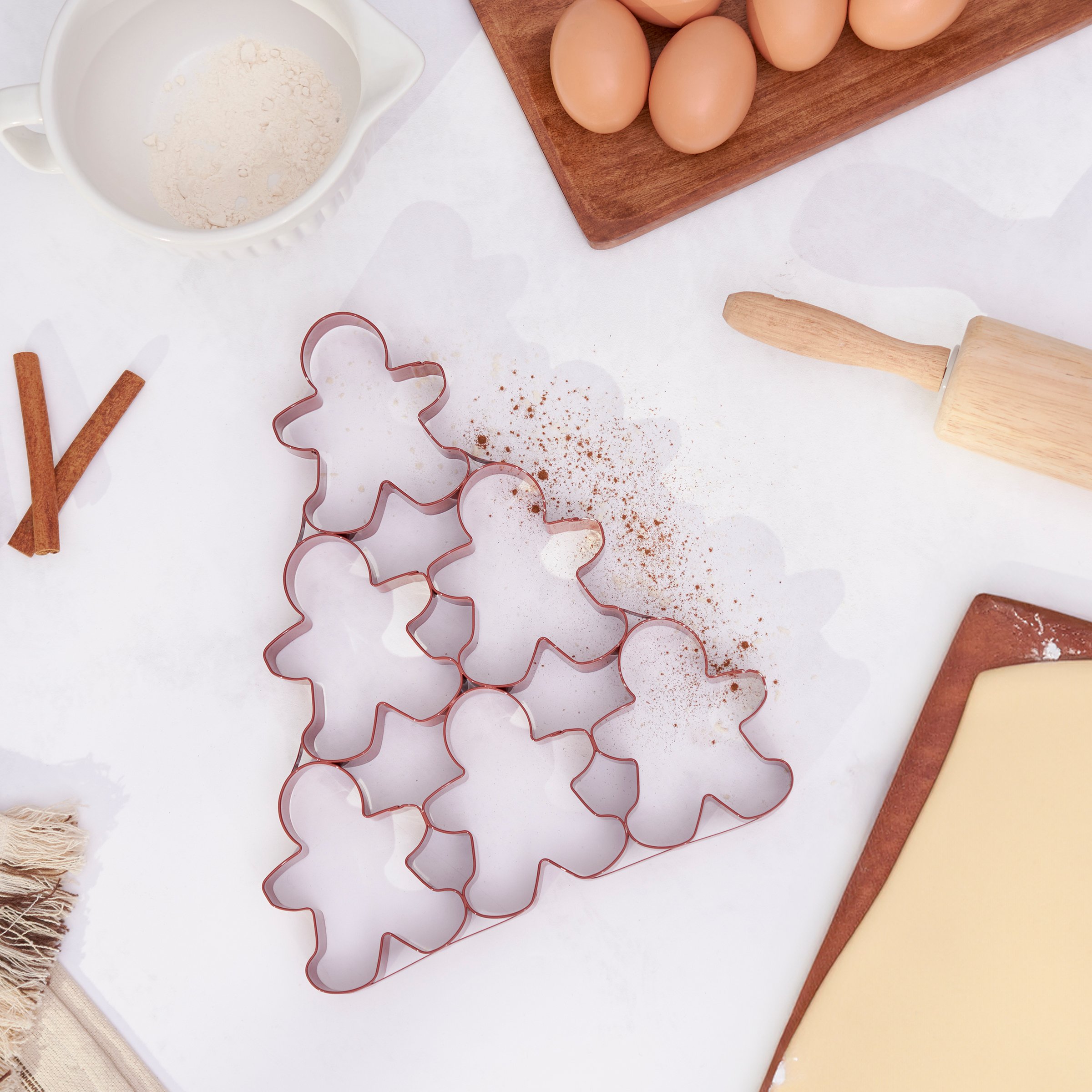 A metal cookie cutter from our Christmas Collection displaying a unique gingerbread man tree design. Seasonal cookie cutter features 6 gingerbread men cookie cutters connected together to form a tree shape with the ability to cut 6 cookies at once for a fun baking experience. Our Gingerbread Man Tree cookie cutter is perfect for holiday gifting or elevating a gathering of baking Christmas treats. Hand wash recommended; not microwave safe.