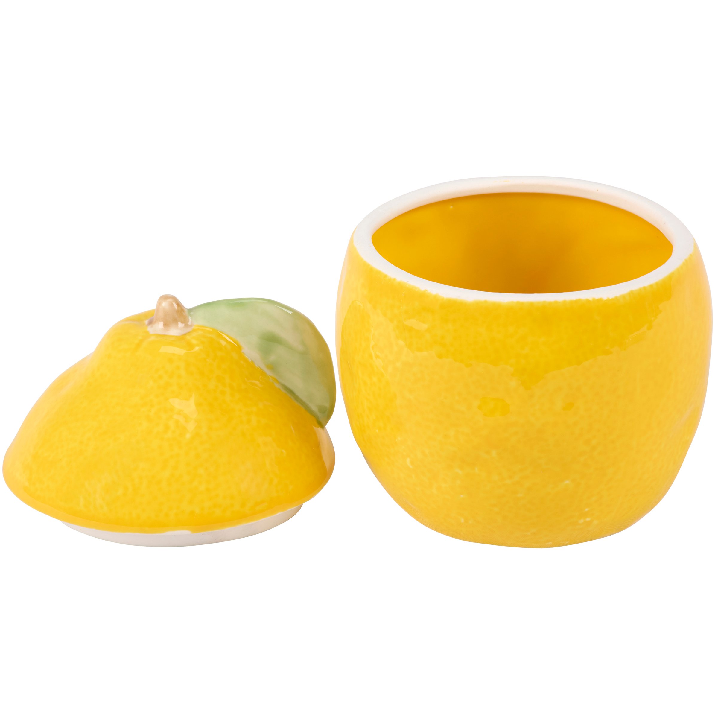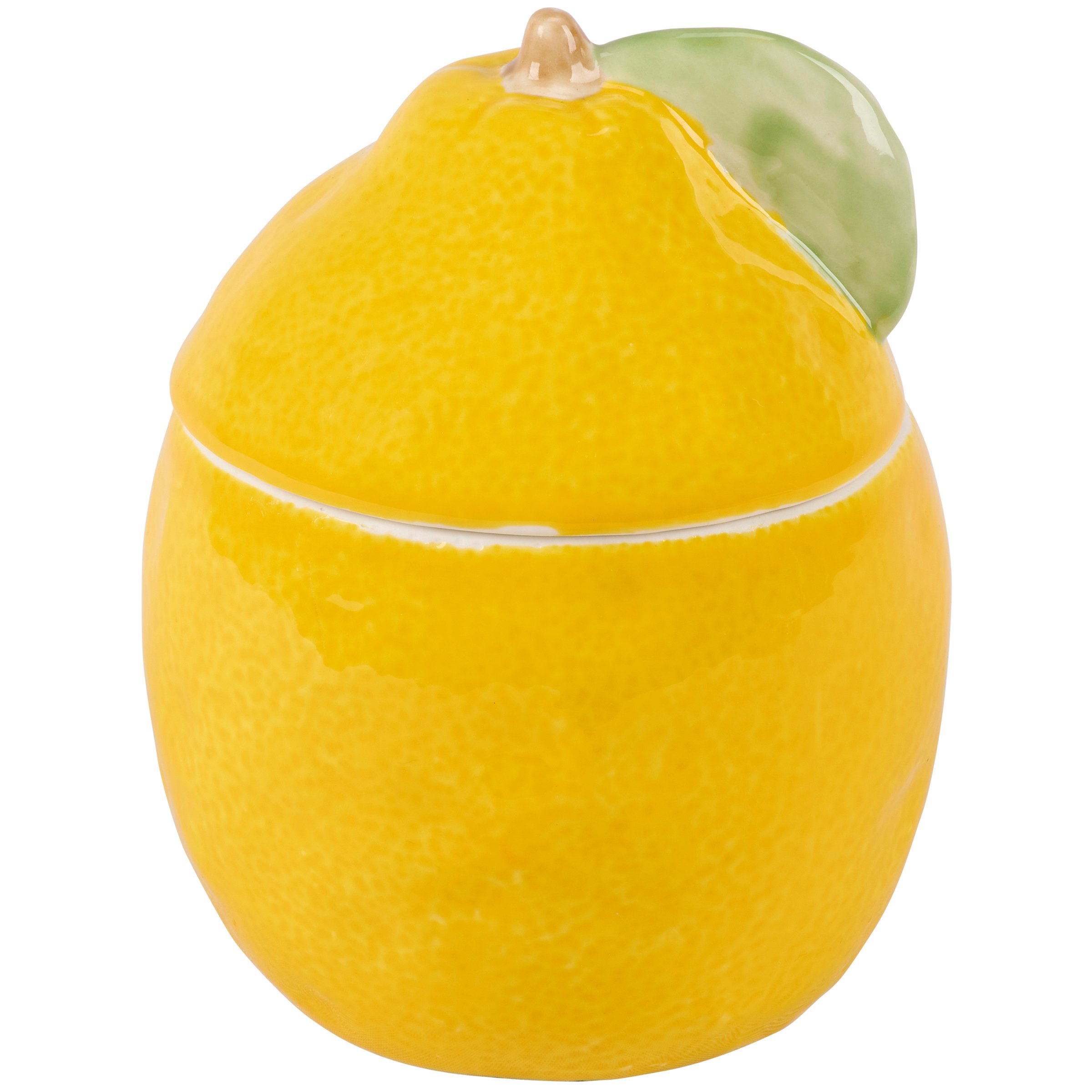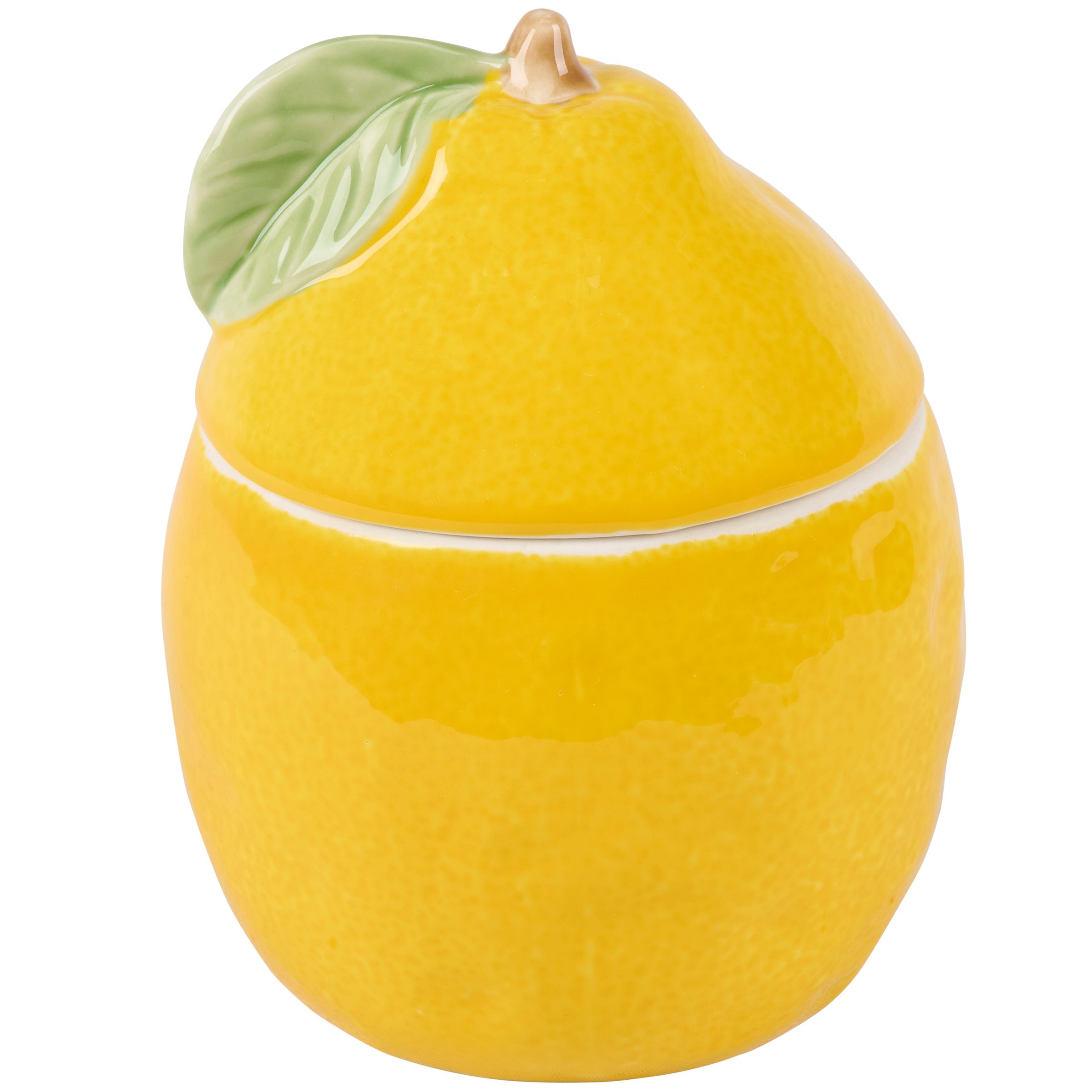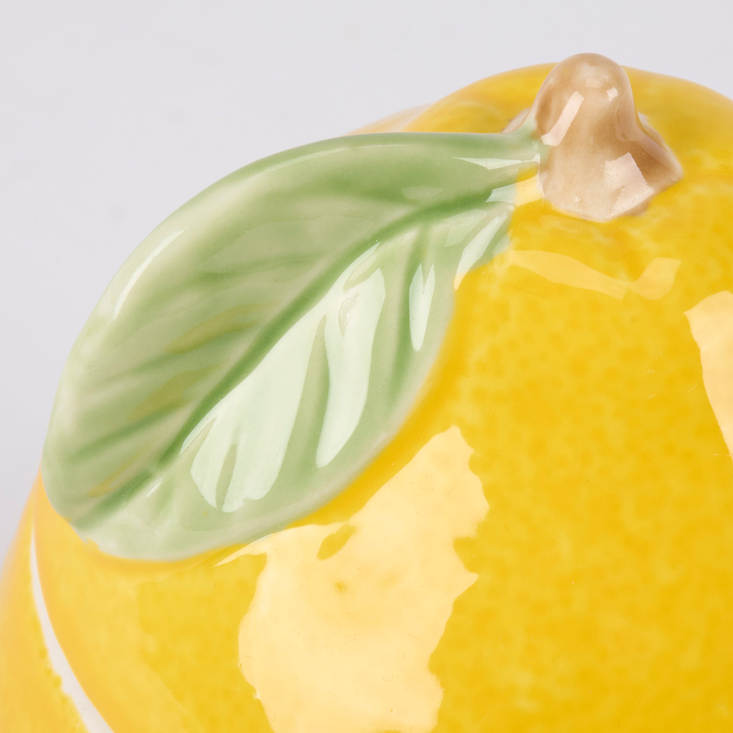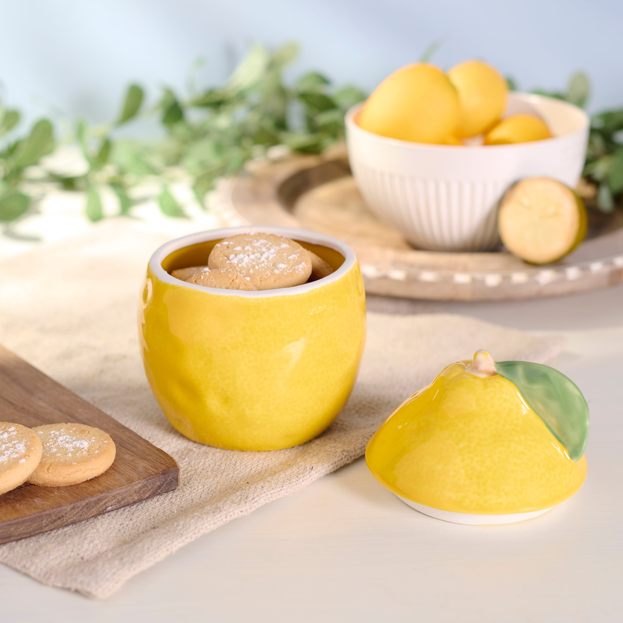 A ceramic cookie jar from our Garden Collection displaying a lemon inspired design with textured glaze finish and sculpted leaf details to resemble the features of a lemon that easily add personality to any tablescape or kitchen. Hand wash only. Our Lemon cookie jar is a fun lemon-themed kitchen accessory perfect for storing everyday treats.