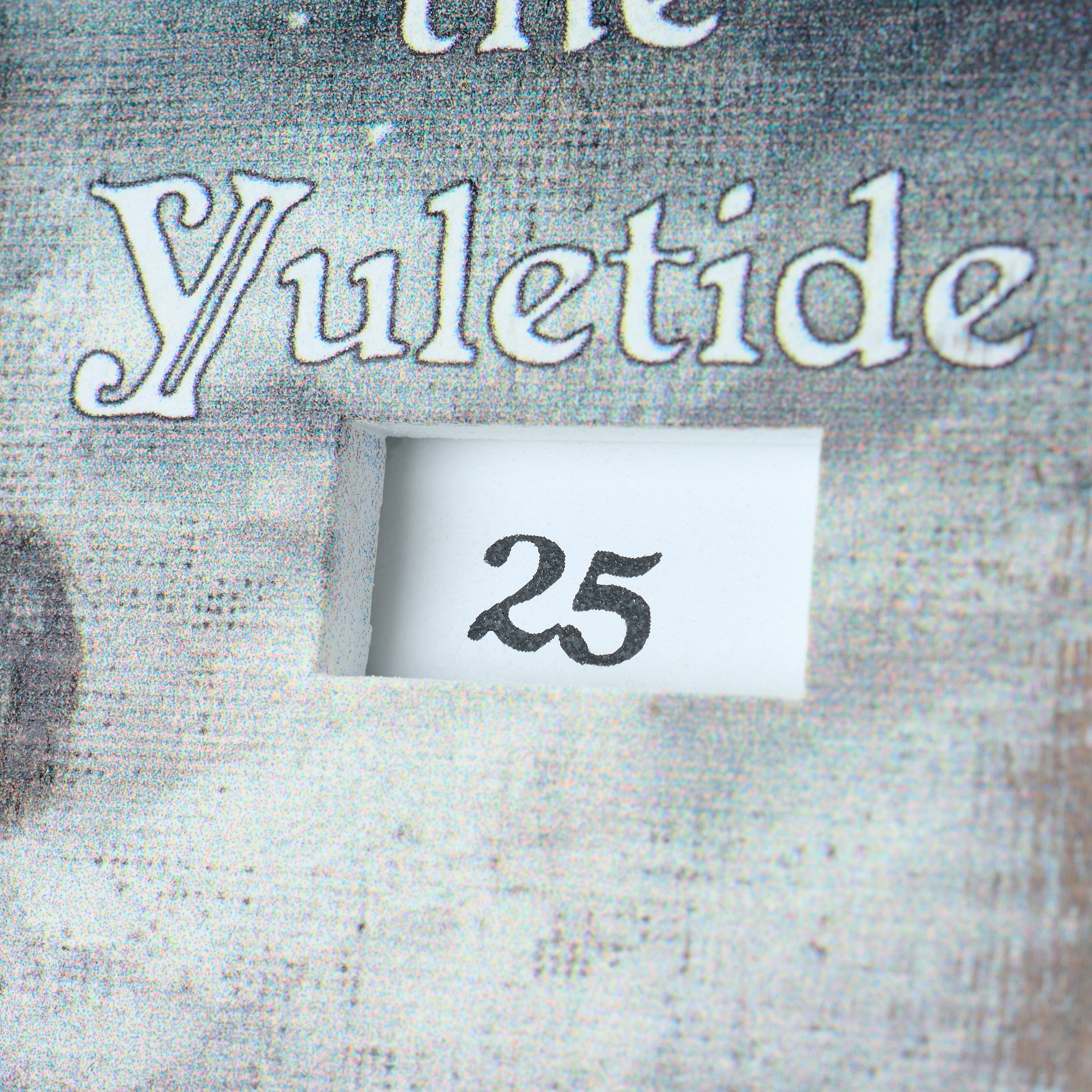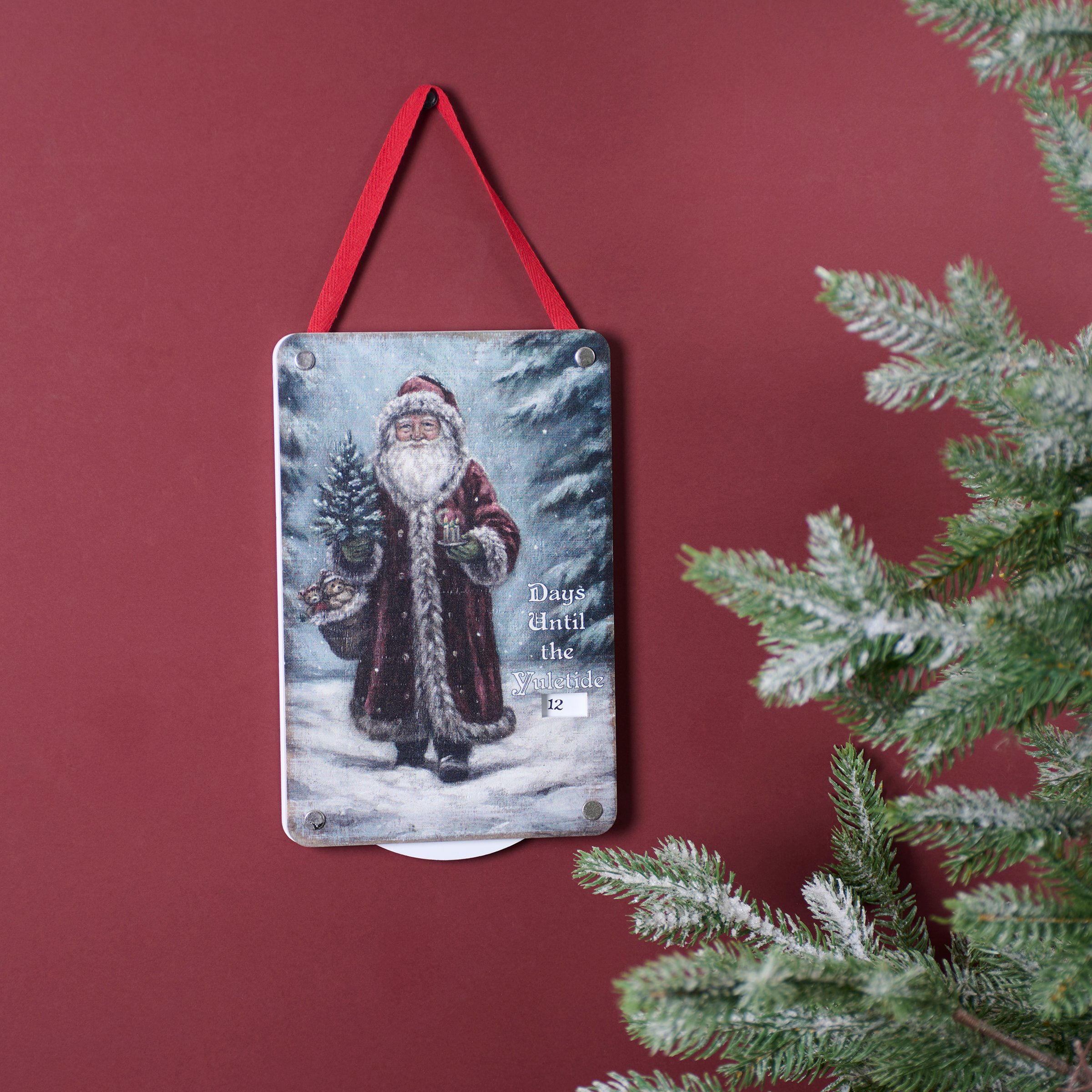A wooden countdown wheel from our Christmas Collection displaying a winter scene of vintage old world Santa with a number window and a "Days Until The Yuletide" sentiment above it. Vintage Santa design is replicated from original artwork painted onto burlap canvas, giving the art a unique depth and texture. Build excitement for the holidays using the wheel on the bottom to rotate the days left until Christmas. Our Yuletide countdown wheel is ready to hang for display via the attached red cotton tape hanger. A rustic Christmas home accent that can be easily displayed in any home or work space to build excitement for the holidays.