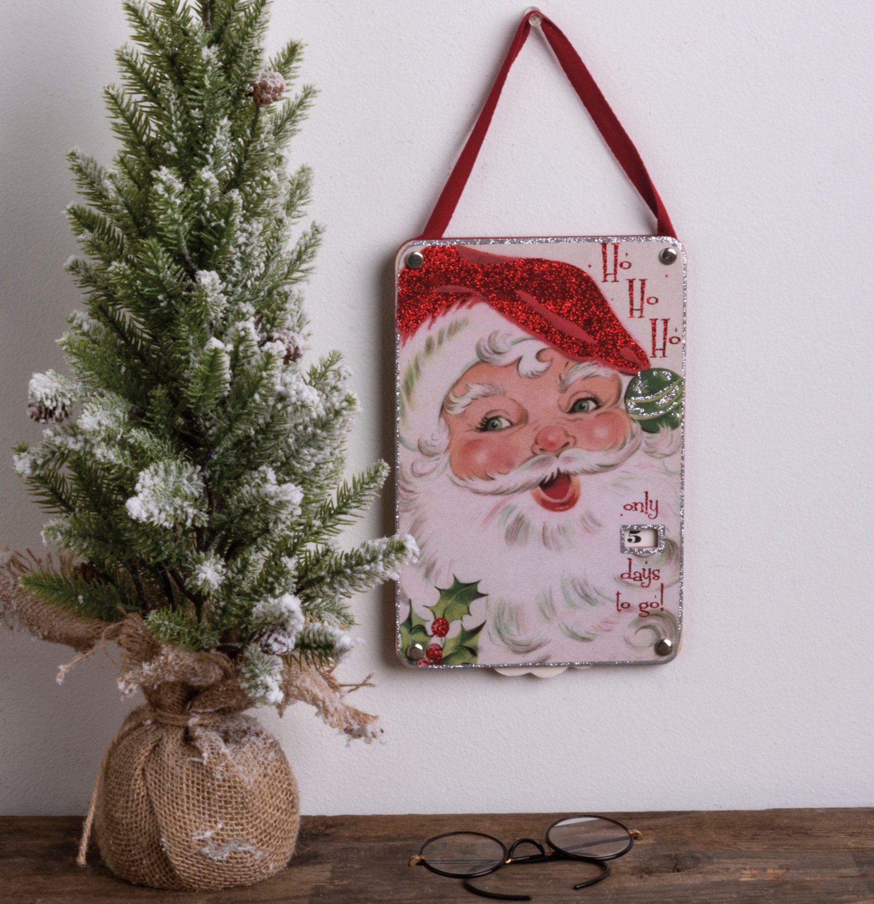 A vintage-inspired hanging countdown featuring a "Ho Ho Ho - Only __ Days To Go!" sentiment, Santa Claus design, and glitter details. Contains a side dial to display the days left!