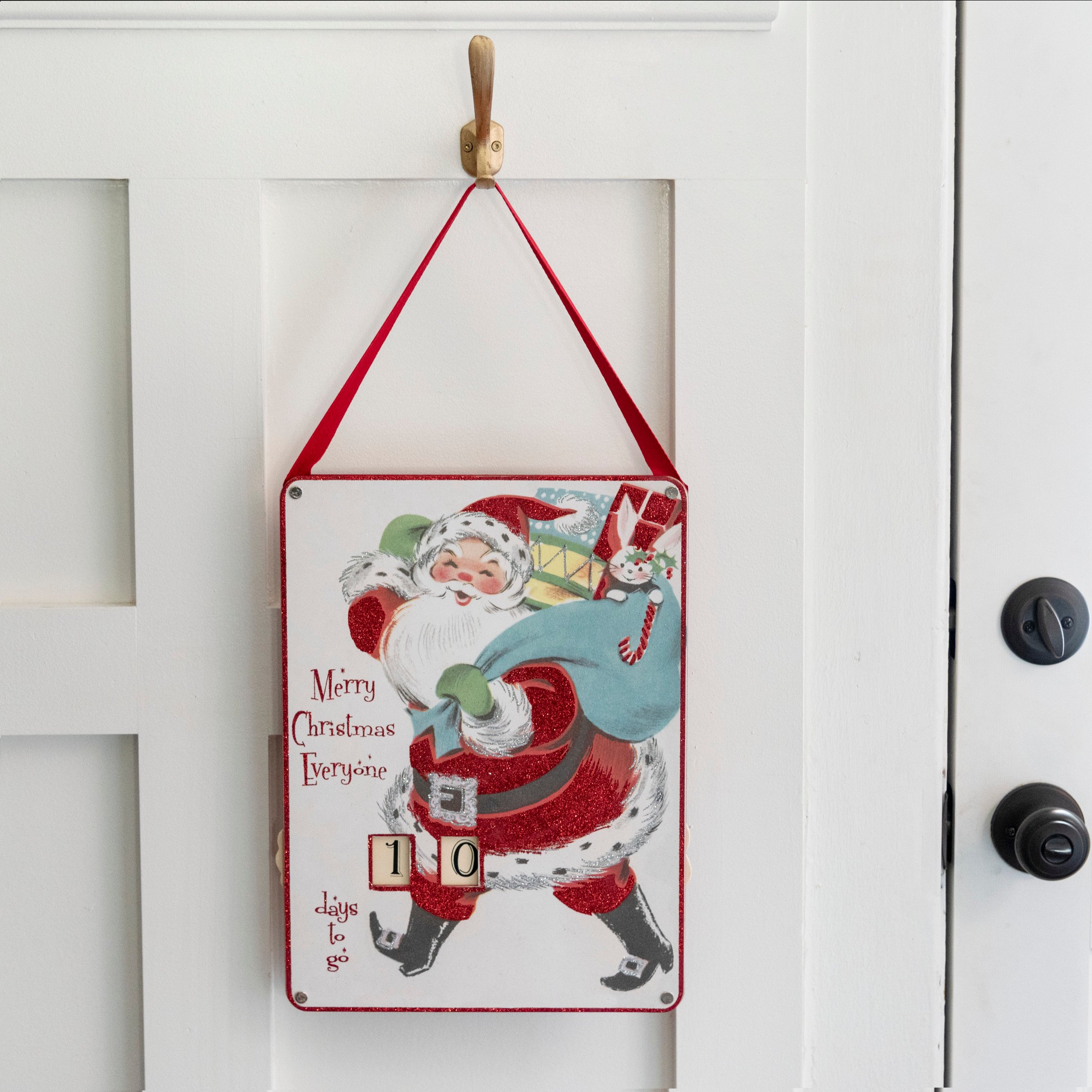 A vintage-inspired hanging countdown featuring a "Merry Christmas Everyone - __ Days To Go" sentiment, Santa Claus with toys design, and glitter details. Contains a side dial to display the days remaining!