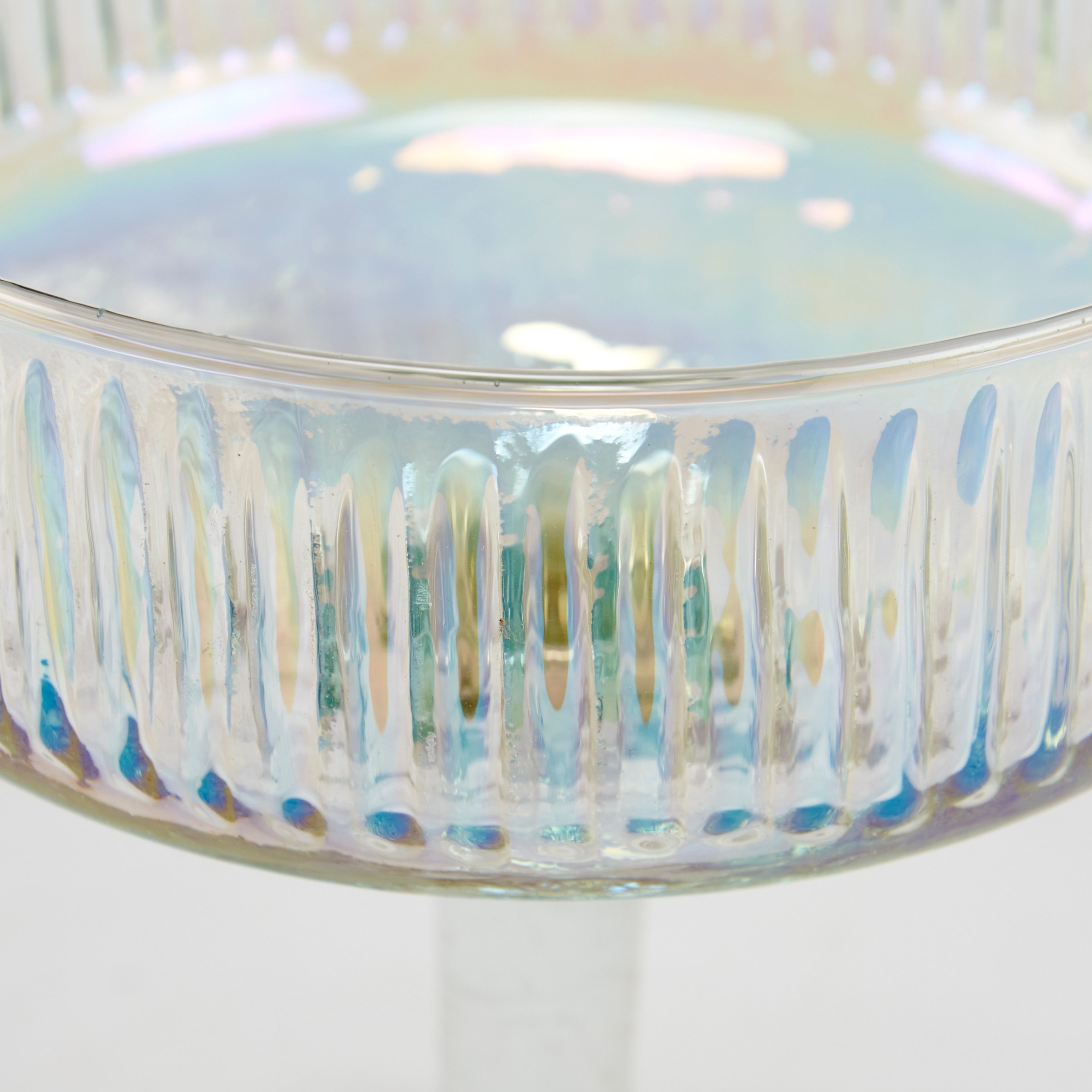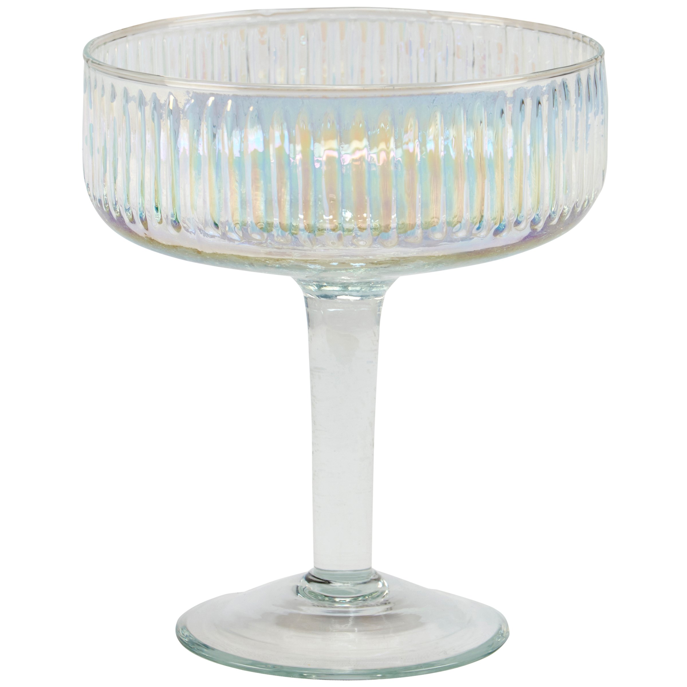 A 14 oz coupe glass displaying an art deco inspired design with ribbed accents. Our Ribbed coupe glass coordinates well with table décor from our Art Deco Collection. Hand wash only. A piece of vintage drinkware perfect for everyday gatherings.
