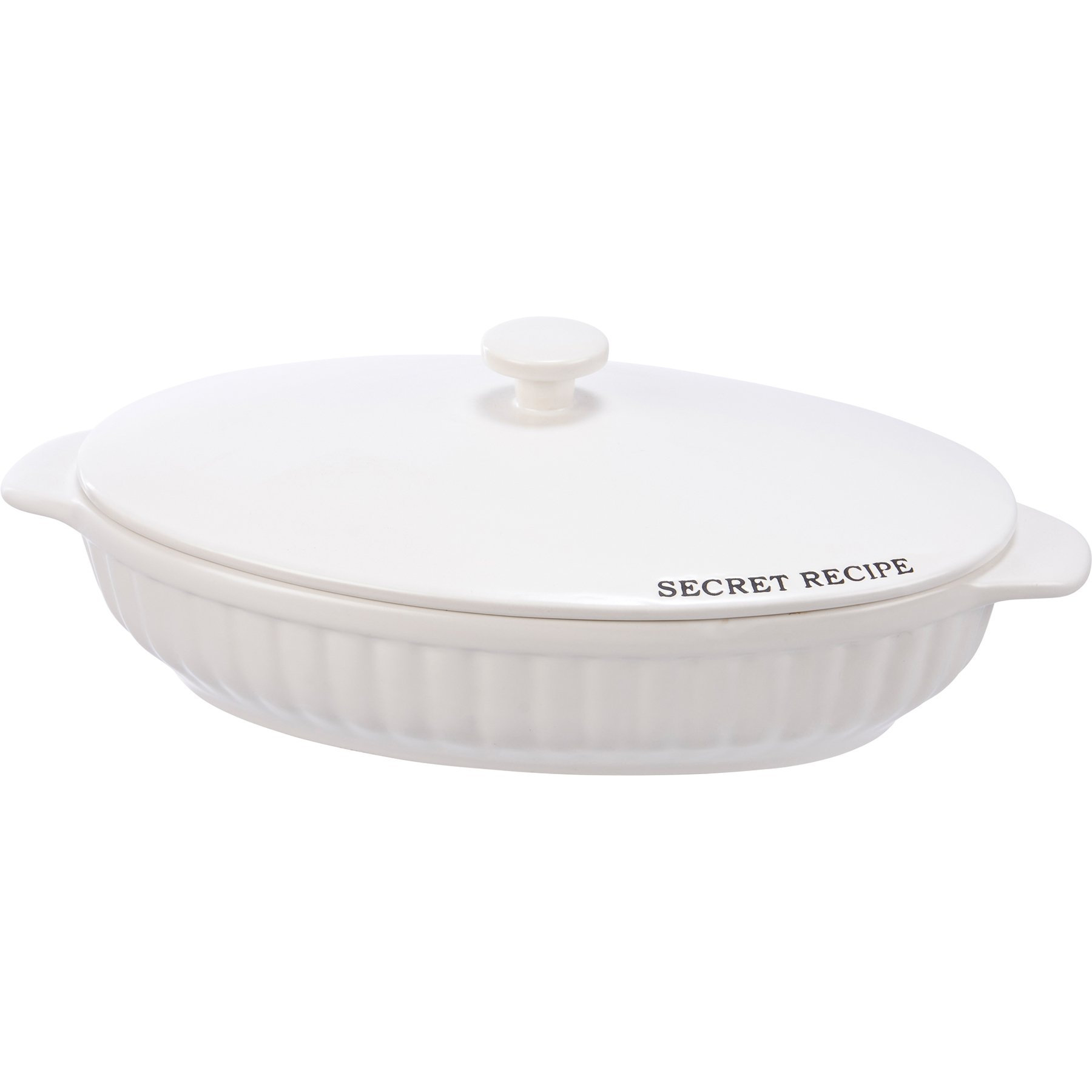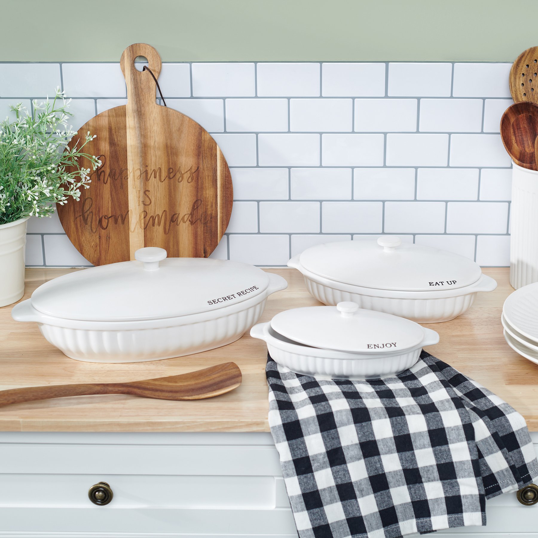 A set of three stoneware covered casserole dishes. Set includes a small, medium, and large dish with debossed "Enjoy," "Eat Up," and "Secret Recipe" sentiments on outside rims of respective stoneware lids. White dishes feature ribbed texture, "More Please" sentiment on the inside bottom of each dish, and rounded handles for easy carrying. Microwave, oven, dishwasher and food safe. This set makes a perfect addition to a farmhouse aesthetic and coordinates well with other pieces in collection!