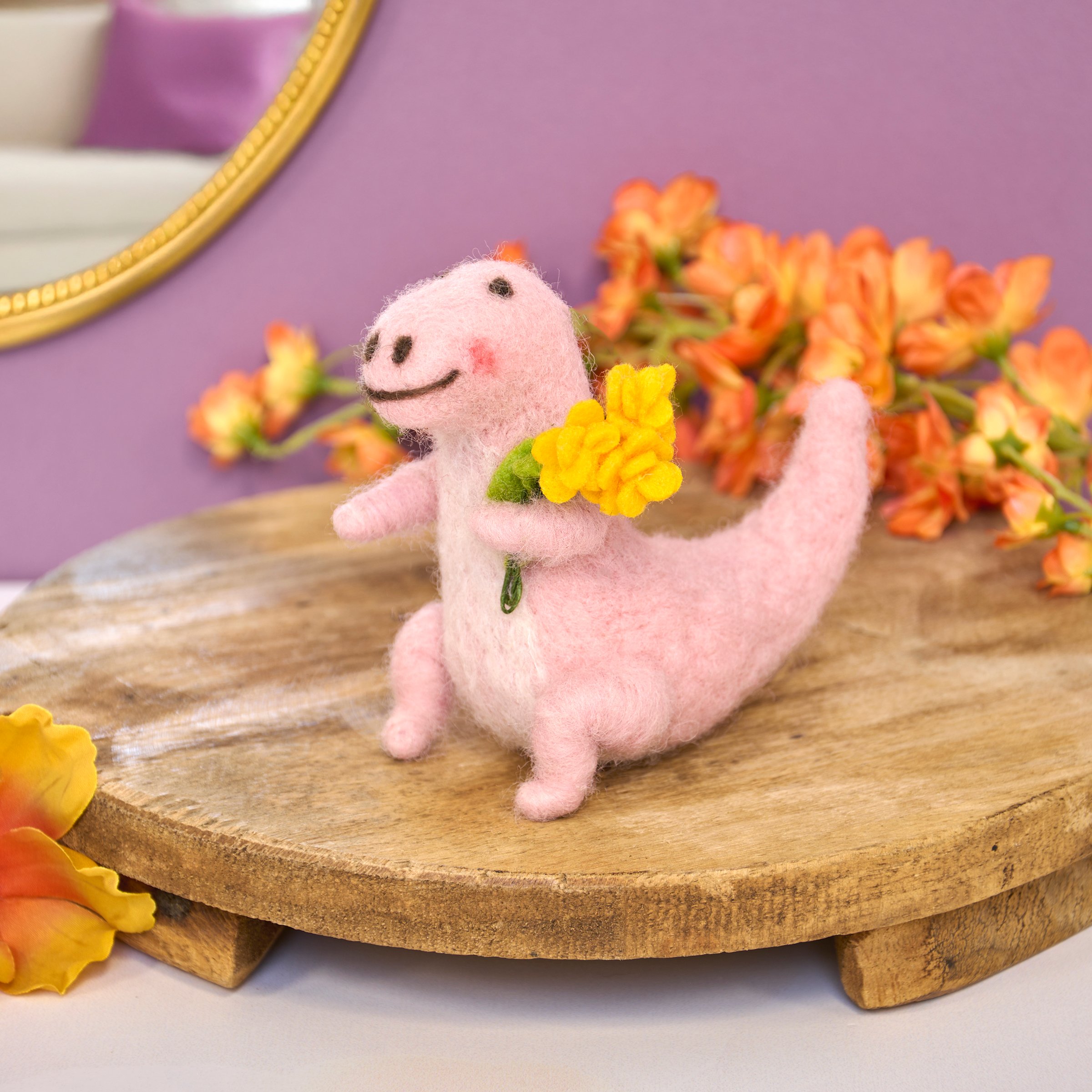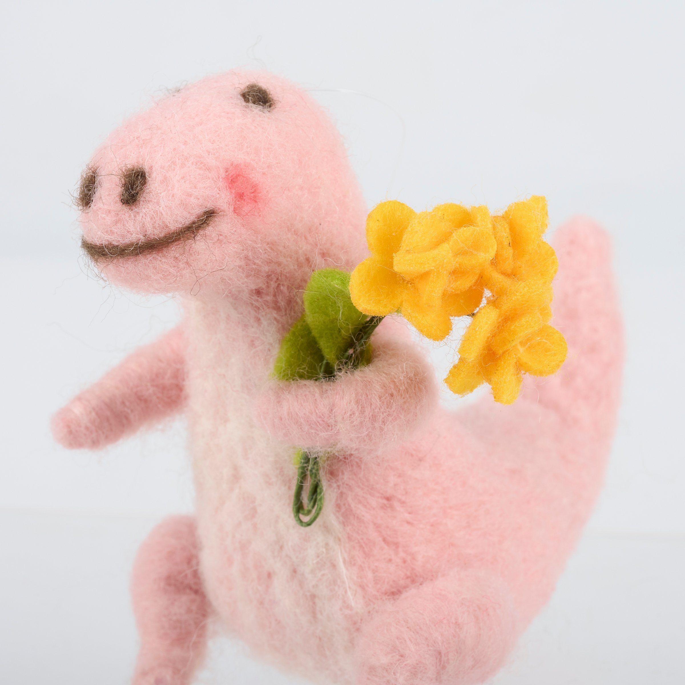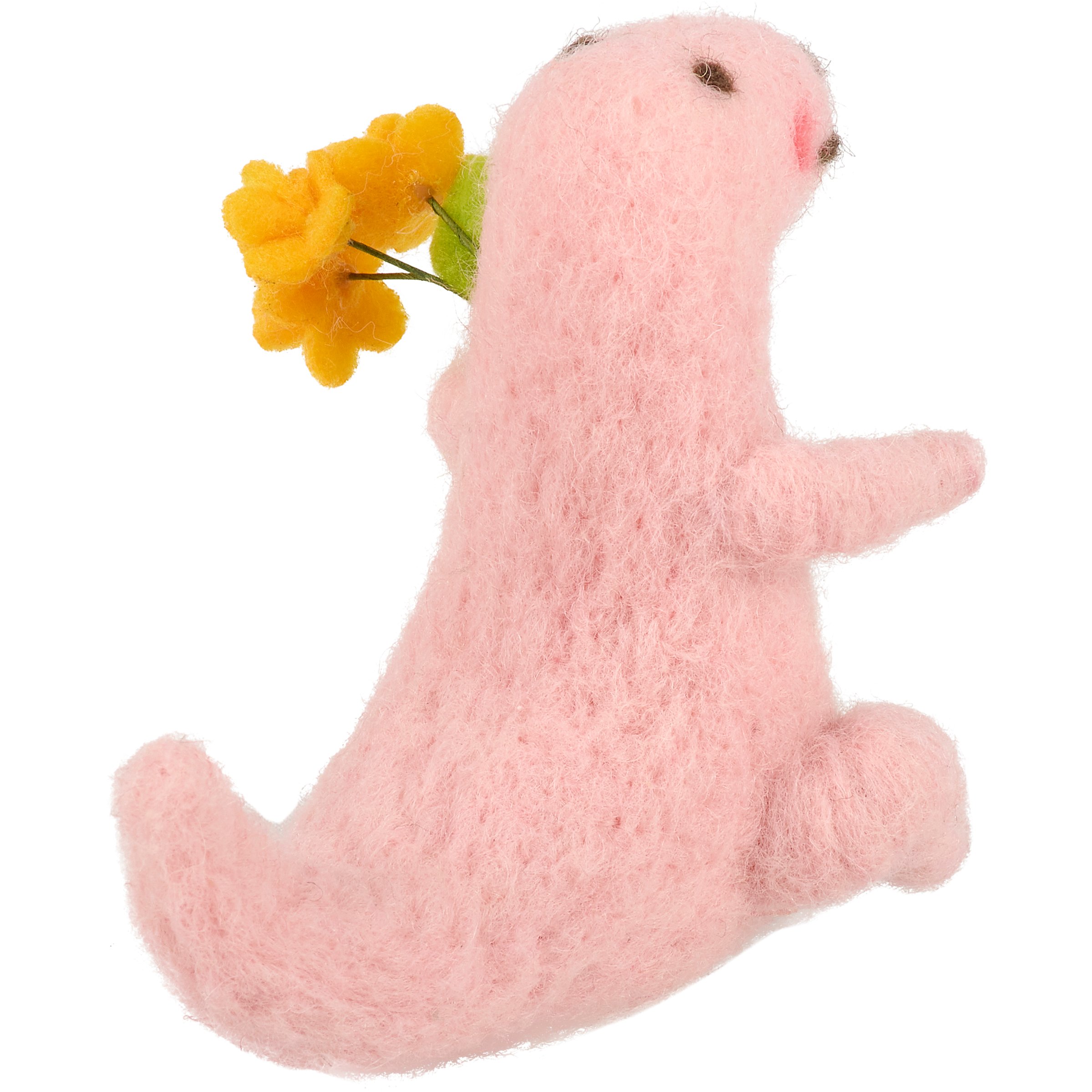A felt critter from our Felt Collection displaying a pastel pink dinosaur perfect for adding dinosaur charm to any seasonal display. Felted dinosaur critter features cute handmade details including yellow felt flowers in its hand. Our Dino With Flowers critter is designed to free-stand on flat surface for display. Contains small parts; this is not a toy. A fun dinosaur-themed home accent that displays well alone or as a collection with other critters.
