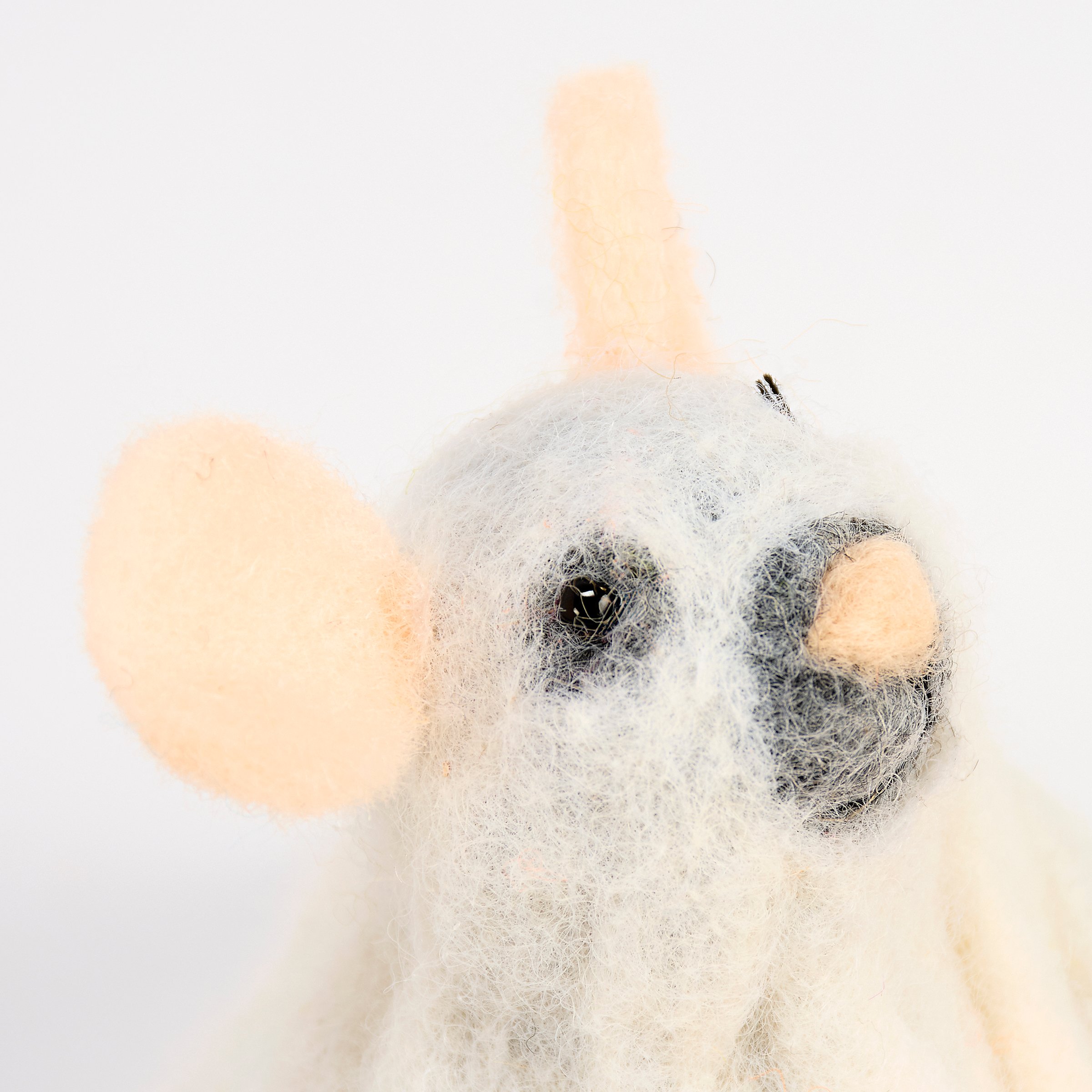 A felt critter from our Halloween Collection displaying a mouse dressed for trick or treating wearing a ghost costume perfect for adding character to any seasonal display. Halloween mouse critter features cute handmade details including felt treat bucket and flowing felt ghost costume. Our Ghost Mouse critter is designed to free-stand on flat surface for display. Contains small parts; this is not a toy. A fun Halloween home accent that displays well alone or as a collection with other critters.