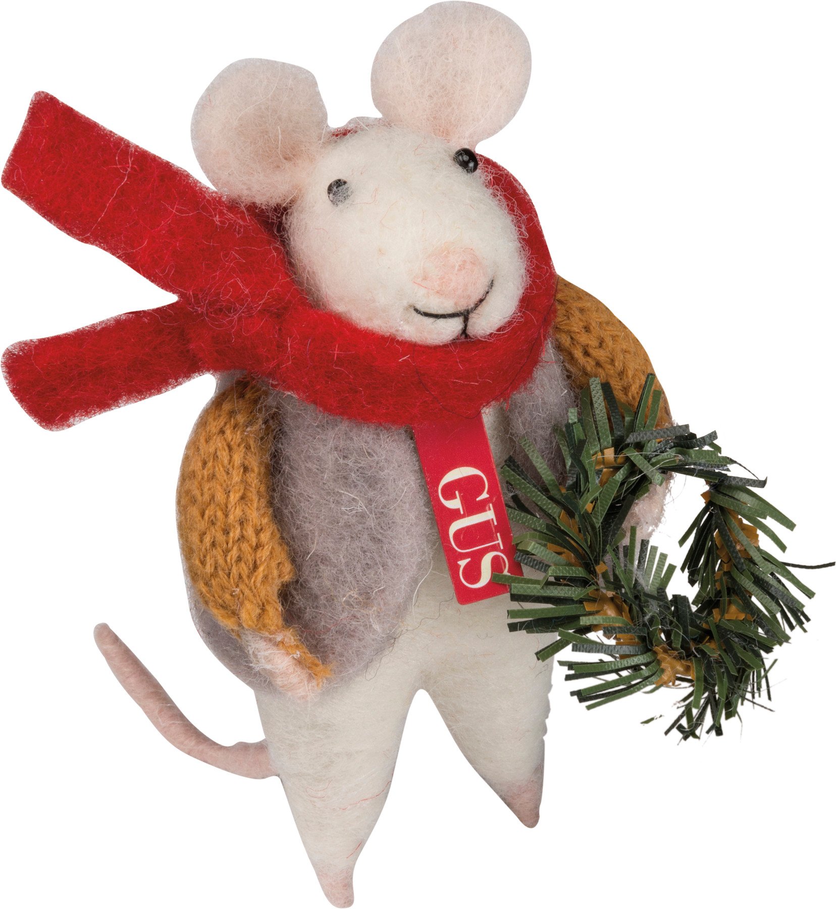 A Christmas-themed felt critter named Gus lending a knit sweater and scarf with a bristled wreath accent and clear filament hanger for easy decorating. Great to display with other critter styles. This is not a toy.