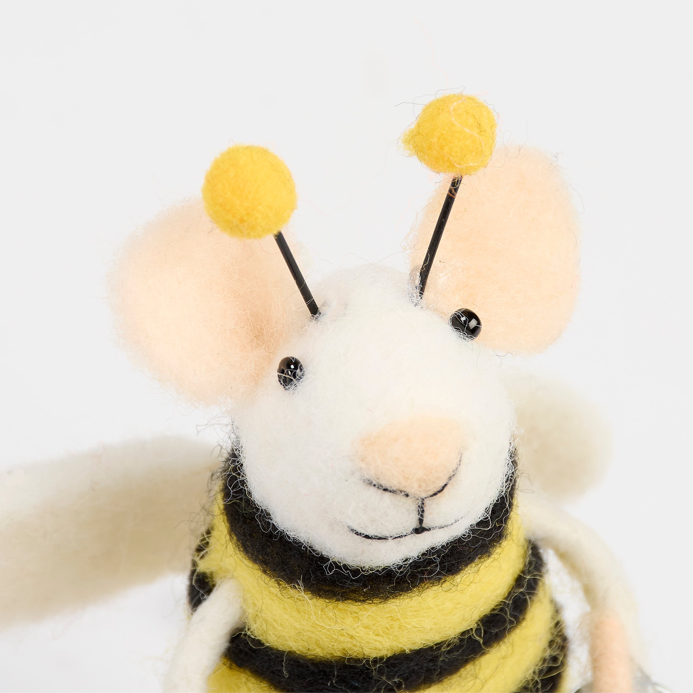 A felt critter from our Halloween Collection displaying a mouse dressed for trick or treating wearing a bee costume perfect for adding character to any seasonal display. Halloween mouse critter features cute handmade details including metal treat bucket and yellow poms on costume antenna. Our Halloween Bee Mouse critter is designed to free-stand on flat surface for display. Contains small parts; this is not a toy. A fun Halloween home accent that displays well alone or as a collection with other critters.