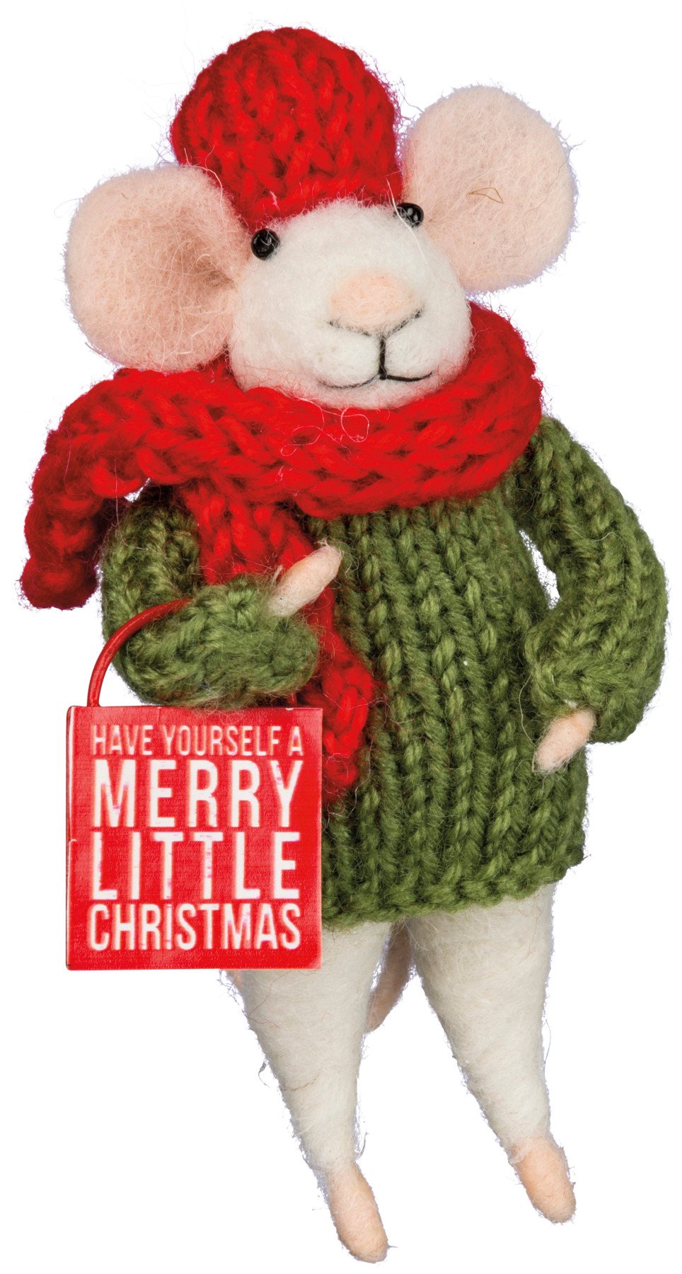 A Christmas-themed felt critter lending a "Have Yourself A Merry Little Christmas" sentiment, knit sweater, hat, and scarf detail, and clear filament hanger for easy decorating. Great to display with other critter styles. This is not a toy.