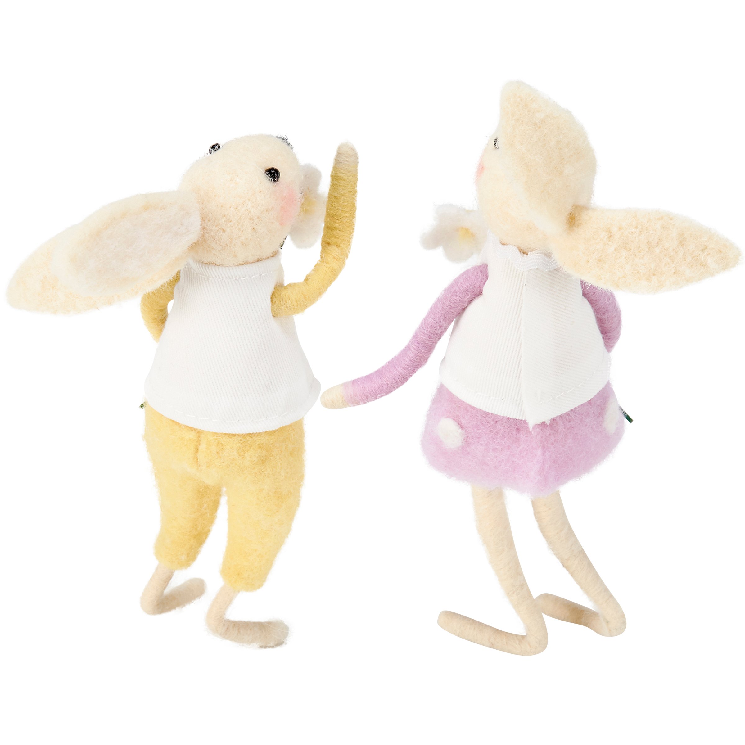 A felt critter set from our Easter & Spring Collection including two rabbits each holding a daisy and wearing spring clothing with handmade details. Rabbit critters feature fun accents such as buttons and fabric clothing. Our Rabbit Couple critter set is designed to hang via attached hanger or free-stand as a set or separately on flat surface for display. A cute set of seasonal home accents to display on their own or as a collection with other critters. Contains small parts; this is not a toy.