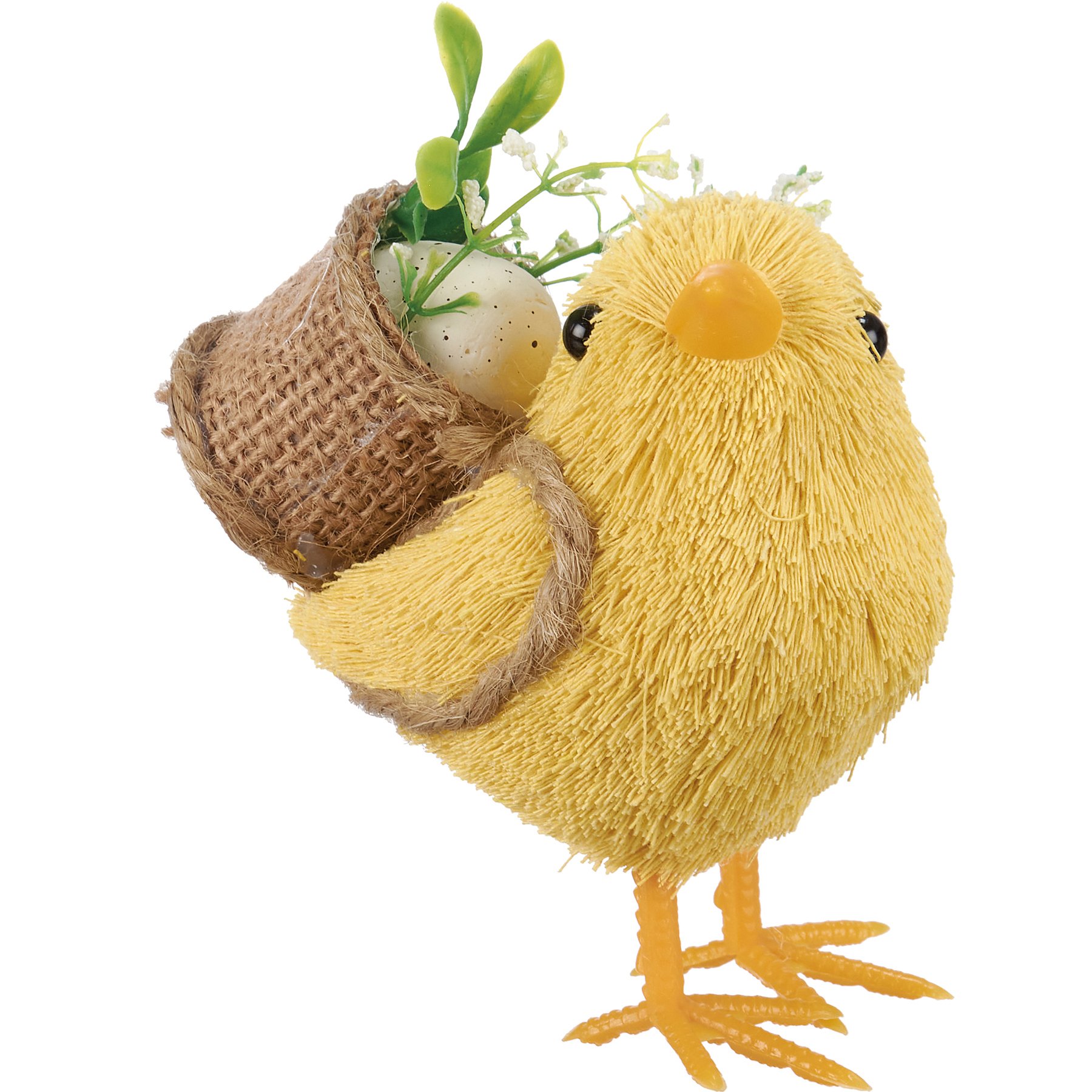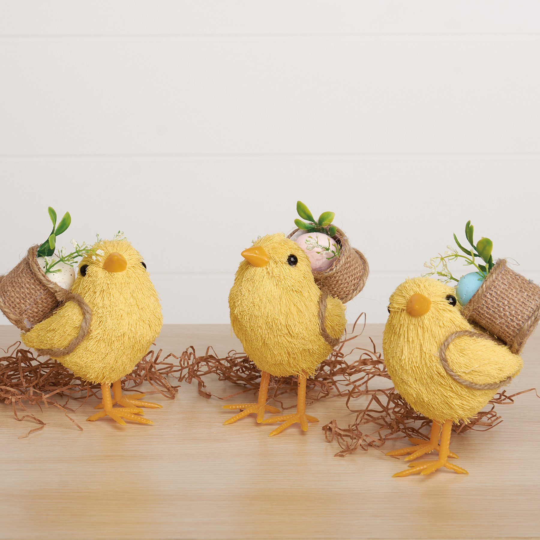 A delightful set of three chicks from our Easter & Spring Collection with cute details that add cheer to any Easter display. Each chick features a bristle texture for the body with a jute basket on their back holding various colored speckled eggs and faux greenery. Designed to free-stand on flat surface. Our Spring Chicks critter set displays well on their own or as a collection with other critters. WARNING: CHOKING HAZARD - Contains small parts. This is not a toy.