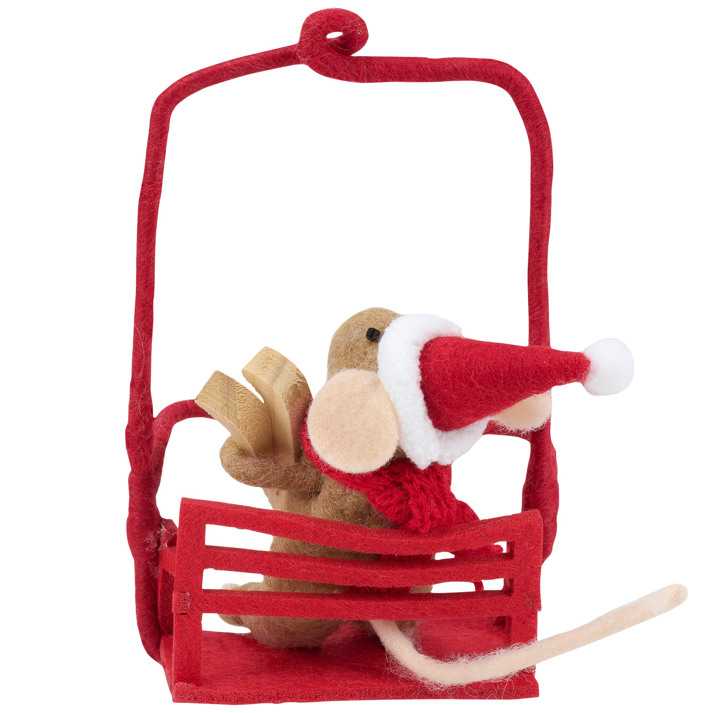 A felt critter from our Christmas Collection displaying happy mouse riding a ski lift that is perfect for adding character to any Christmas display at home or at work. Skier mouse critter features cute handmade details including a knit scarf and wooden skis in its arm. Our Ski Lift Mouse critter is ready to hang for display via the attached hanger. Contains small parts; this is not a toy. A cute ski themed home accent that displays well alone or as a collection with other critters.