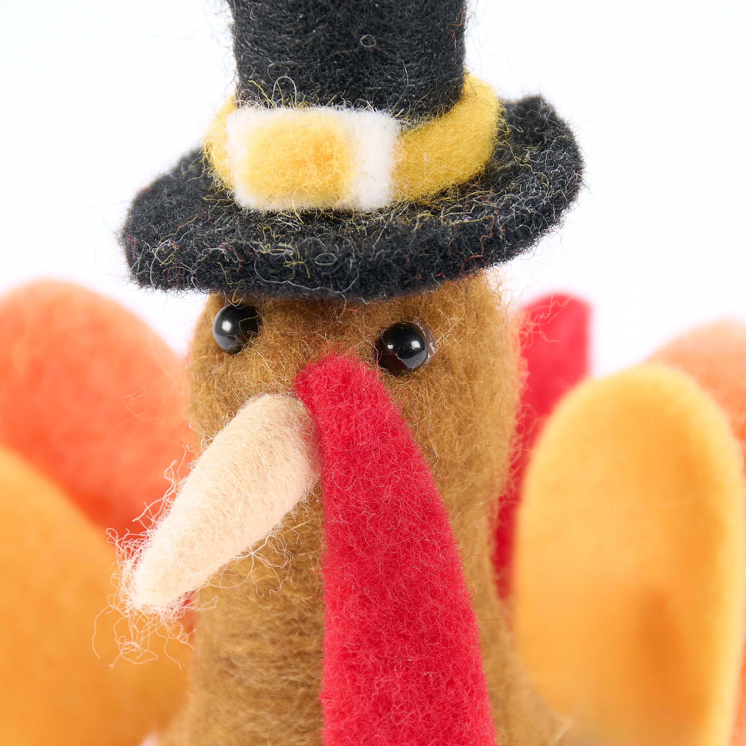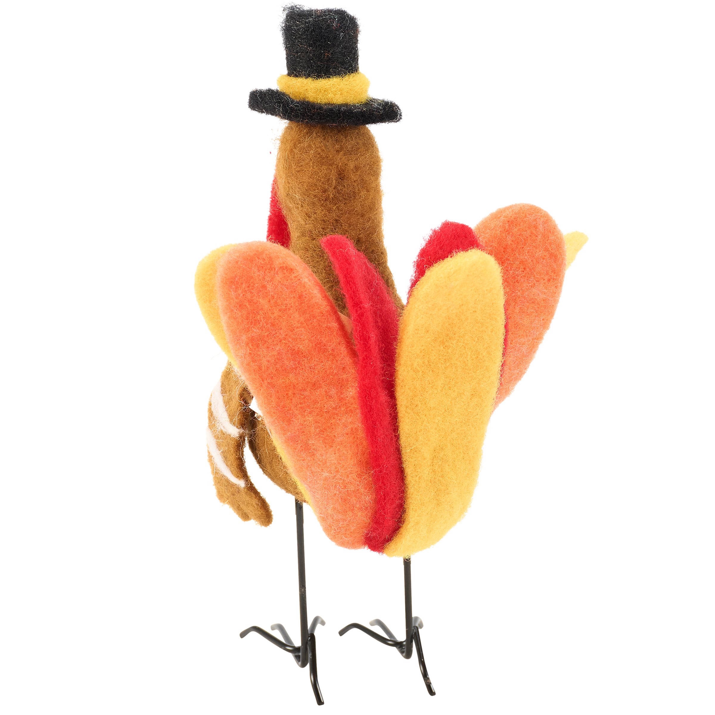 A felt critter from our Fall & Harvest Collection displaying a fun turkey design wearing a pilgrim hat perfect for adding character to any seasonal display. Turkey critter features cute handmade details including wire feet and colorful felt feathers. Our Thanksgiving Turkey critter is designed to free-stand on flat surface for display. Contains small parts; this is not a toy. A fun fall home accent that displays well alone or as a collection with other critters.