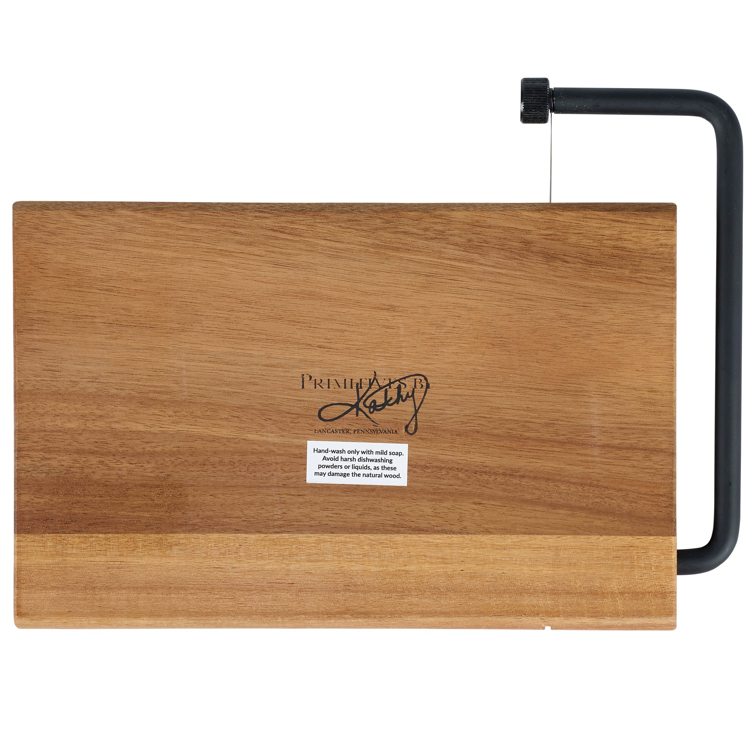 A cheese cutting set featuring a slate cutting board that nests inside of a bamboo tray with metal arm and wire slicer attached for evenly slicing cheese. Bamboo tray and slate cutting board is hand wash only and includes care instructions on the back. Our Cheese Slate cutting board is perfect for everyday kitchen use and coordinates with a variety of home decor styles.