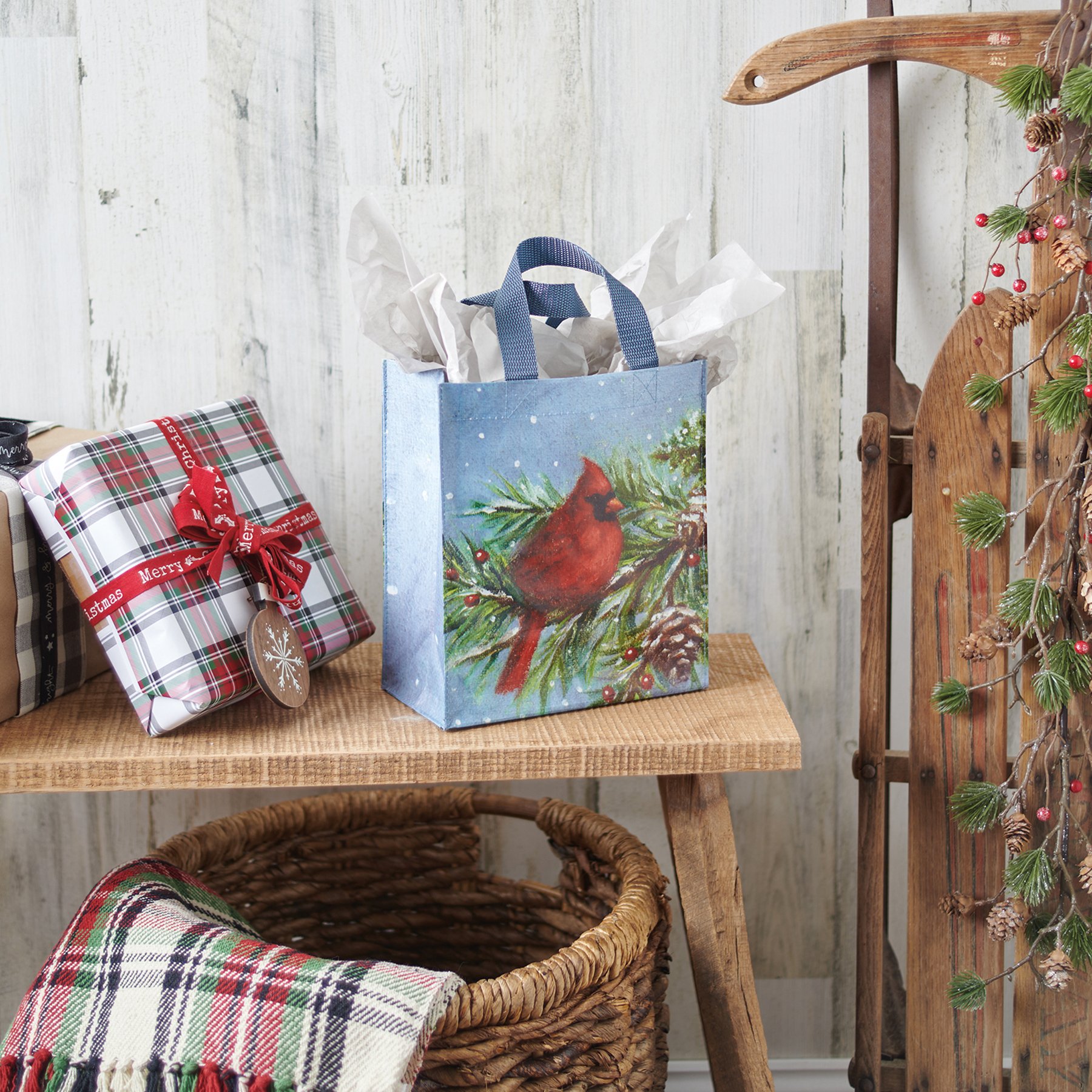 A full color holiday daily tote displaying a double-sided design of a cardinal in a winter woodland. Design is replicated from original artwork painted onto burlap canvas, giving the art a unique depth and texture. Cardinal tote is made from post-consumer material and includes complementing nylon straps. Featured in our Christmas Collection. California Residents see Prop 65 Notice.