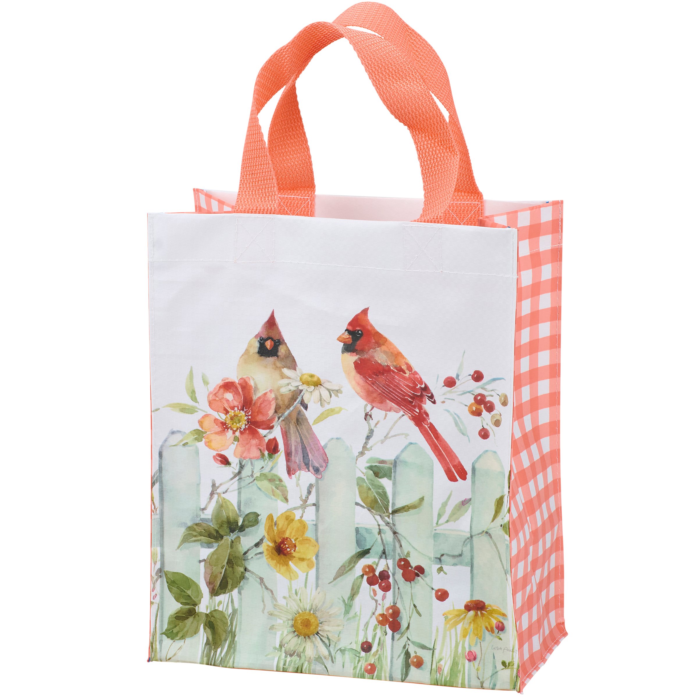 A double-sided daily tote from our Botanical Collection displaying a charming scene of a cardinal couple perched on a fence and summer flowers. Tote gussets feature a coordinating gingham pattern. Everyday cardinals design and side patterns are replicated from original art hand painted in a delicate watercolor style. Our Everyday Cardinals tote is made from eco-friendly post-consumer material and includes complementing pink nylon straps. Everyday tote folds flat for compact storage. A cardinal themed tote perfect for an everyday accessory or for reusable gift wrapping.