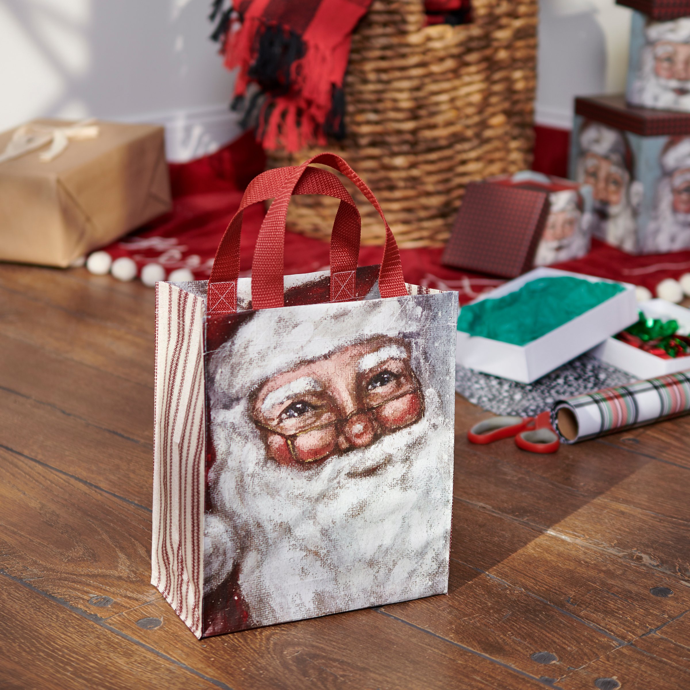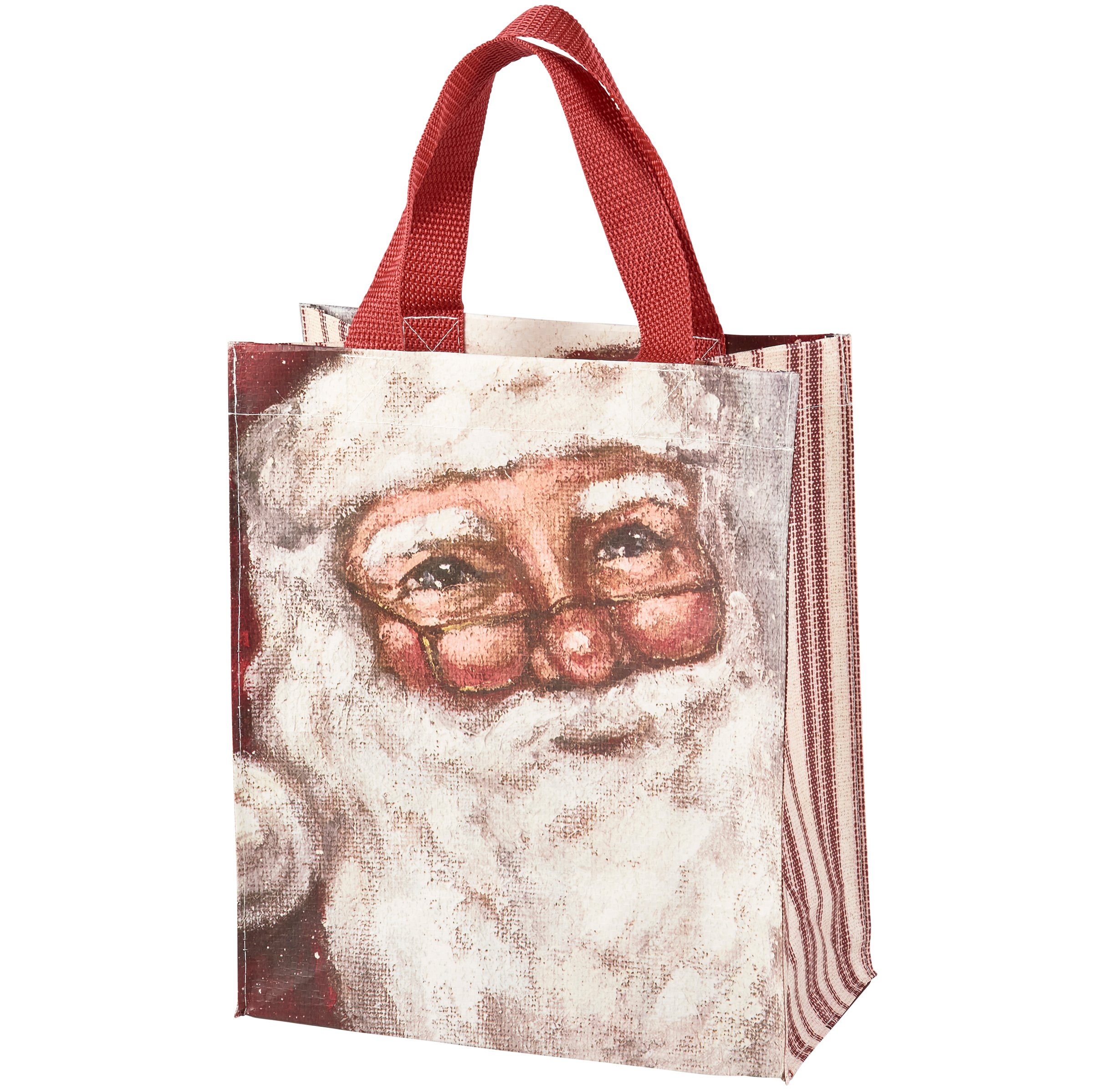 A double-sided daily tote from our Christmas Collection displaying a merry Santa design replicated from original artwork painted onto burlap canvas, giving the art a unique depth and texture. Gussets feature a coordinating red and white stripe pattern in a rustic style. Our Merry Santa daily tote is made from eco-friendly post-consumer material and includes complementing red nylon straps. Seasonal tote folds flat for compact storage. A Christmas-themed tote perfect for a seasonal accessory or great for reusable gift wrapping.