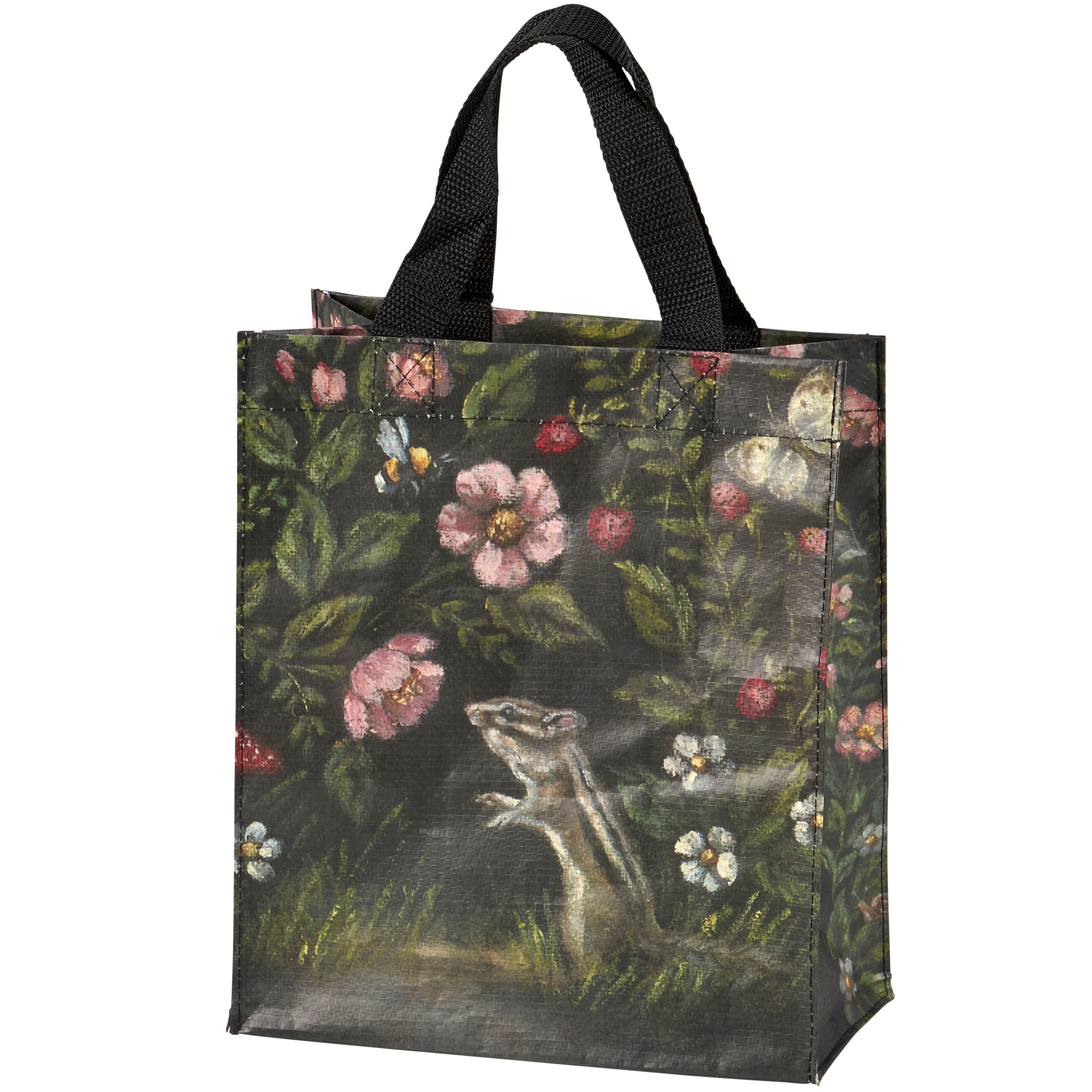 A double-sided daily tote from our Easter & Spring Collection displaying a hand painted design of a mouse and a chipmunk surrounded by spring flowers in a moody color palette. Design is replicated from original artwork painted onto burlap canvas, giving the art a unique depth and texture. Our Mouse And Chipmunk daily tote is made from eco-friendly post-consumer material and includes complementing black nylon straps. Tote folds flat for convenient storage. A charming spring-themed accessory perfect for everyday use.
